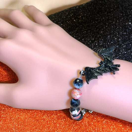 Gothic Bat Black & Orange Agate Silver Tone Handmade Bracelet