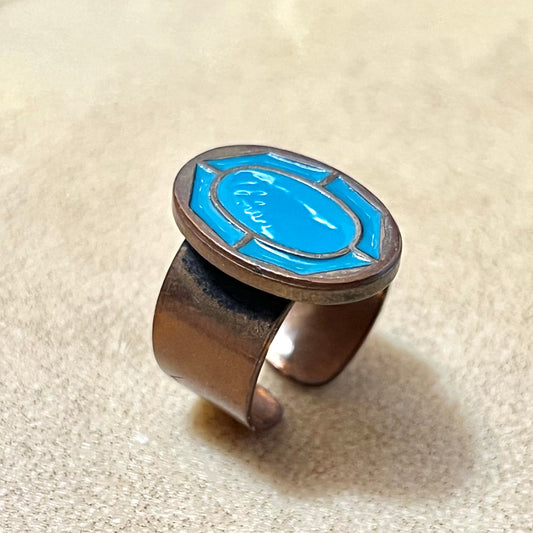 Solid Copper Vintage Ring with Turquoise Color Enamel Adjustable Size 5.5