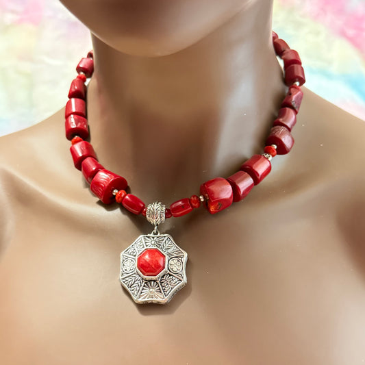 Barse Chunky Red Coral & Silver Tone Necklace - Vintage