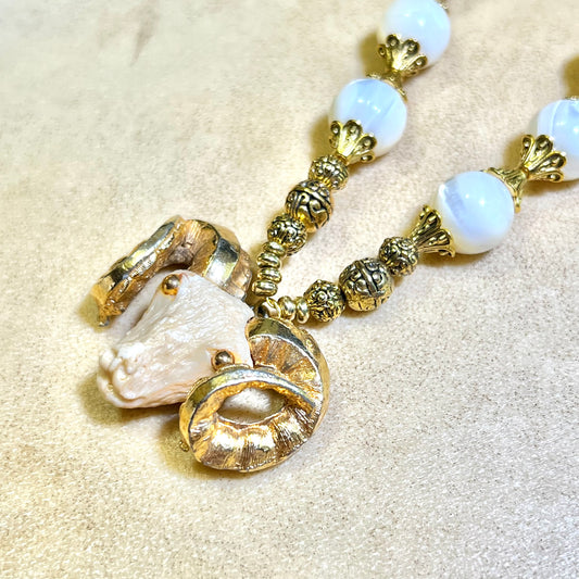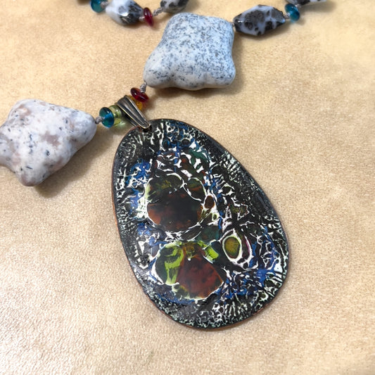 Artisan Handmade Agate & Stone Necklace with Enameled Metal Pendant