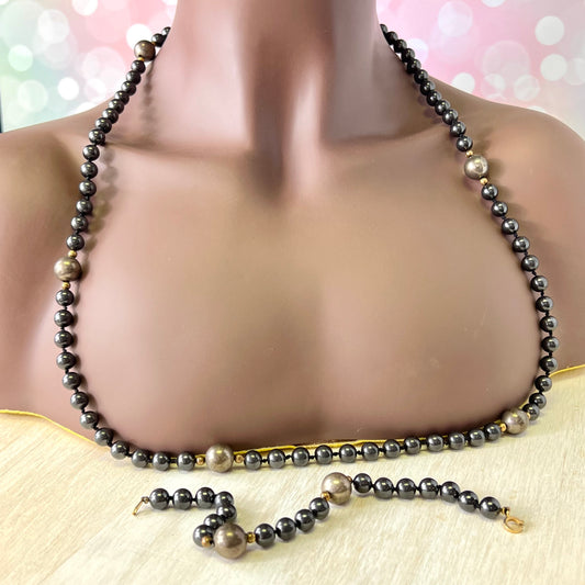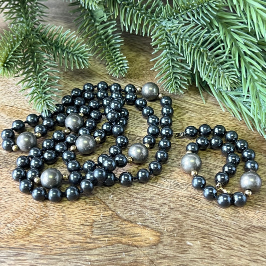 Vintage Hematite and Pyrite Black Hand Knotted Jewelry Set - Necklace and Bracelet