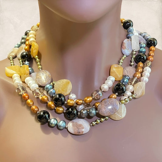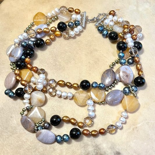 Vintage Colorful Pearl & Agate Gemstone Beaded Necklace with Sterling Silver Clasp
