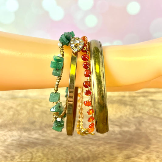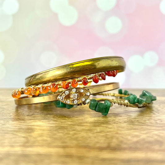 Vintage Bracelet Stack of 4 Gold Tone Bangles including Green Aventurine, Carnelian, and Evil Eye