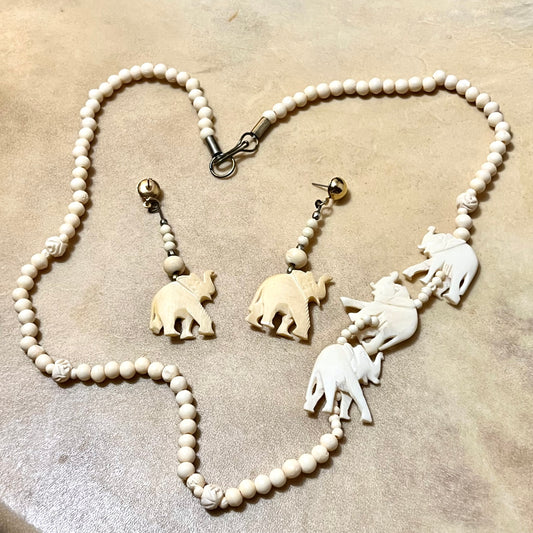 Vintage Bovine Bone Elephant Carved Necklace & Earrings Set