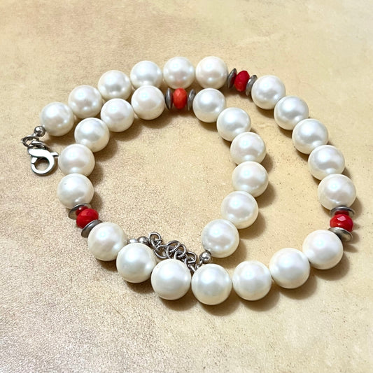 Vintage Faux Pearl Sterling Silver Necklace & Earrings Set with Red Accents