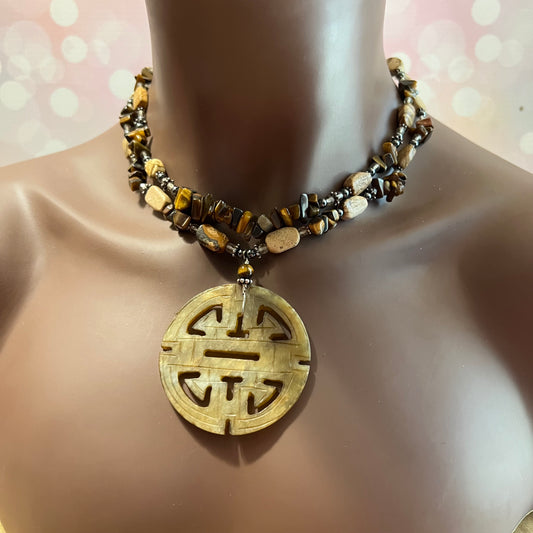 Vintage Chinese Tigers Eye & Picture Jasper Crystal Necklace