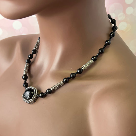 Black Stone Vintage Sterling Silver Beaded Necklace with Heart Pendant