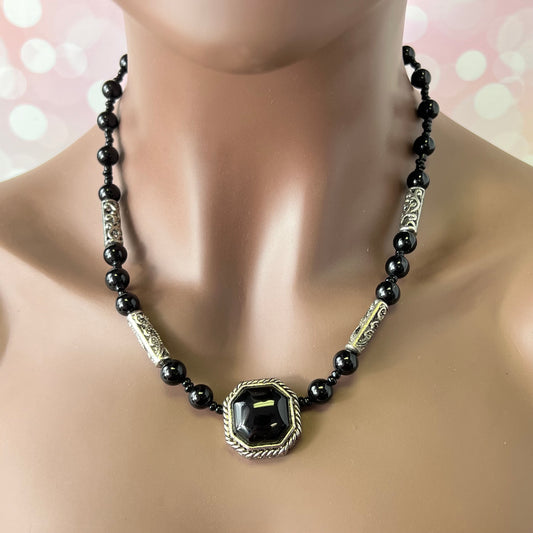 Black Obsidian Pendant Beaded Silver Tone Vintage Necklace