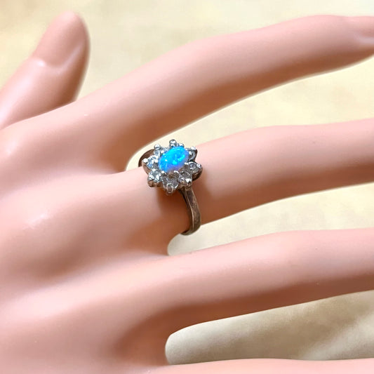 Blue Opal & Clear Rhinestone Encrusted Sterling Silver Ring Size 5