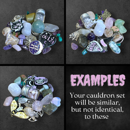 Mini Cauldron Stuffed with Tumbled Crystals & Witchy Halloween Goodies