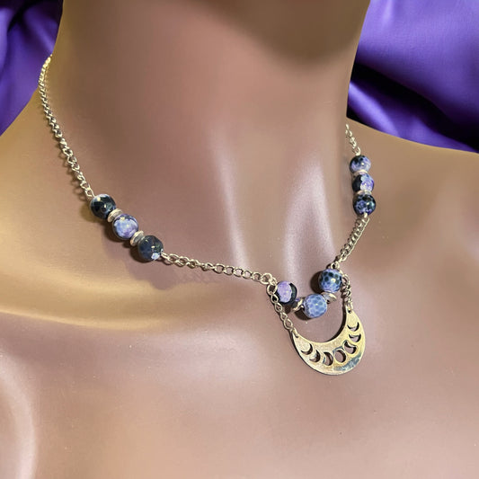 Witchy Crescent Moon Phase Black & Purple Agate Silver Tone Handmade Necklace