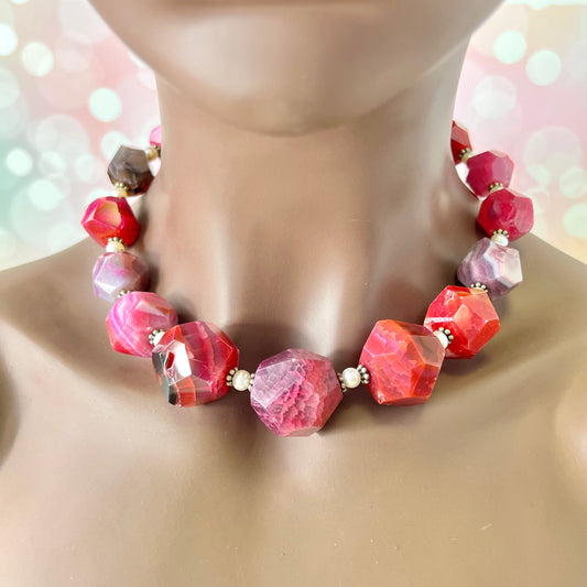 Vintage Magenta Dyed Agate Beaded Necklace with Sterling Silver Clasp by Lucoral