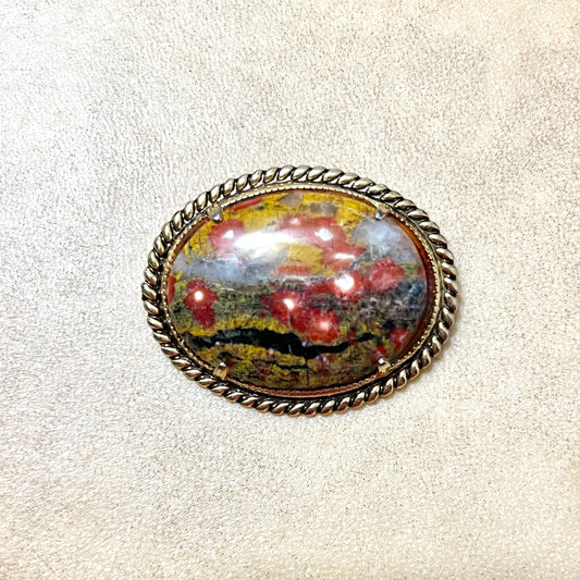 Vintage Red & Yellow Jasper Oval Cabochon with Gold Tone Bezel