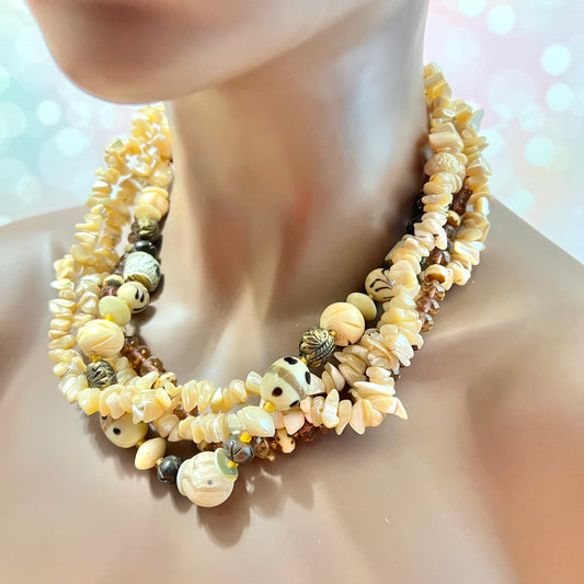 Mother of Pearl, Bone, & Brass Vintage Beaded Choker Necklace
