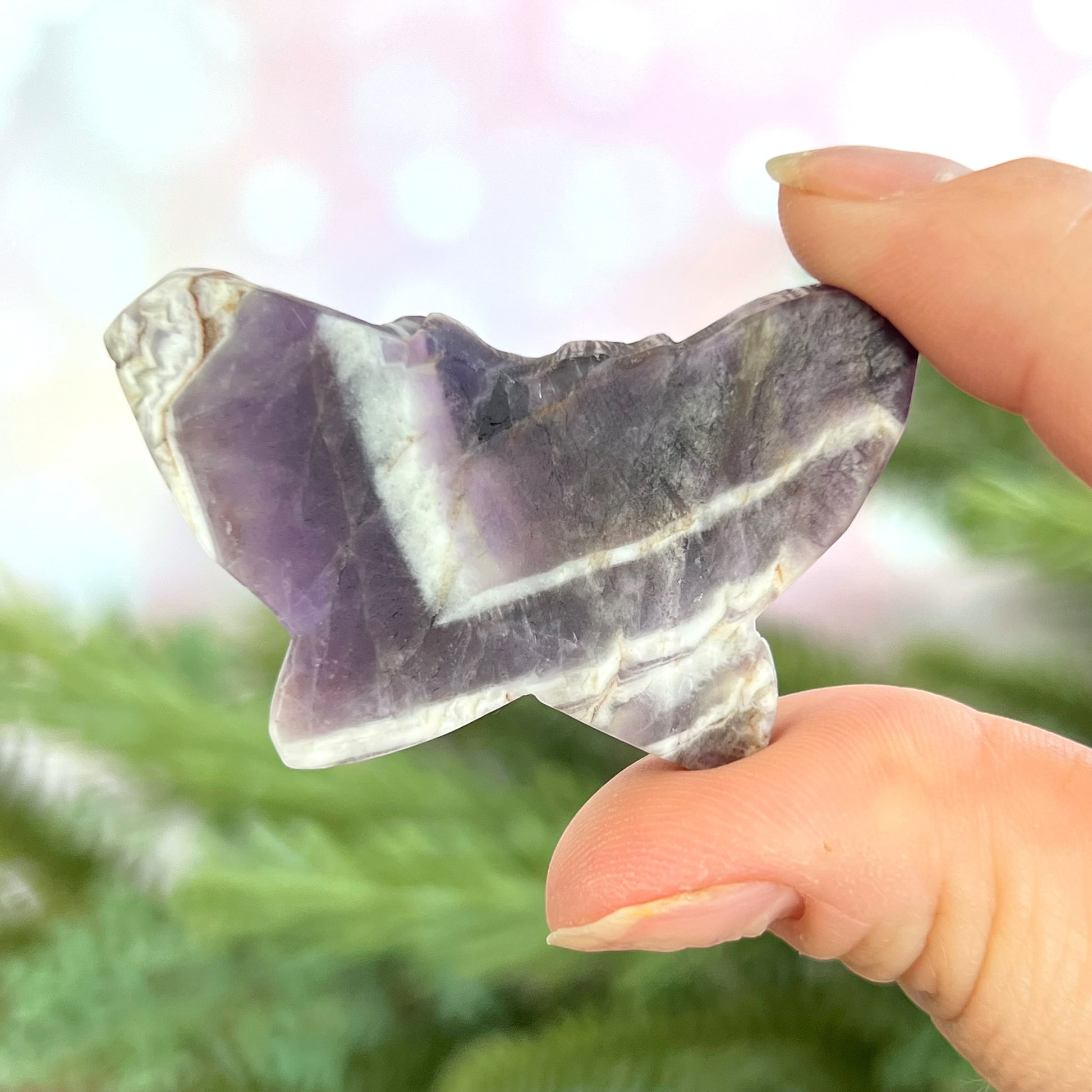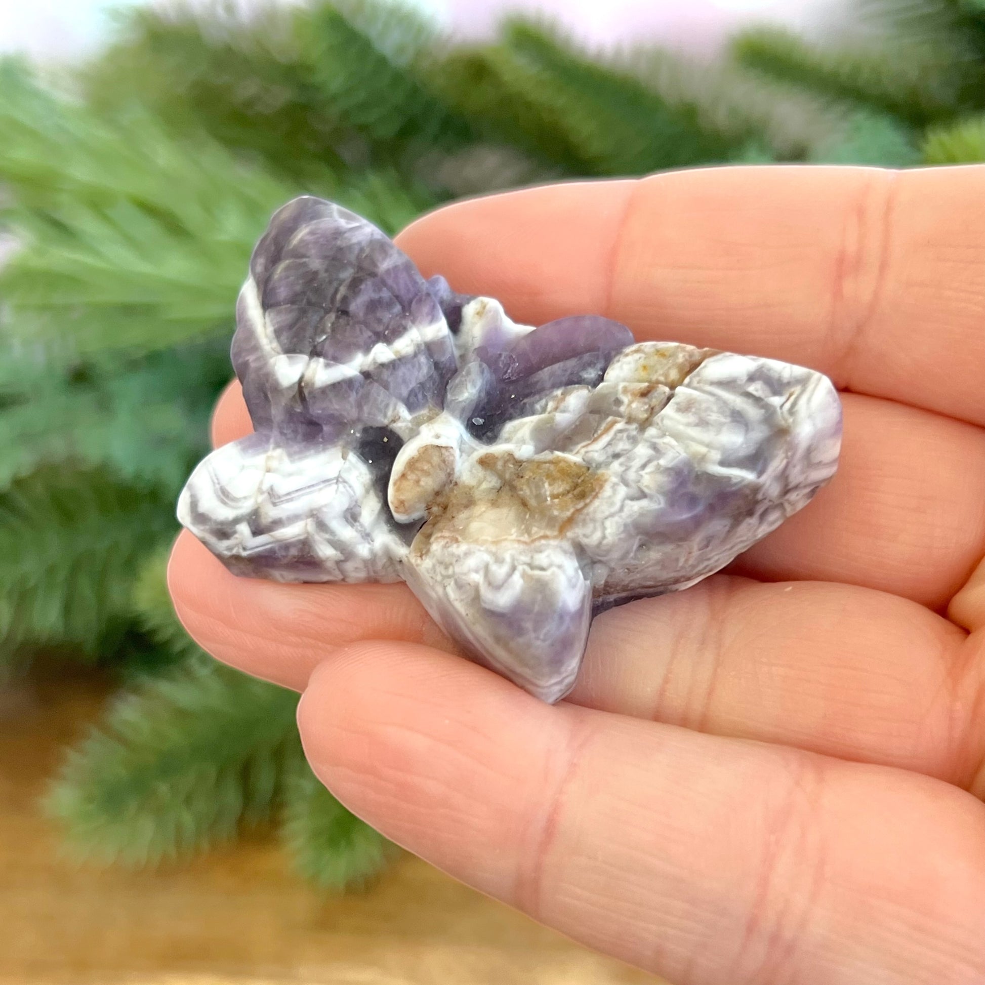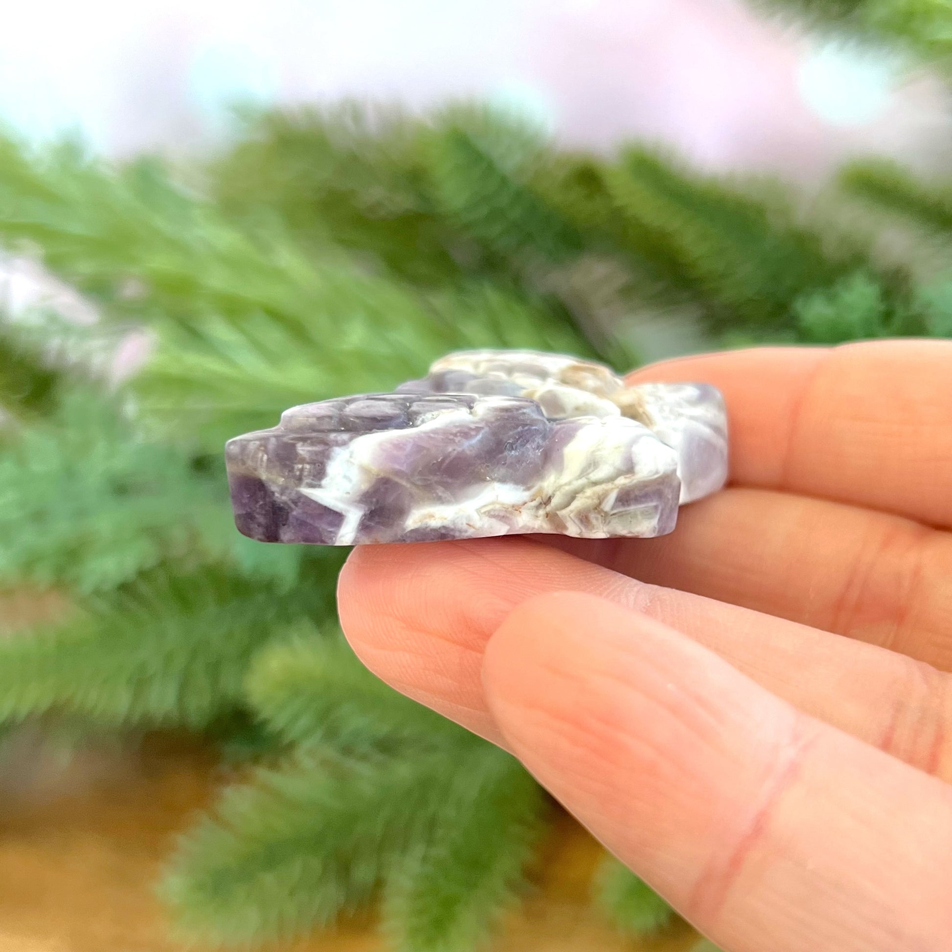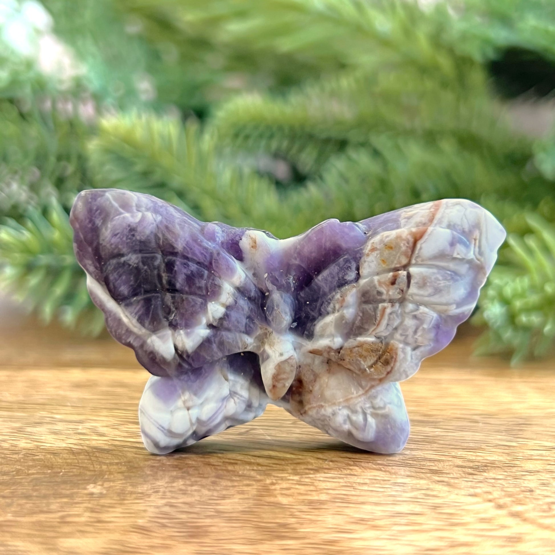 Enhance your spiritual practices with this beautiful Amethyst carved stone cabochon. This crystal features a detailed butterfly, half deep purple, and half gray.