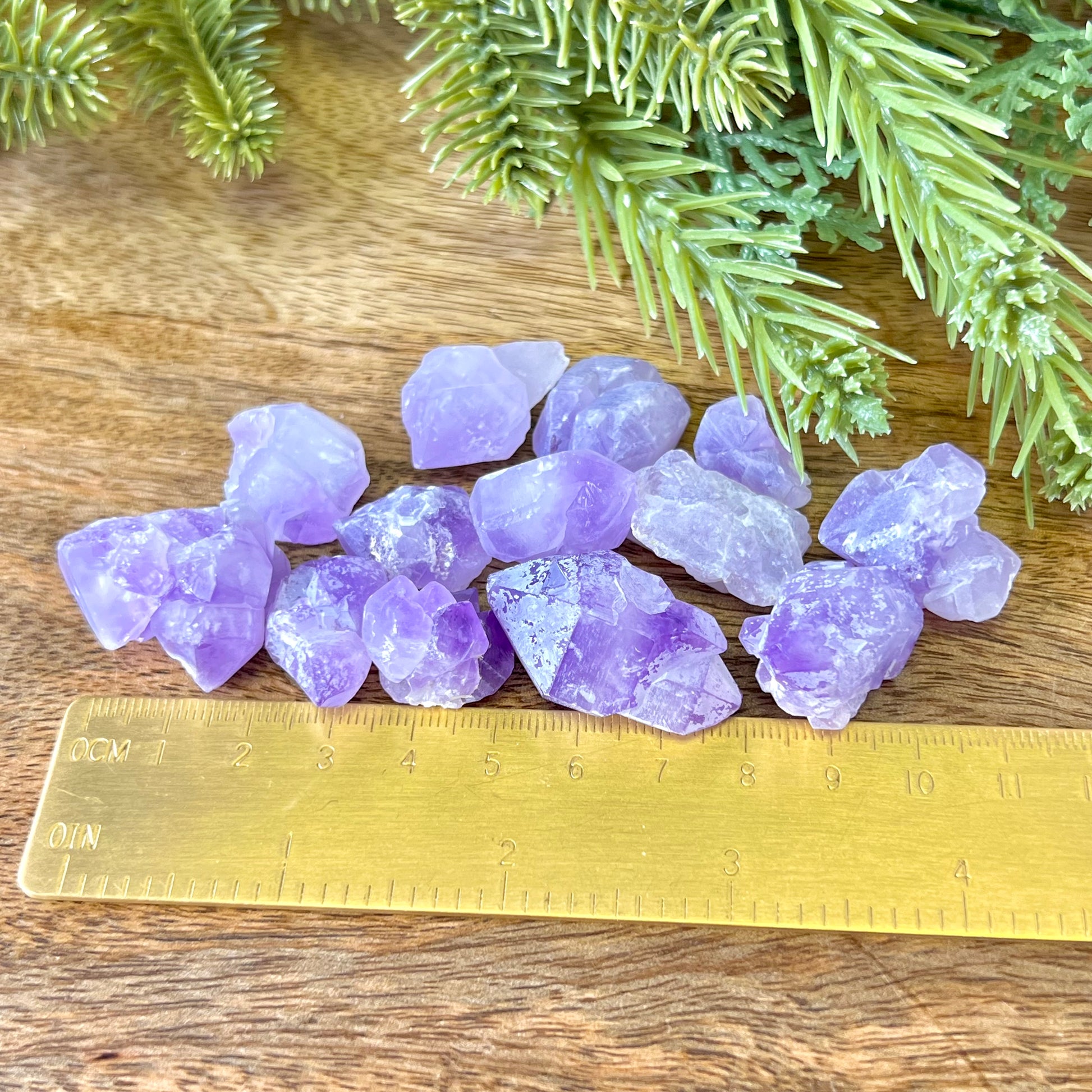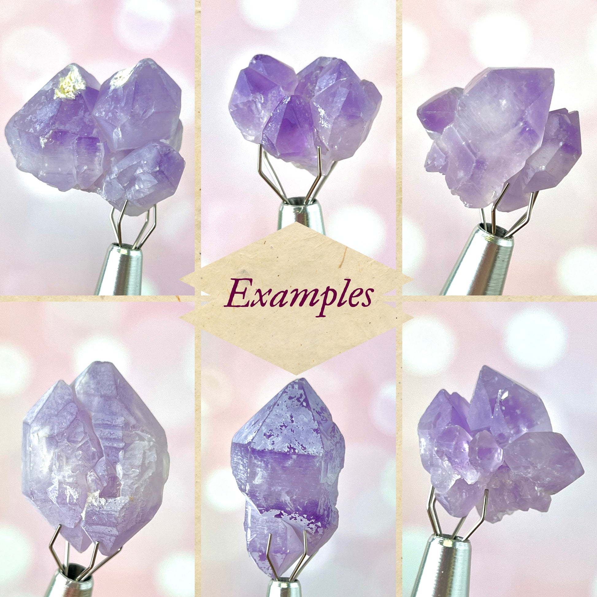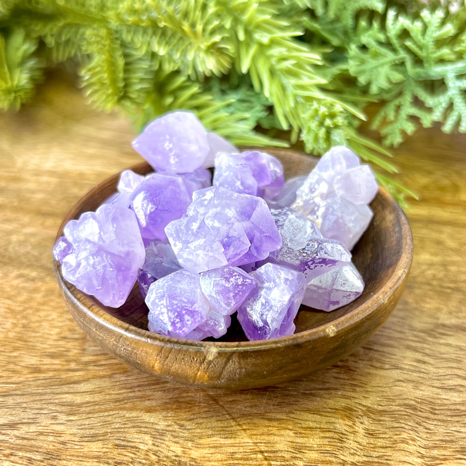 Enhance your spiritual practices with this natural rough Amethyst flower specimen. These crystals have naturally grown into mini, self-contained clusters. Some have many points, while others only have one. They're a light, opaque shade of purple.