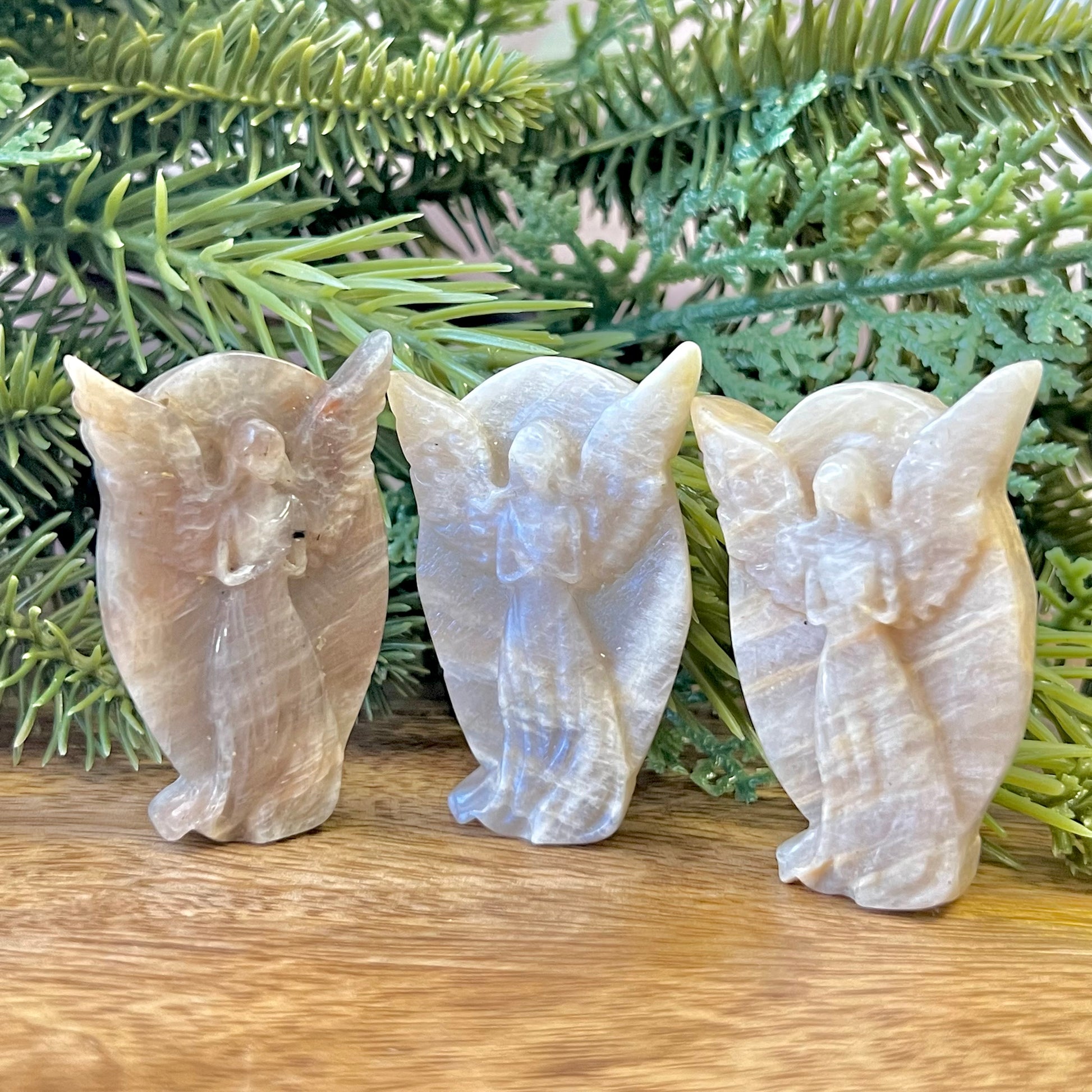 Enhance your spiritual practices with this beautiful Sunstone in Moonstone Angel carved stone cabochon. This crystal combination is primarily white, and sometimes will have orange and/or blue flashes. You may see it called Belomorite, based on its geographical origin.