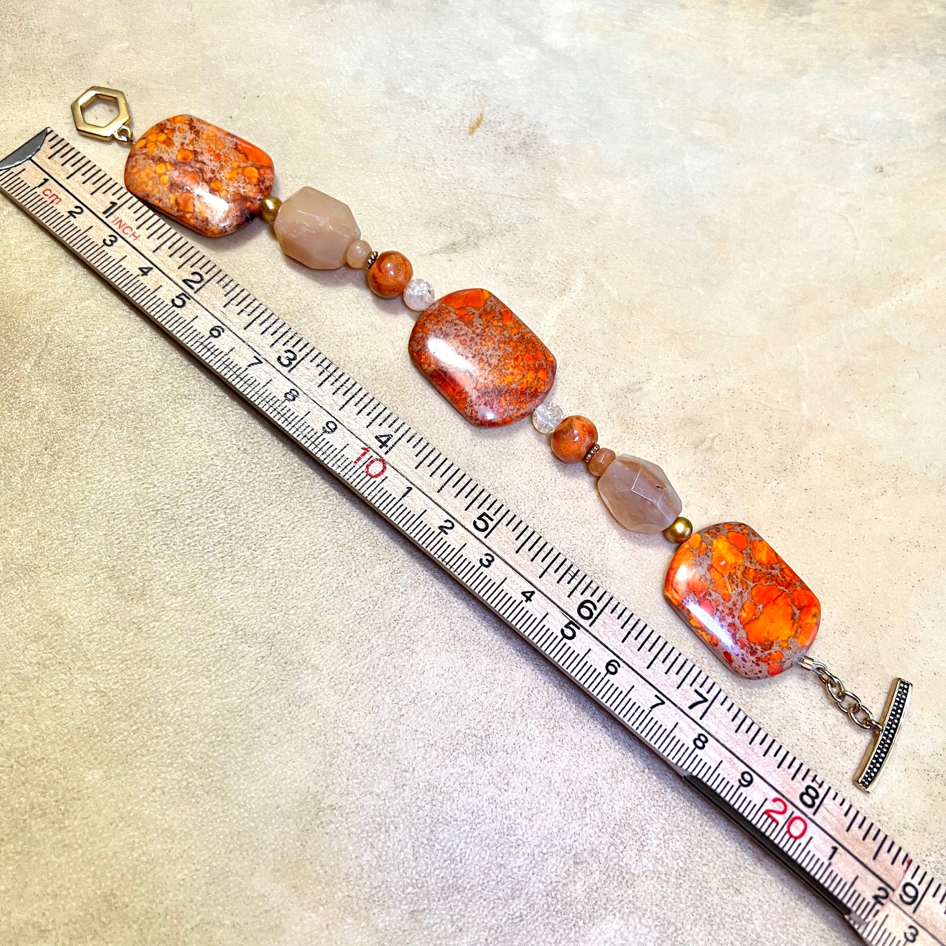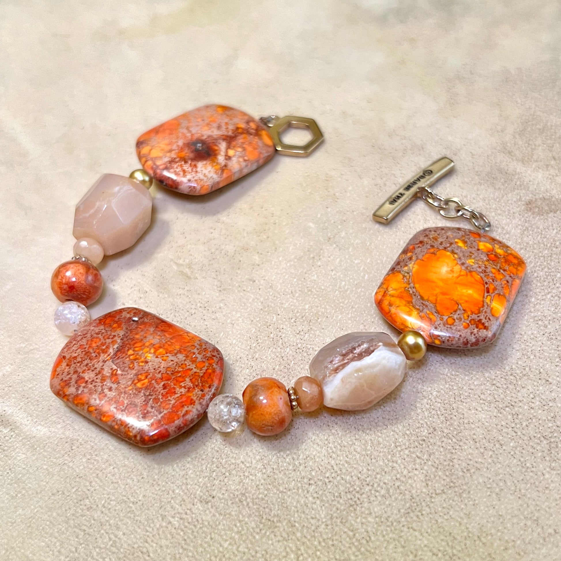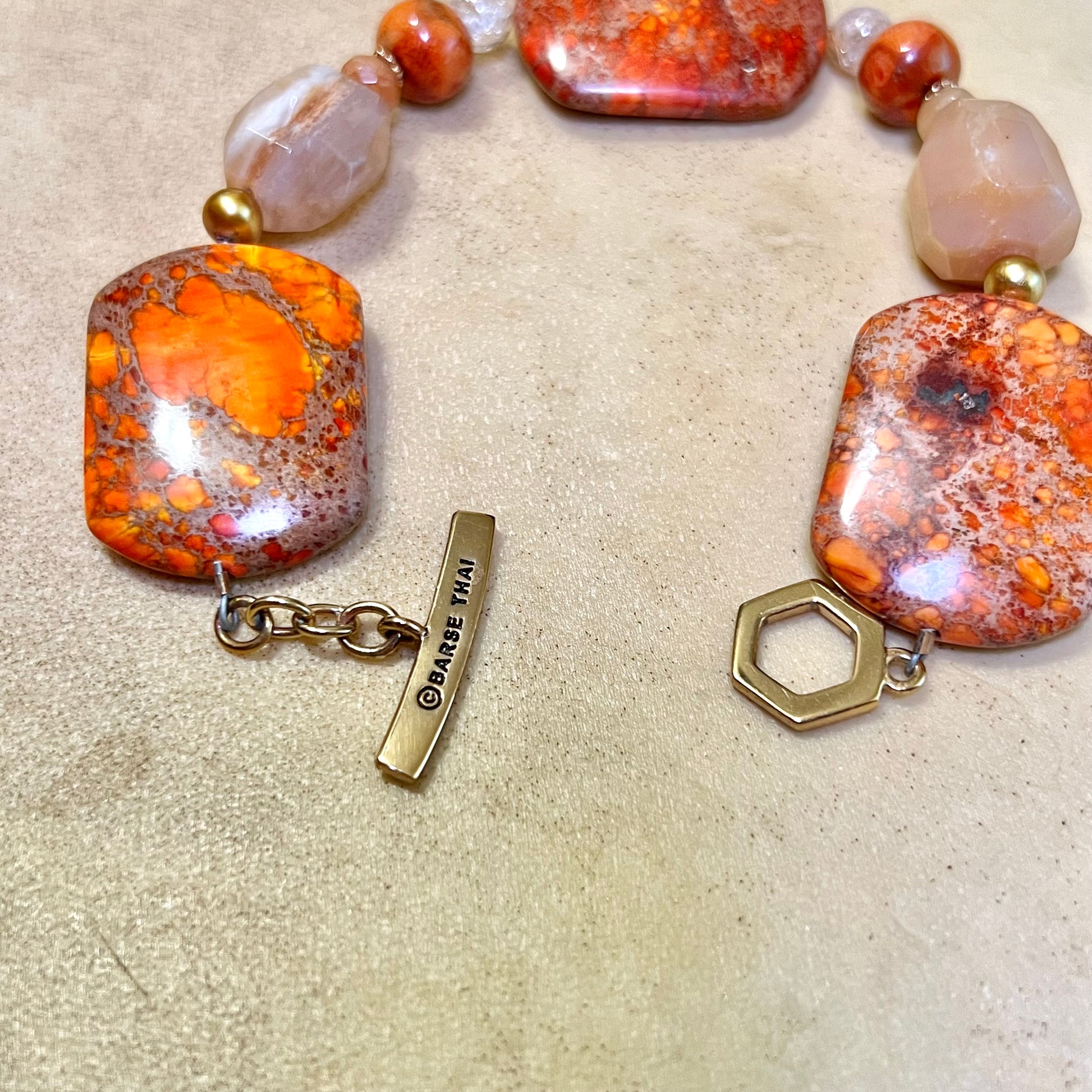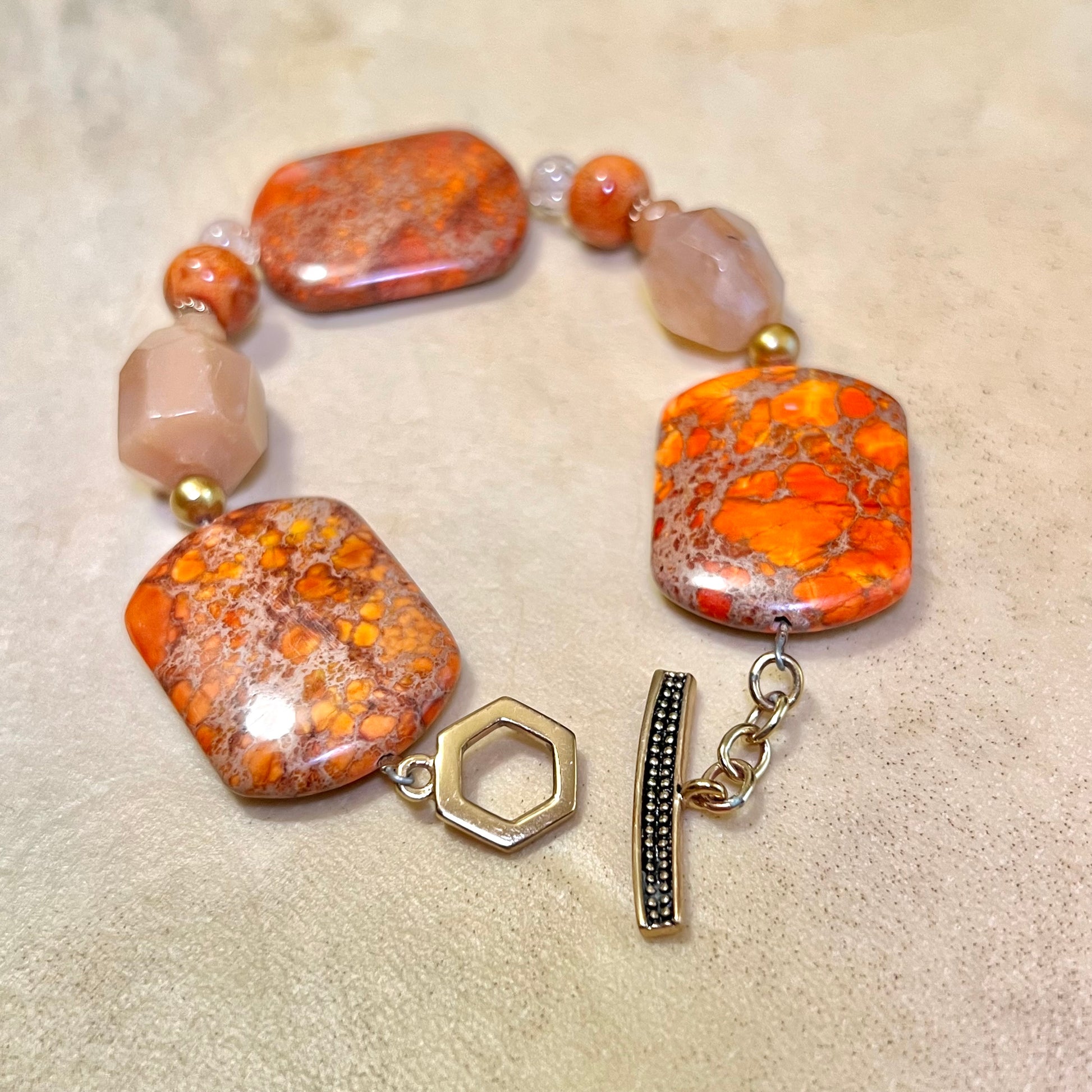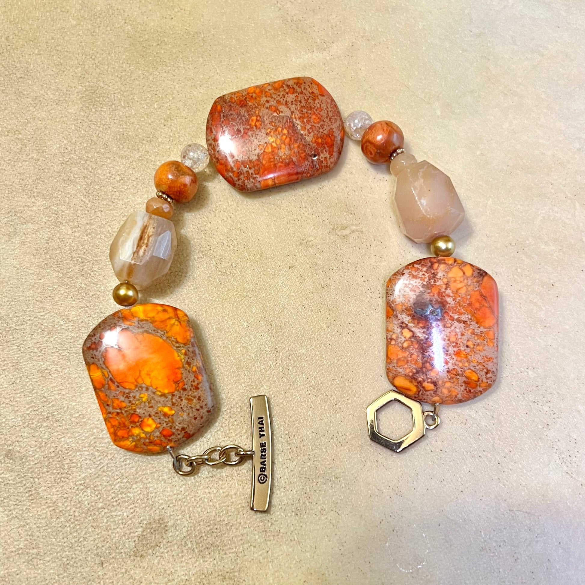 Express yourself with unique vintage jewelry! This gorgeous bracelet by Barse features Large, dyed orange Sea Sediment Jasper beads and Agate. Very striking and in very good used condition.