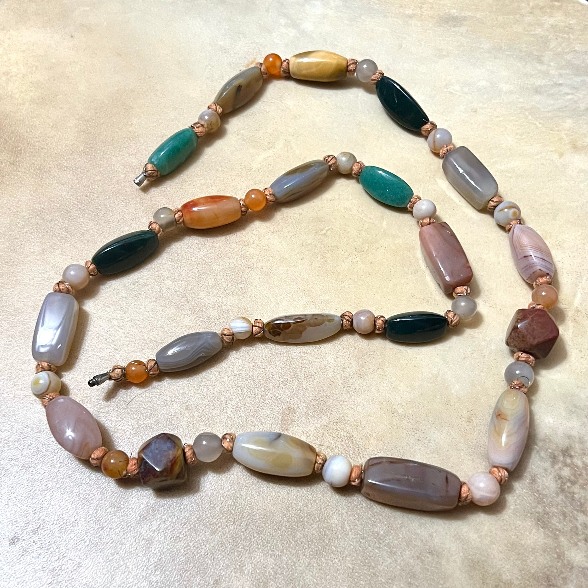 This set of Beggars Beads is from the 1960s. Beautiful array of colorful stones, mostly Agates with some Aventurine. Fabric spacer beads