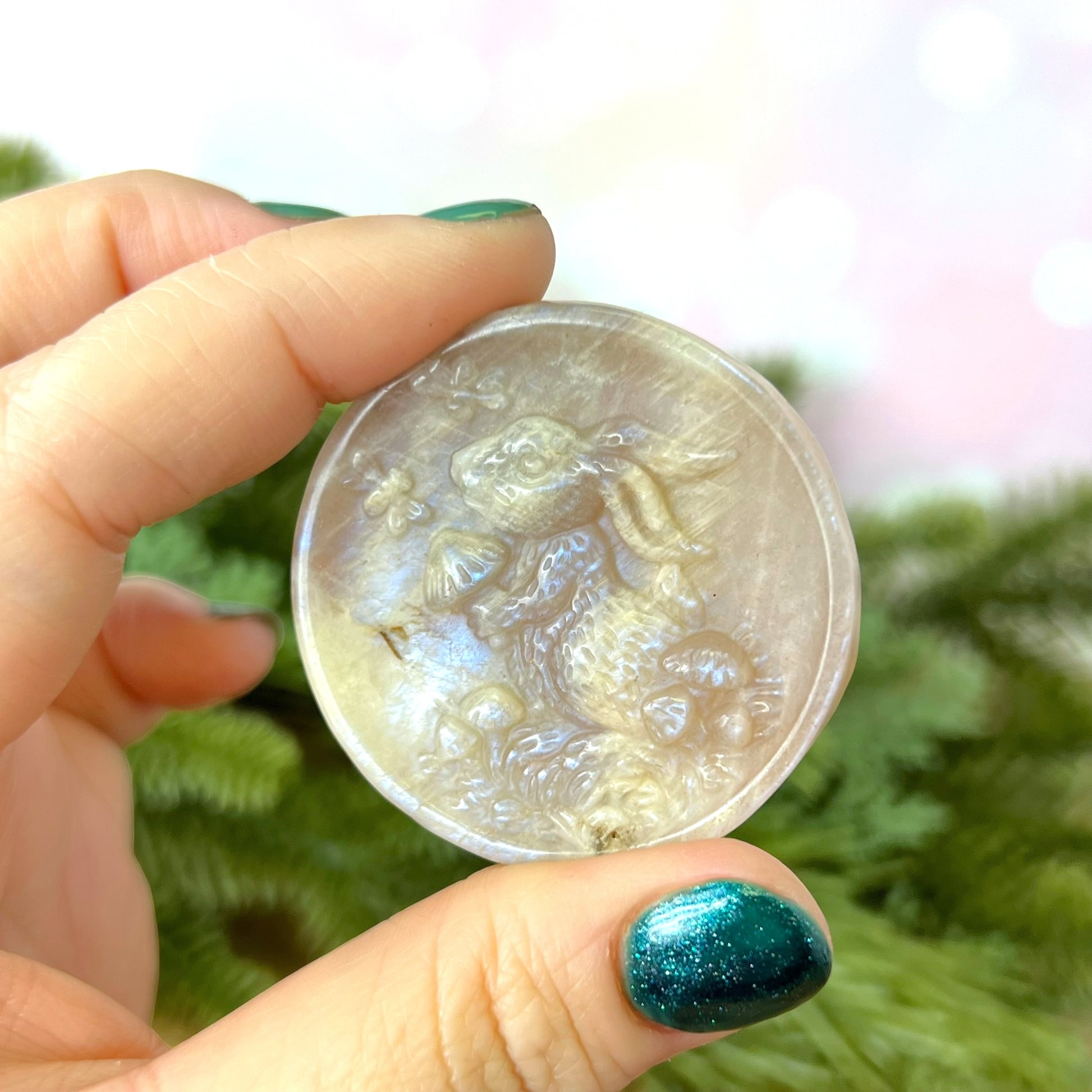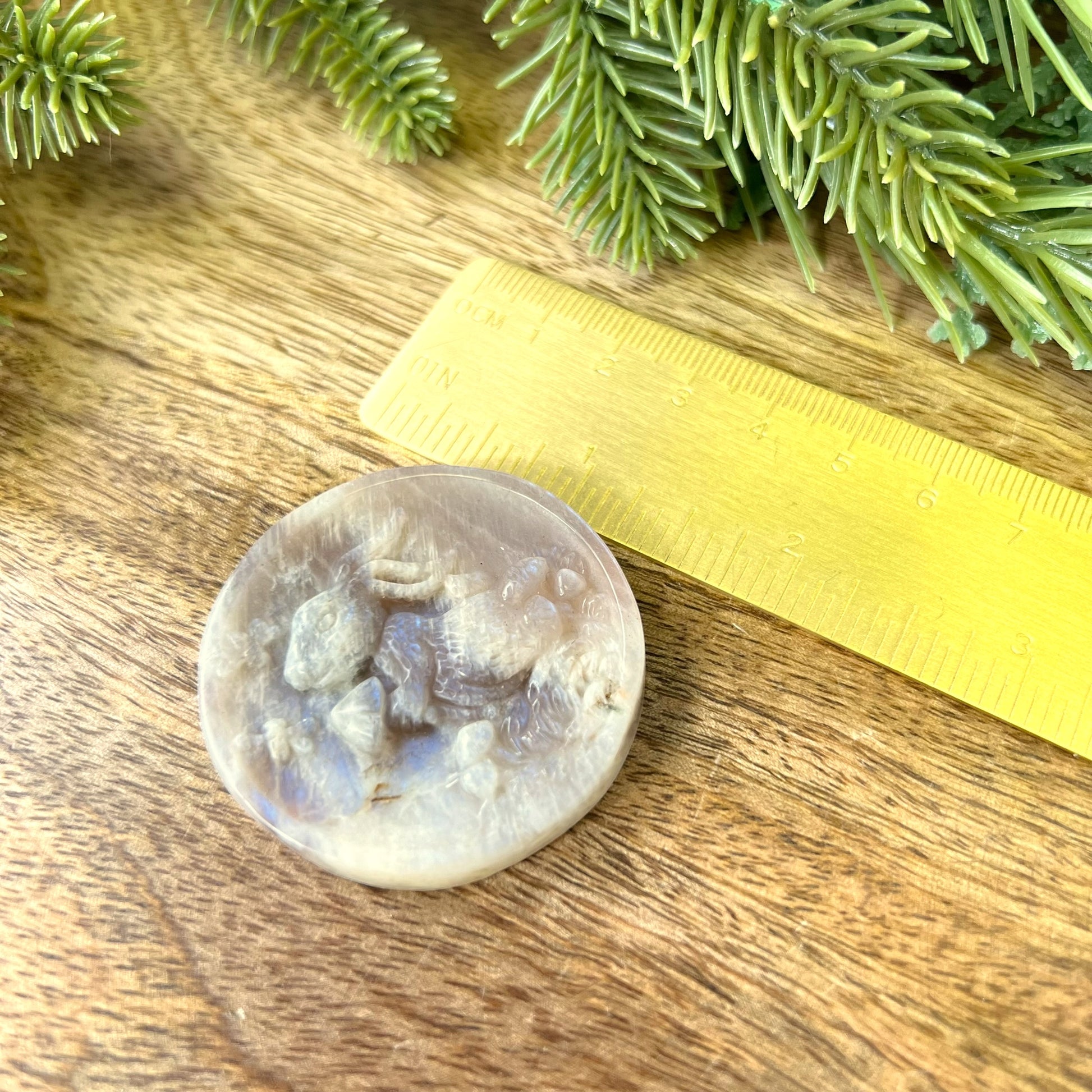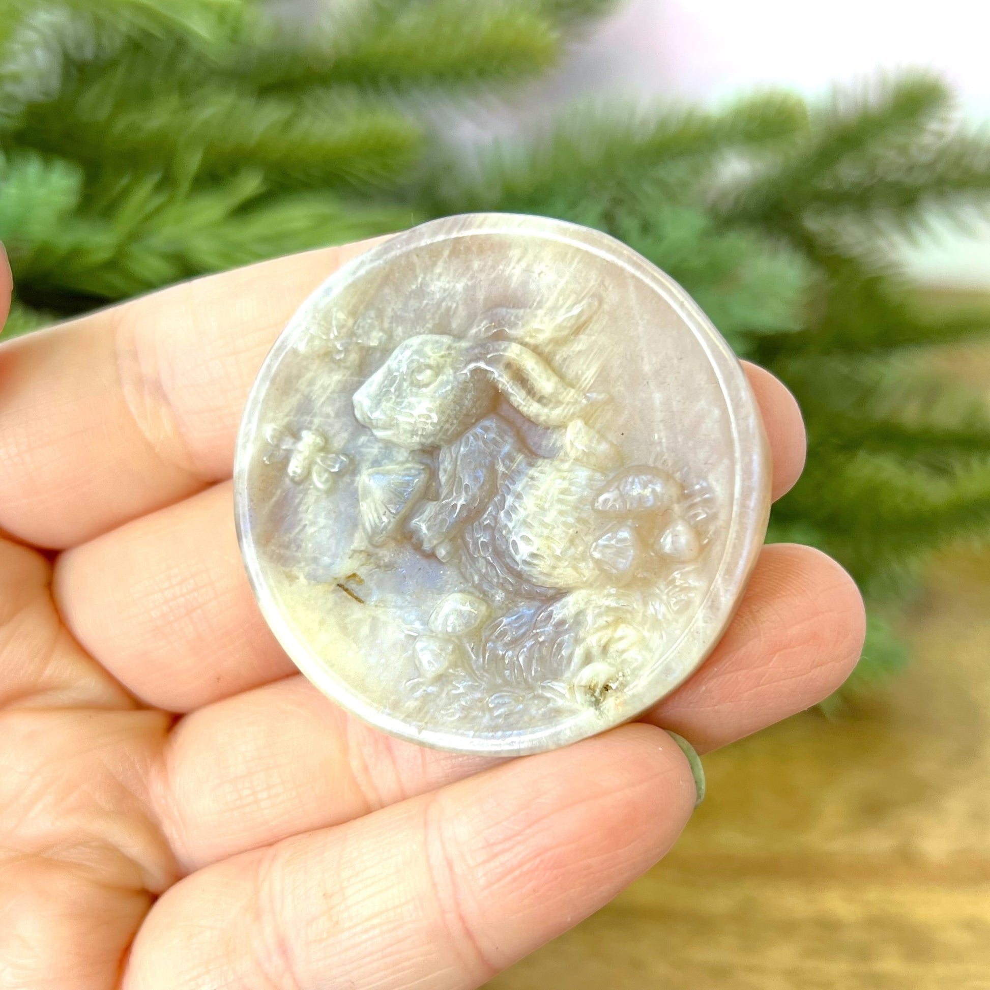 Enhance your spiritual practices with this beautiful Sunstone in Moonstone (Belomorite) carved stone cabochon. This crystal features a detailed bunny on a disc. Rabbits are the perfect animal companions when you want to usher in fertility into your life. This can be literal, but also means an abundance of ideas, projects, creativity, and prosperity.