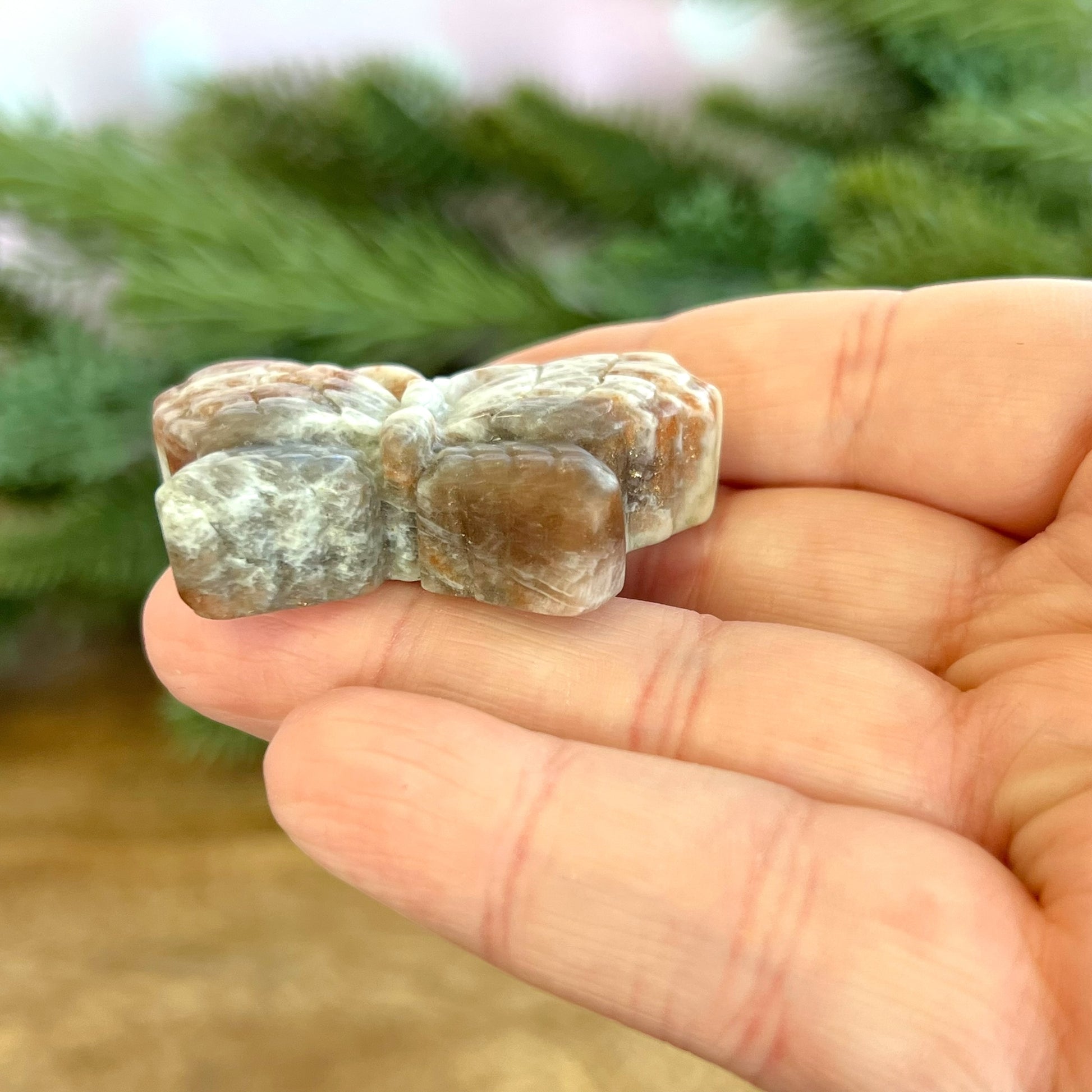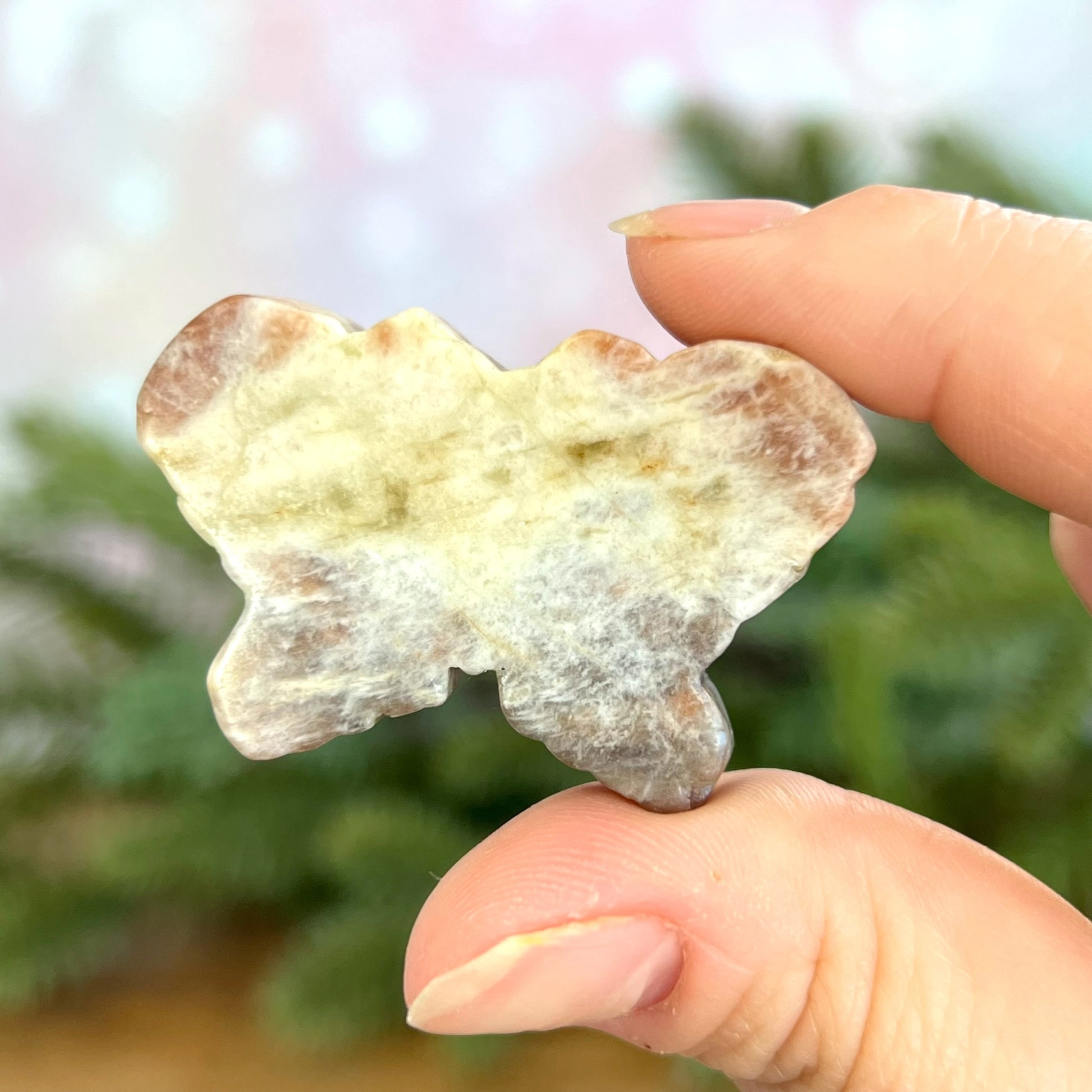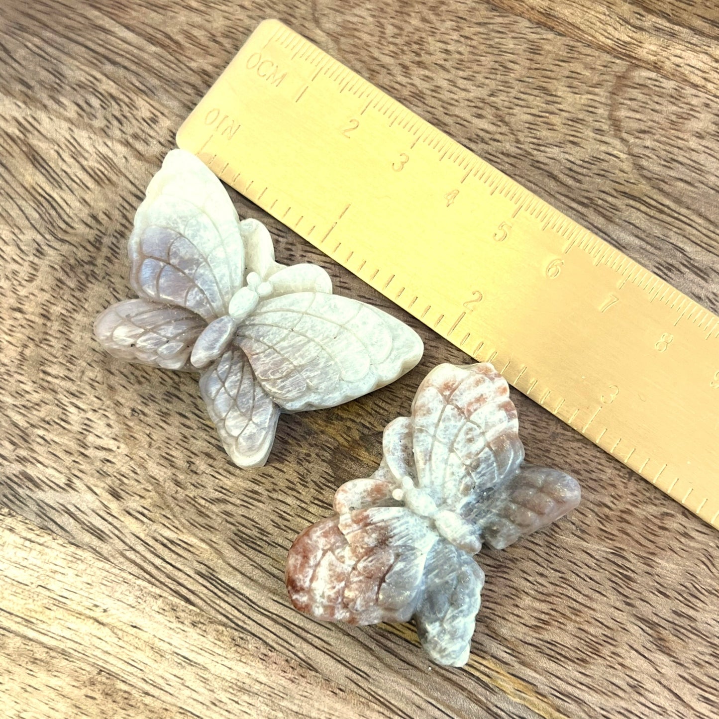 Enhance your spiritual practices with this beautiful Sunstone in Moonstone (Belomorite) carved stone cabochon. This crystal features a detailed butterfly. Butterflies are the perfect companion for times of transformation and change in our lives.