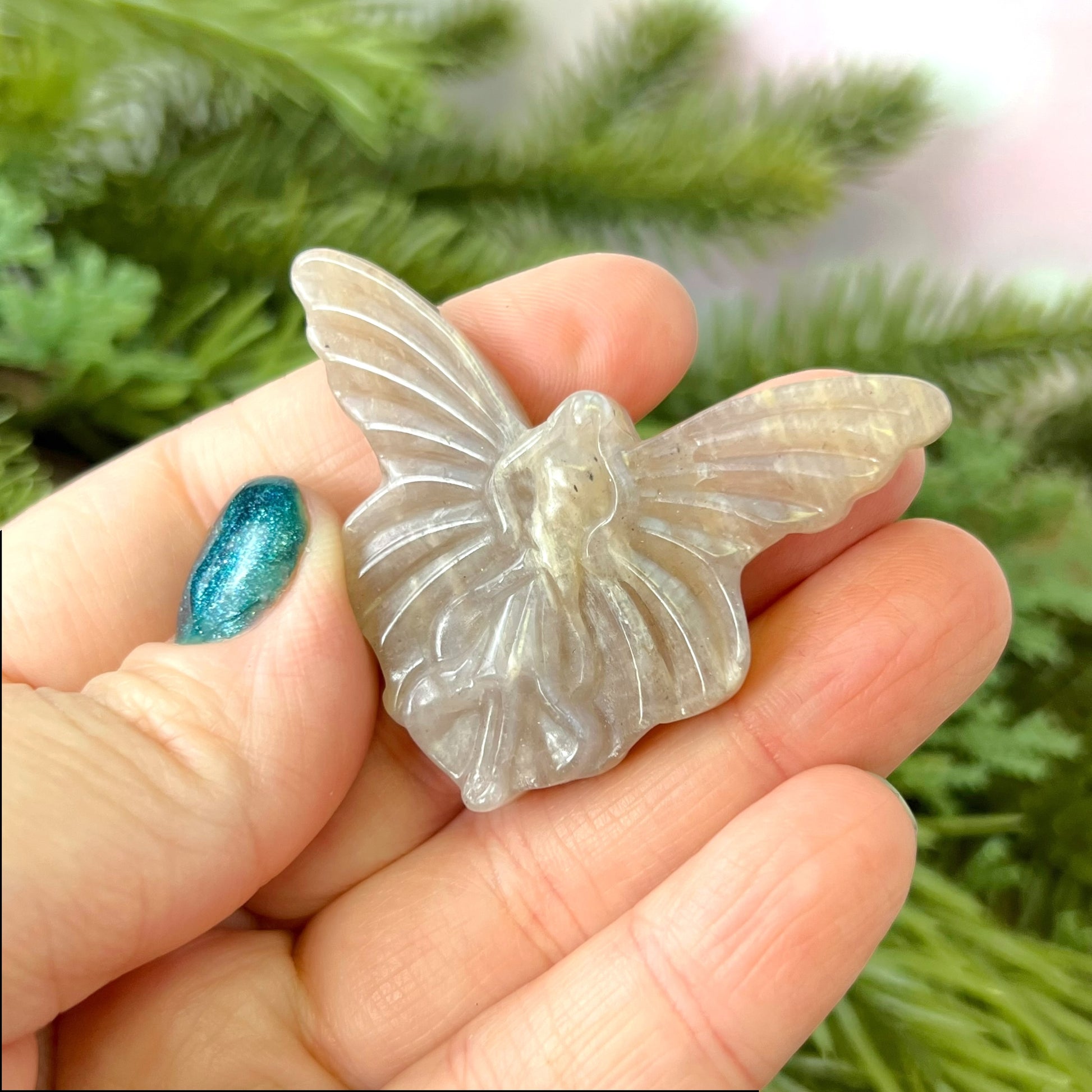 Enhance your spiritual practices with this beautiful Sunstone in Moonstone (Belomorite) carved stone cabochon. This crystal features a detailed art nouveau styled Faerie. The Fae are fantastical winged beings that can be found in cultures around the world. Each different culture has its own stories about these creatures - whether they be beneficial or harmful to humans.