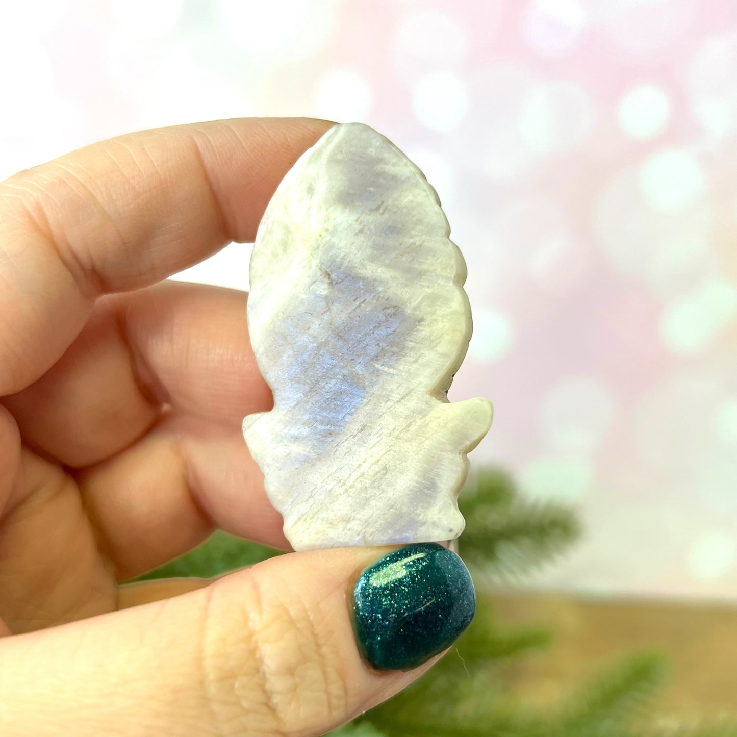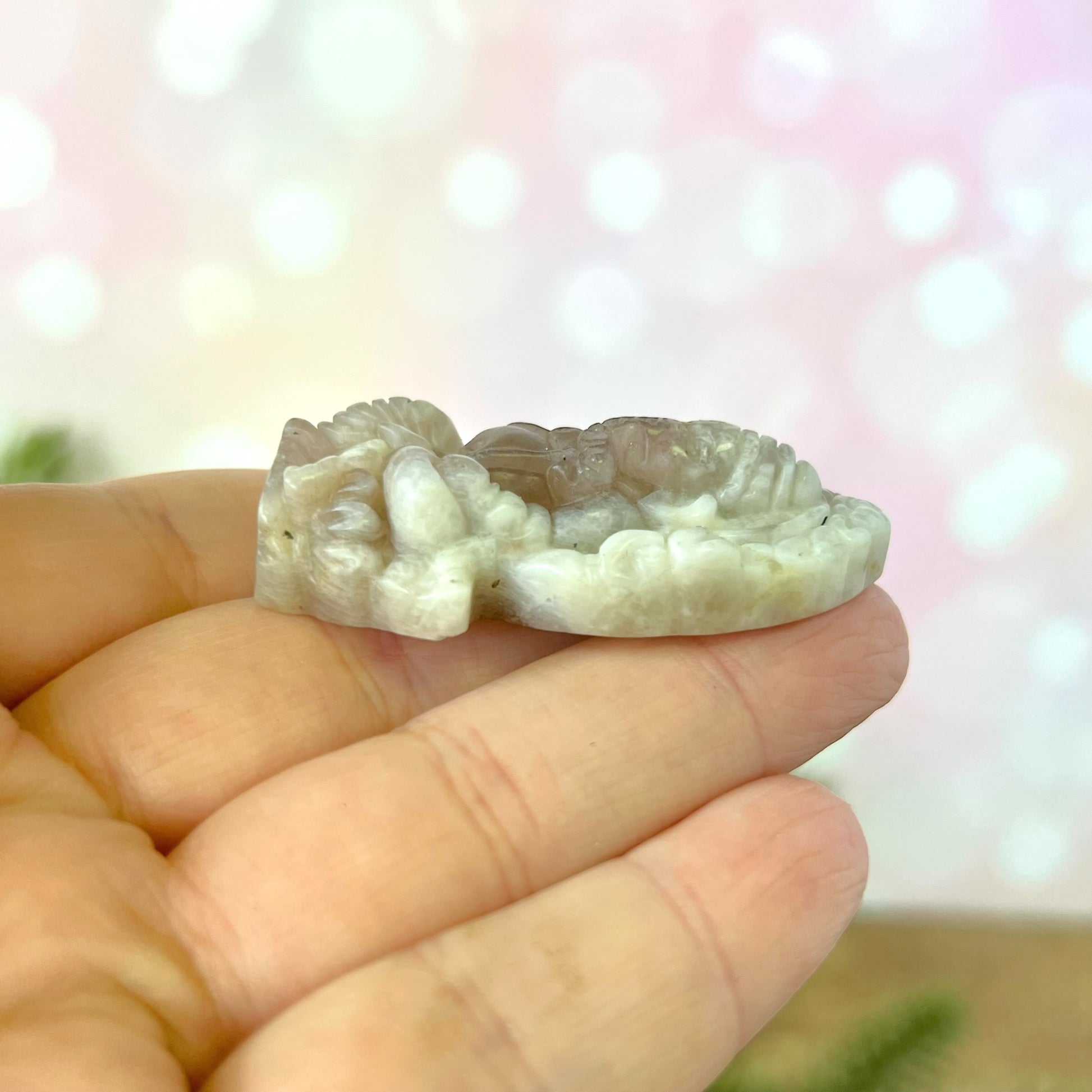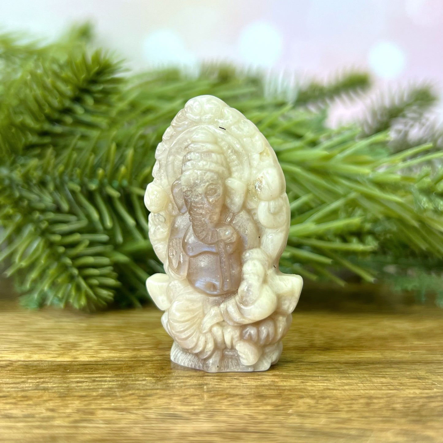 Enhance your spiritual practices with this beautiful Sunstone in Moonstone (Belomorite) carved stone cabochon. This crystal features a detailed carving of Ganesh.