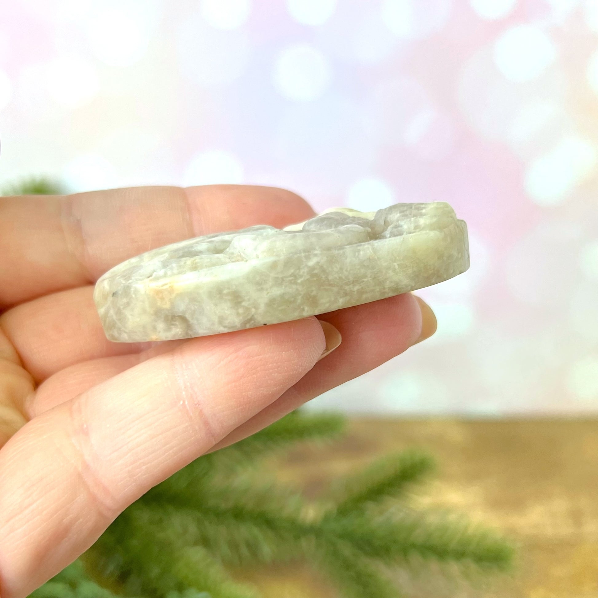 Enhance your spiritual practices with this beautiful Sunstone in Moonstone carved stone cabochon. This crystal is often called Belomorite, and features a detailed carving of a mermaid on an oval. Undrilled.