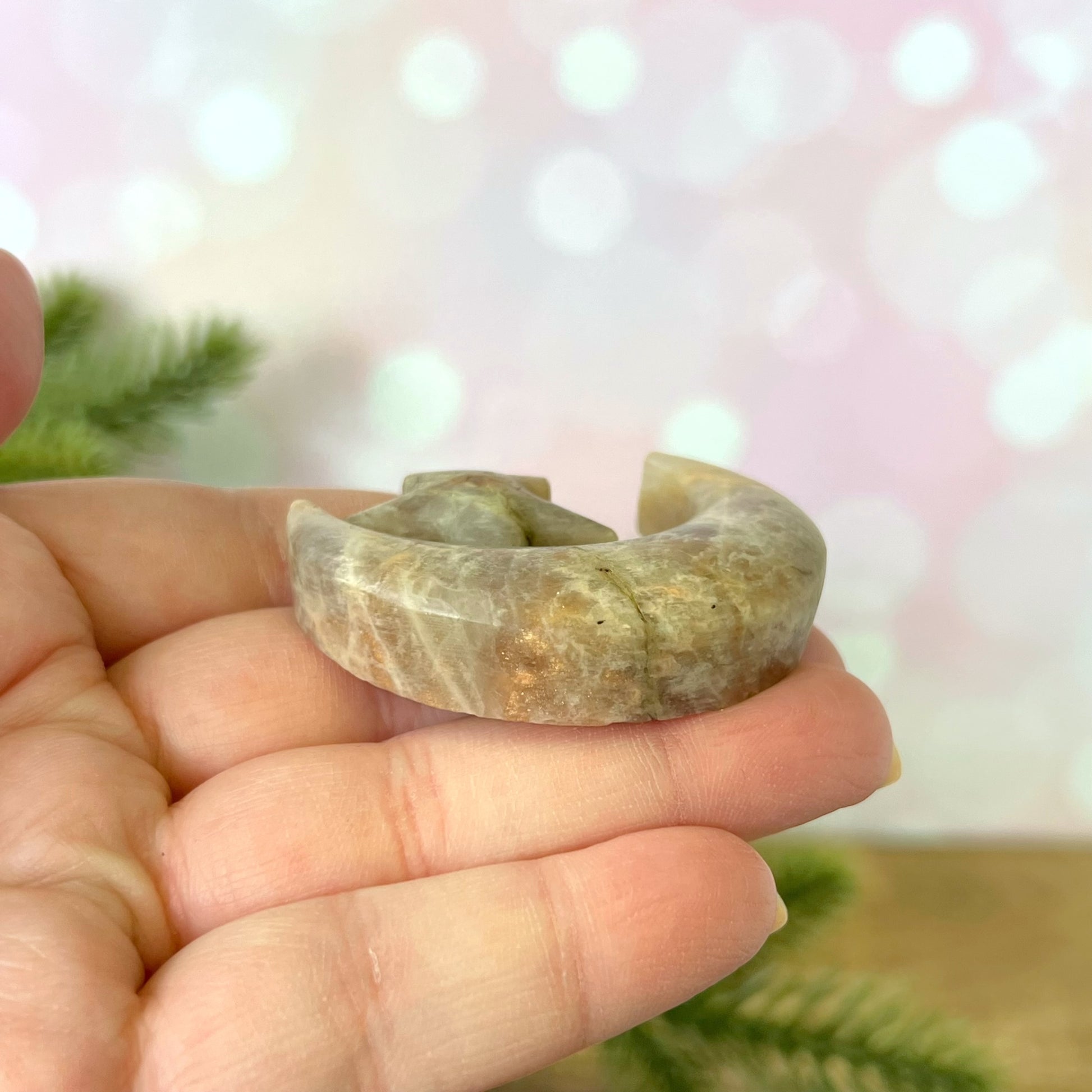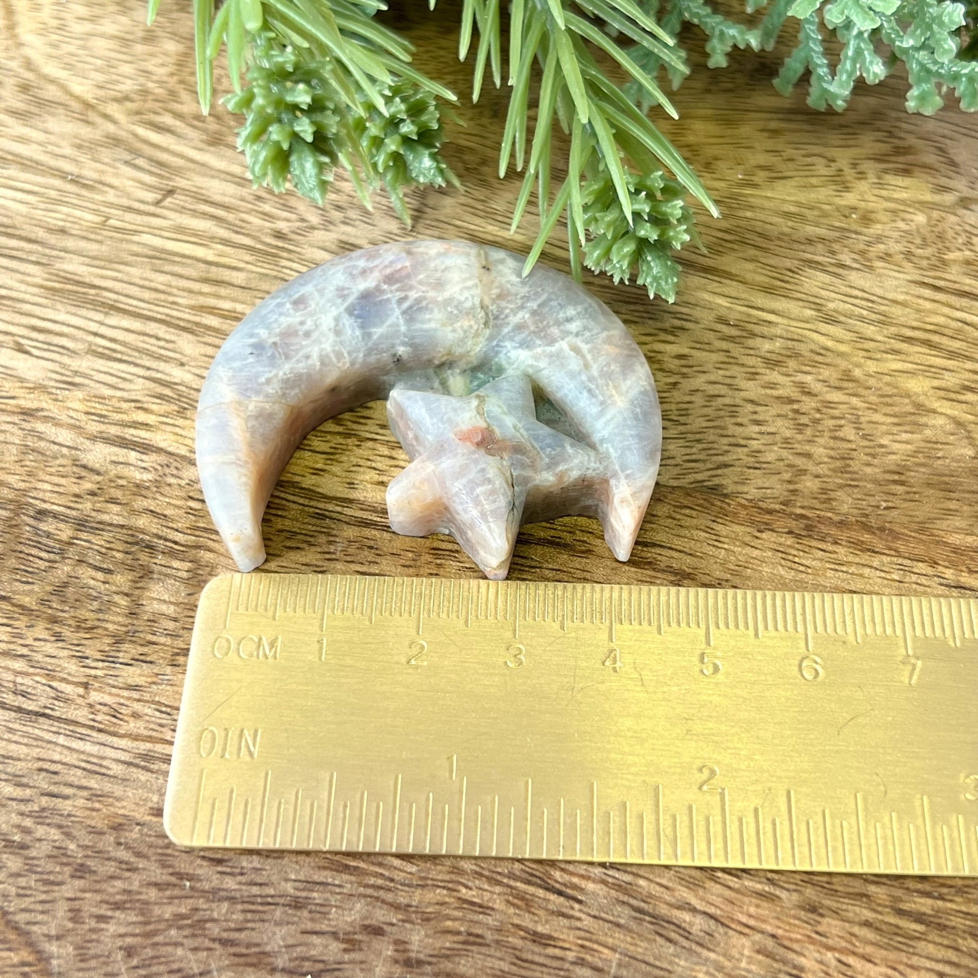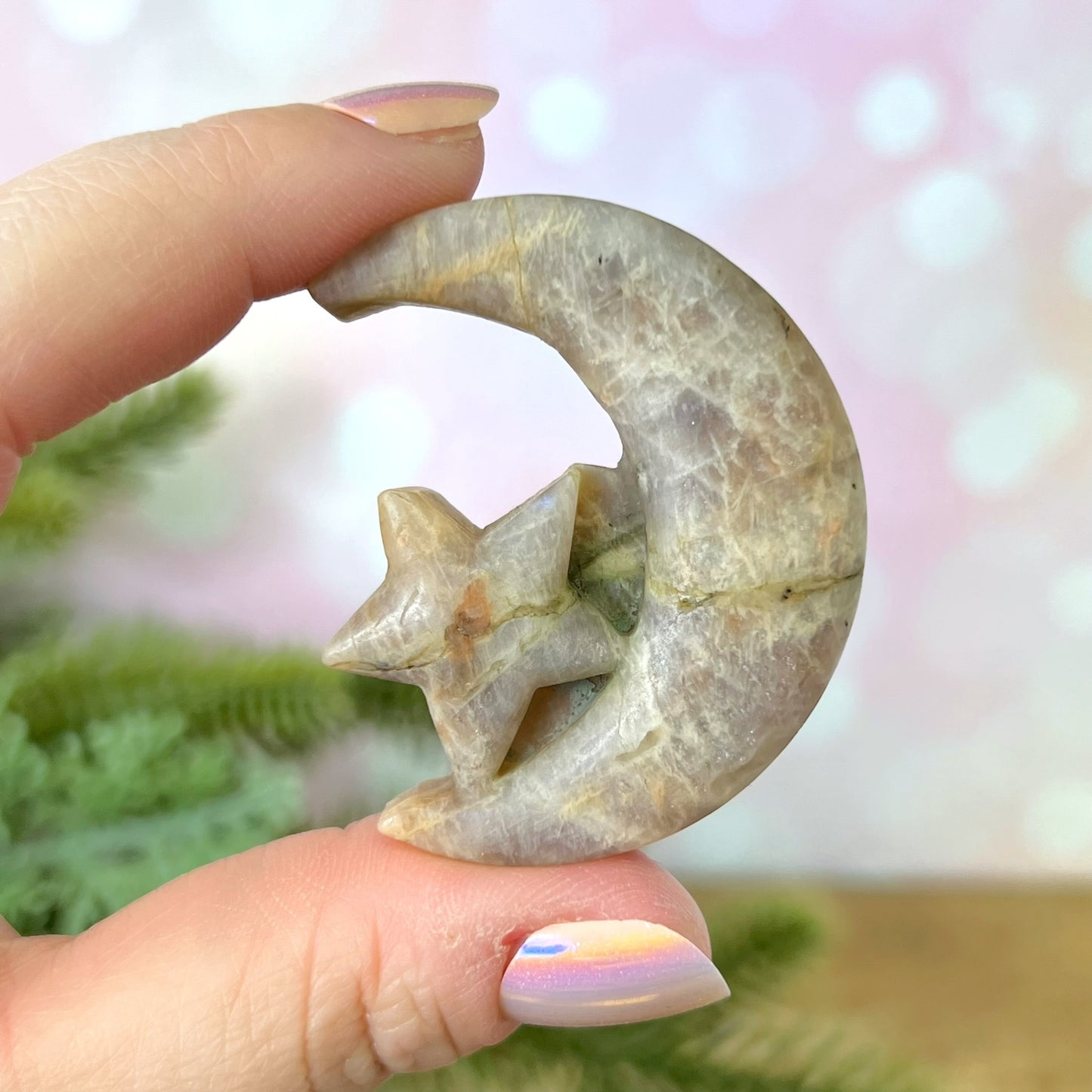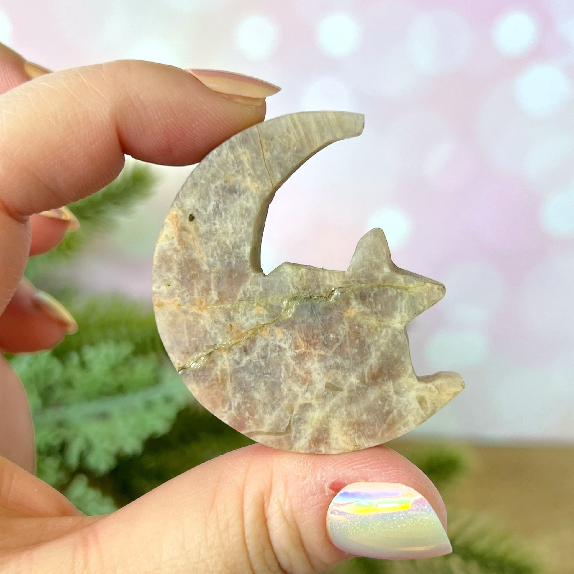Enhance your spiritual practices with this beautiful Belomorite carved stone cabochon. This crystal features a crescent moon with a star. This gemstone is made up of Sunstone included in Moonstone. Undrilled.