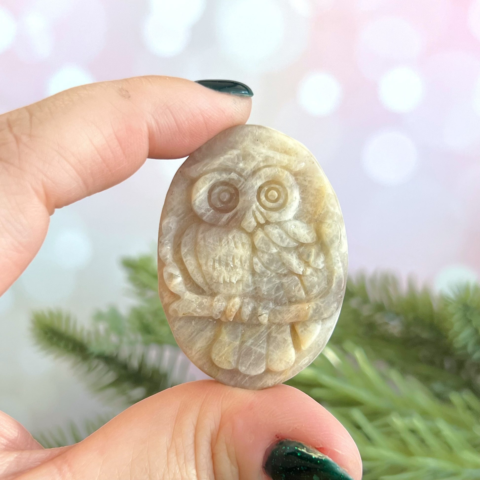 Enhance your spiritual practices with this beautiful Sunstone in Moonstone (Belomorite) carved stone cabochon. This crystal features a detailed carving of Athena's Grecian owl.