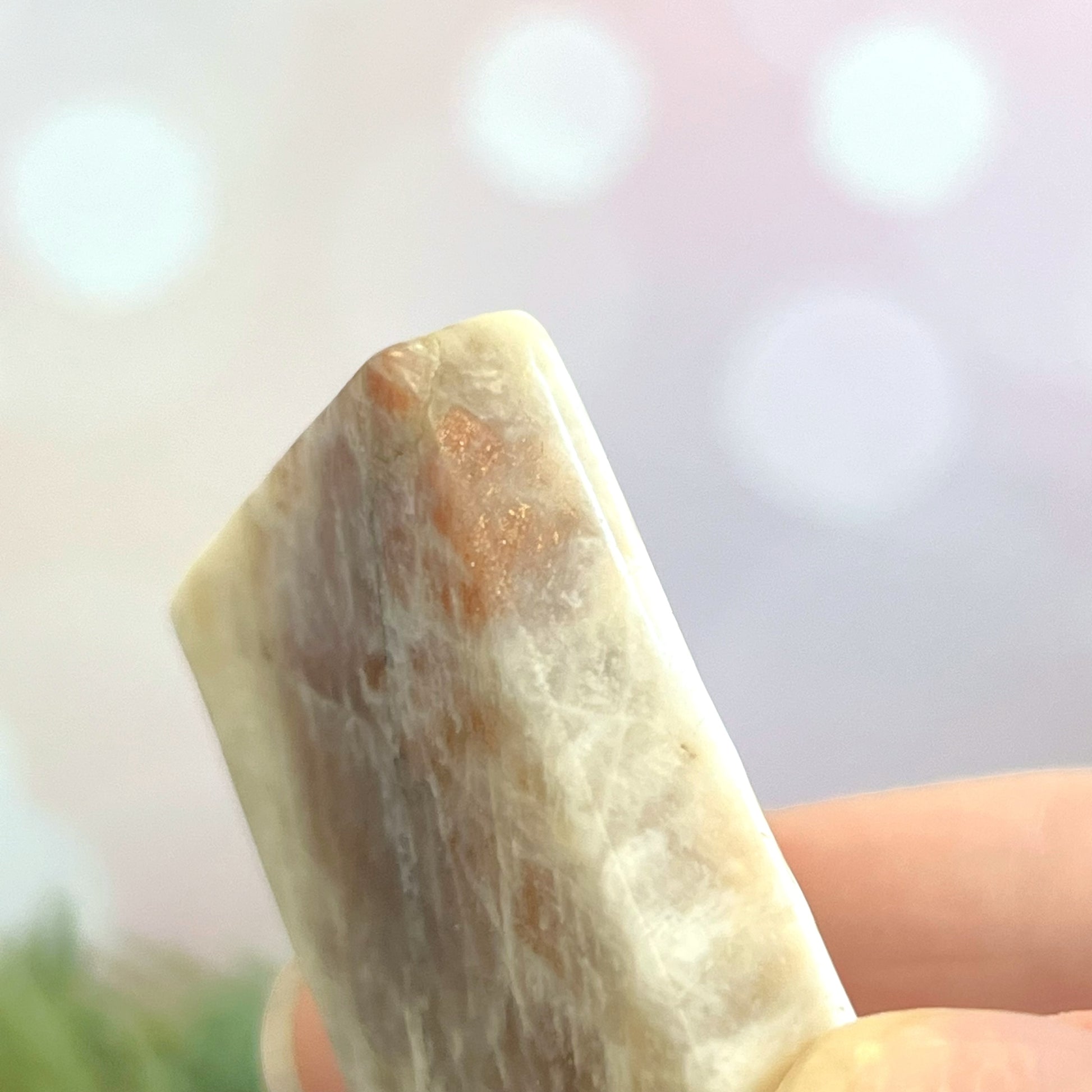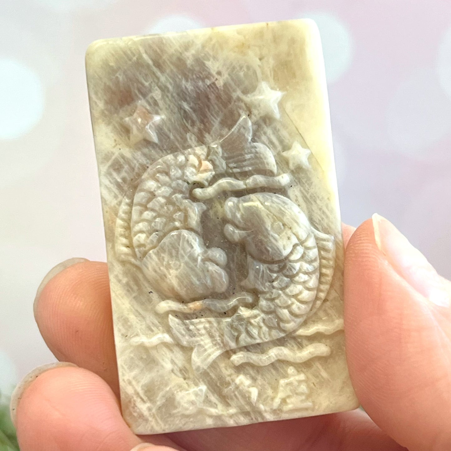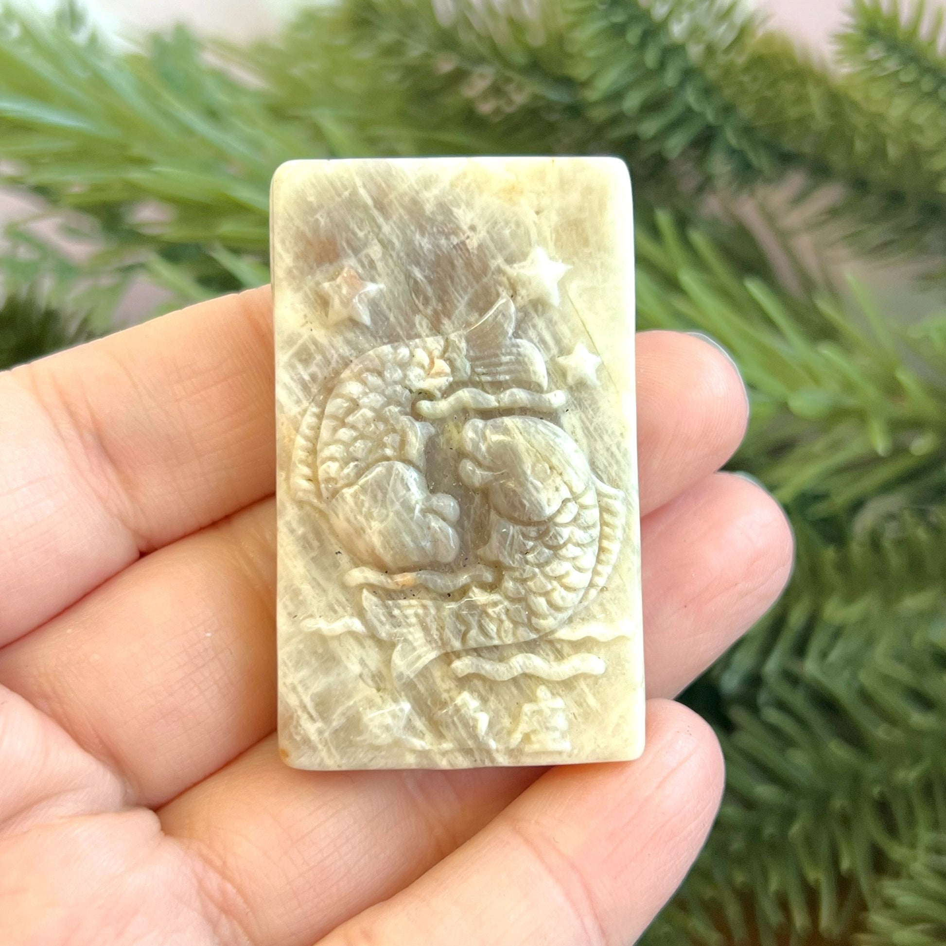 Enhance your spiritual practices with this beautiful Sunstone in Moonstone (Belomorite) carved stone cabochon. This crystal is for all our Pisces! The zodiac sign Pisces is represented by two swimming fish, and falls about on the dates of February 19 through March 20.