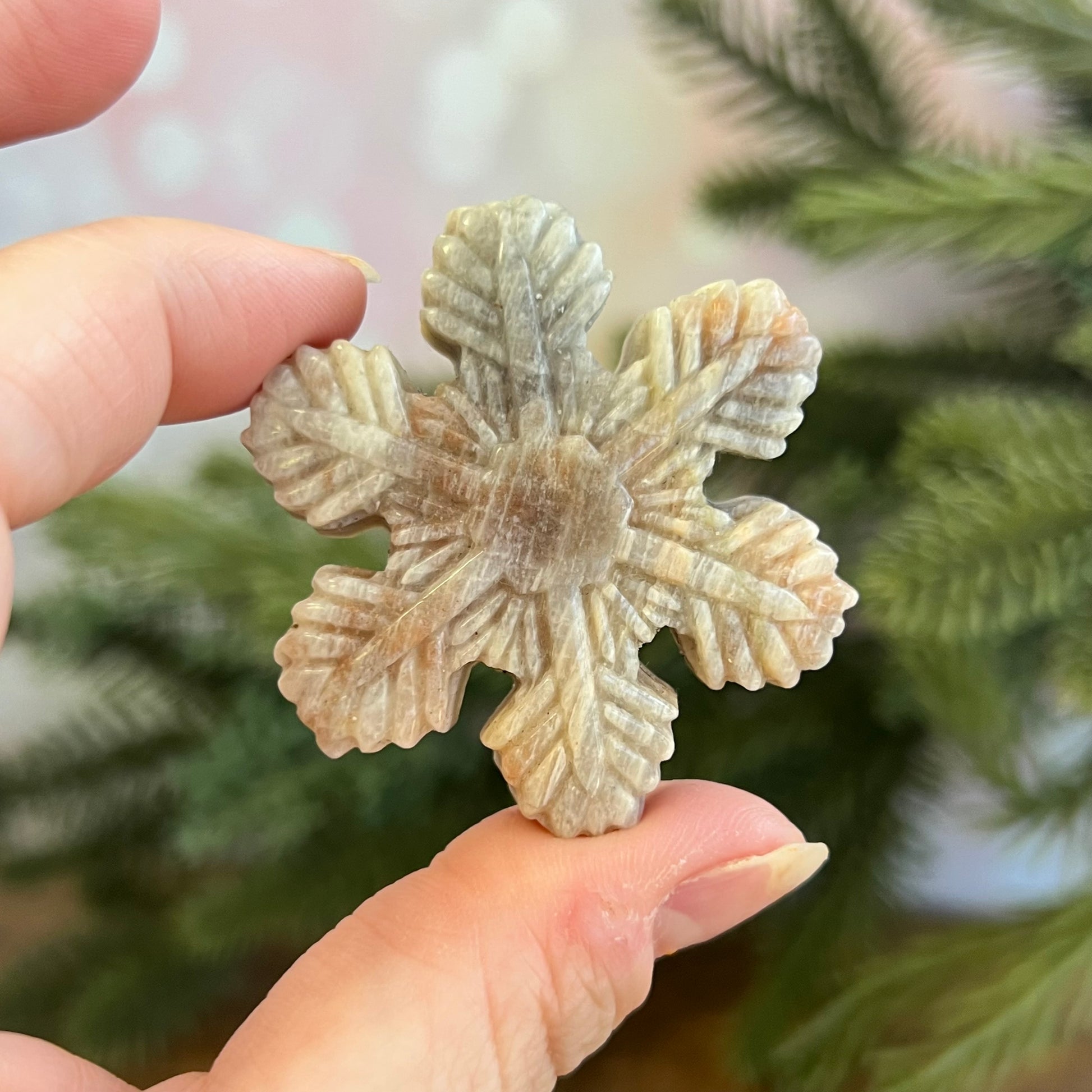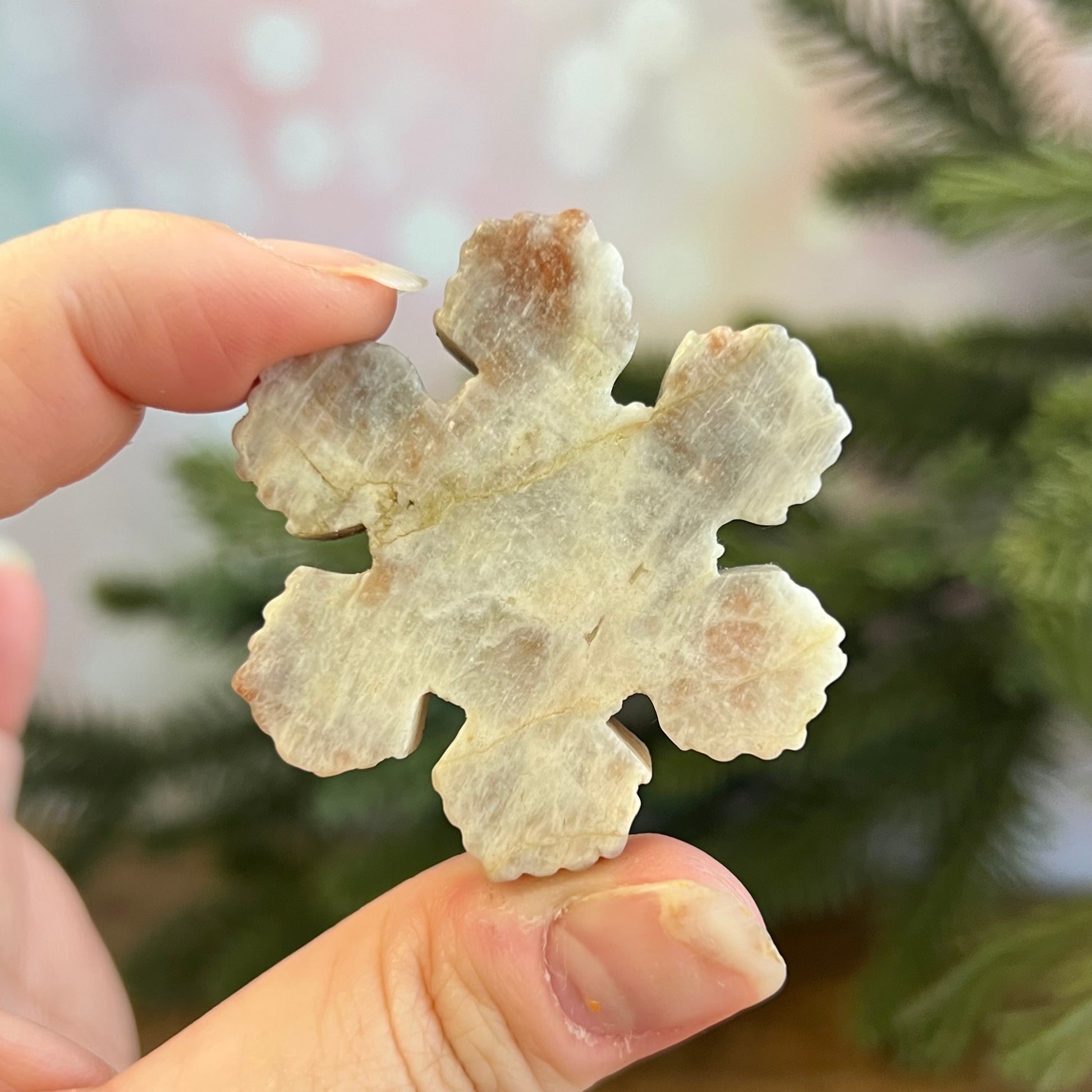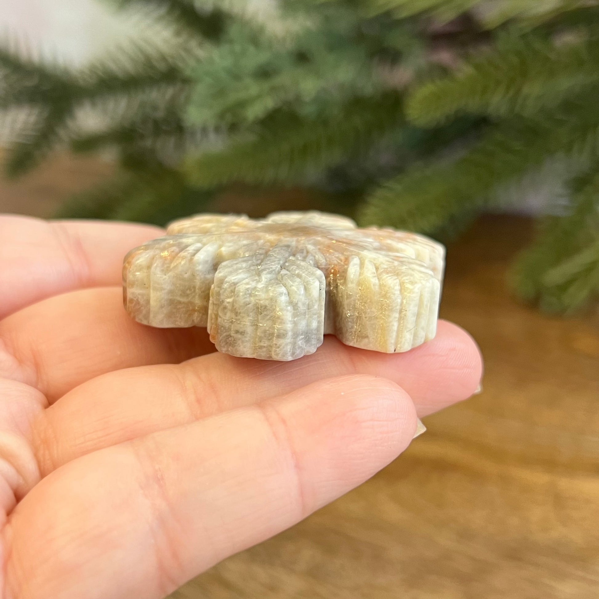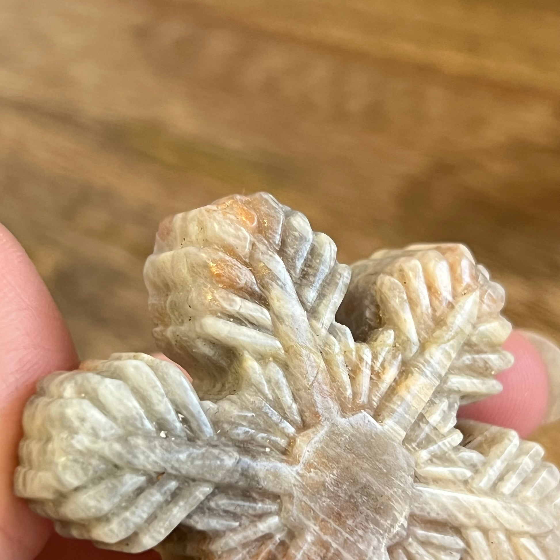 Enhance your spiritual practices with this natural Belomorite crystal carved stone cabochon. This crystal is a combination of Sunstone in Moonstone. It's been intricately carved into a beautiful snowflake. Perfect for those cozy winter vibes, or to carry as an Amulet for good luck with weather