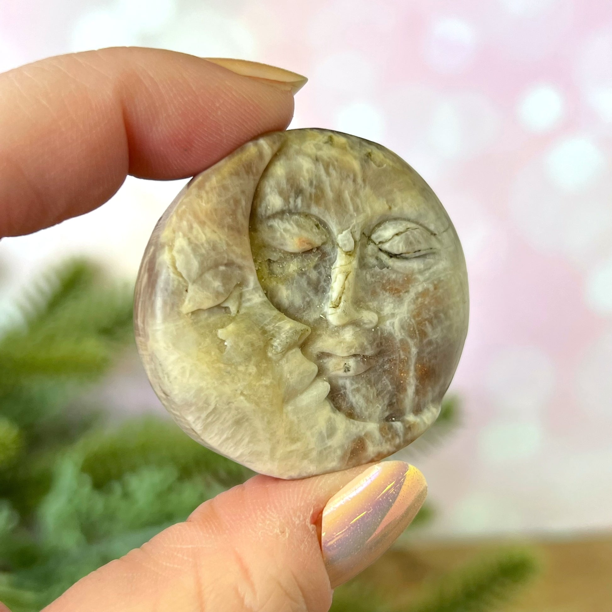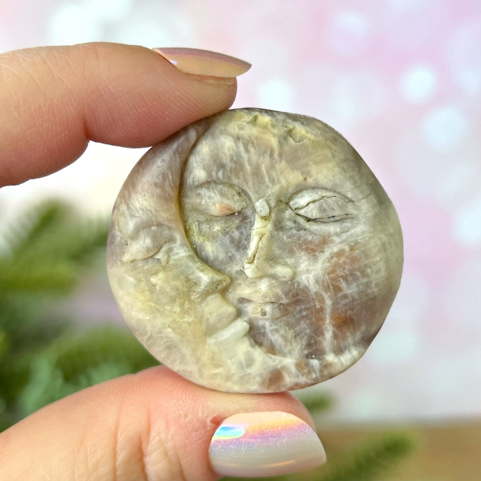 Enhance your spiritual practices with this beautiful Sunstone in Moonstone (Belomorite) carved stone cabochon. This crystal features a detailed Sun & Moon face. The Sun and Moon combined is all about unifying opposites: light and dark; day and night; male and female. It's the perfect choice when you want to usher in harmony and balance within your life. .