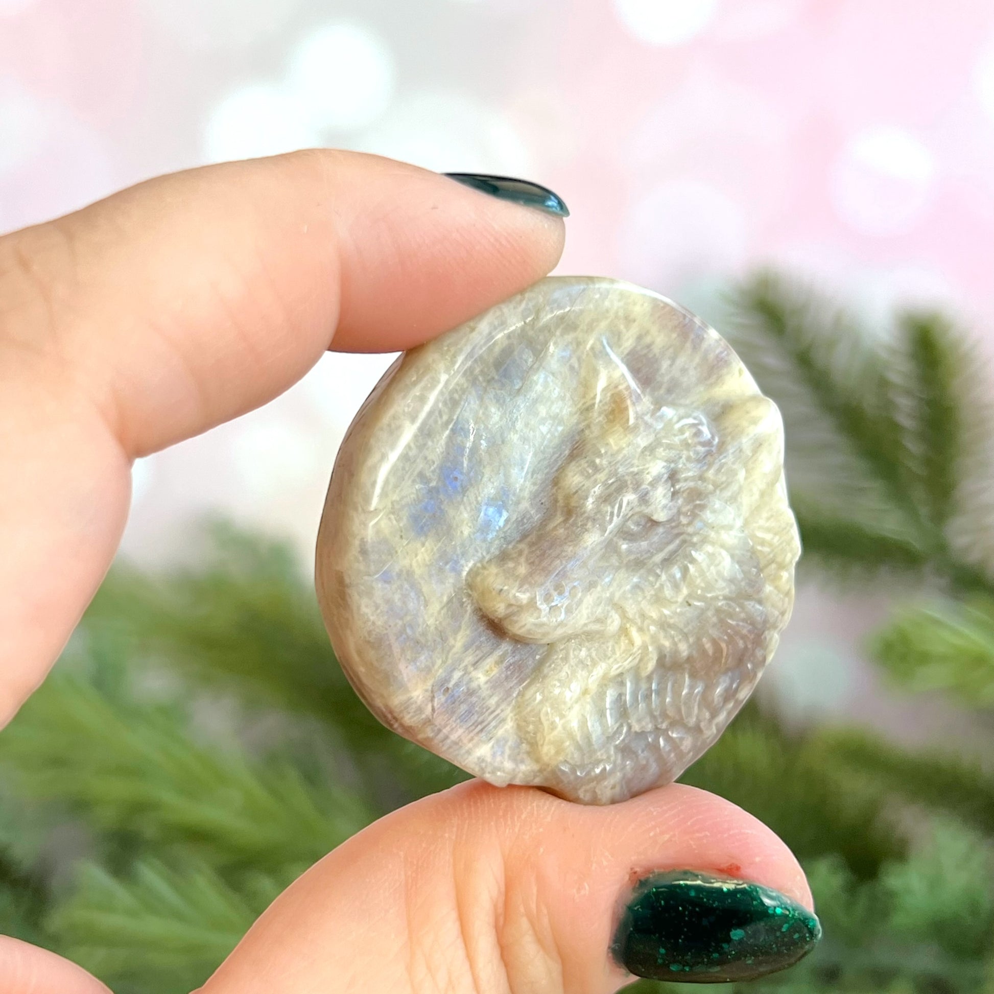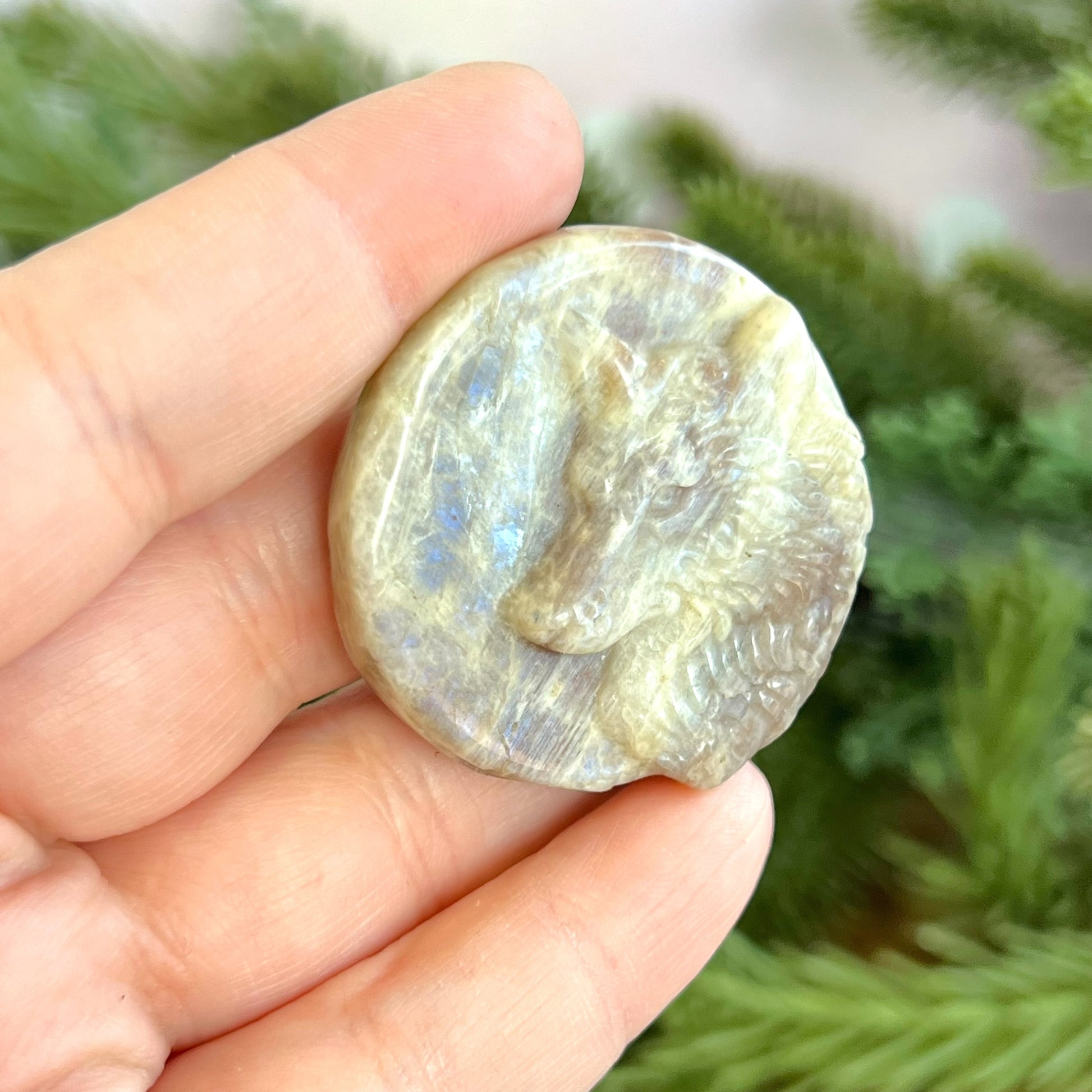 Enhance your spiritual practices with this beautiful Sunstone in Moonstone (Belomorite) carved stone cabochon. This crystal features a detailed wolf's head against a full moon. Wolves are a beautiful animal associated with strength, endurance, majesty, and danger. We may often think of the "lone wolf" stereotype, but wolves are actually very social. Choose a wolf when you're creating new paths in your life and need some companionship in tough times..