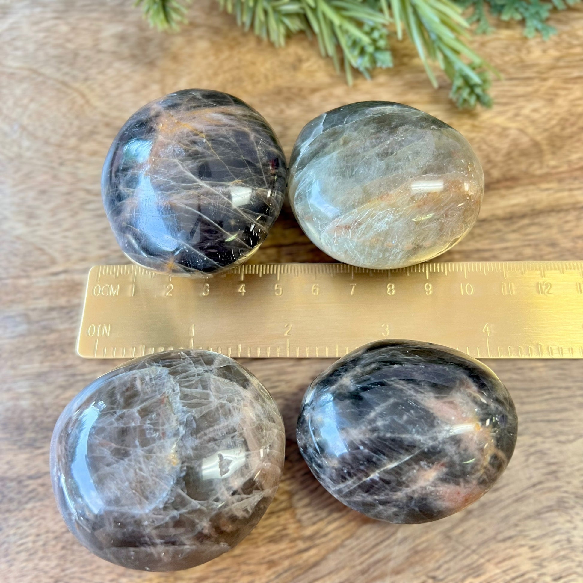 Enhance your spiritual practices with this beautiful Black Moonstone palm stone. This listing is for one richly colored crystal, many of which have flash (but not all!). Our current inventory also has veins of peach color in spots. Black Moonstone serves as a powerful reminder that all aspects of yourself are worthy of love! It’s a popular choice for shadow work and new mothers
