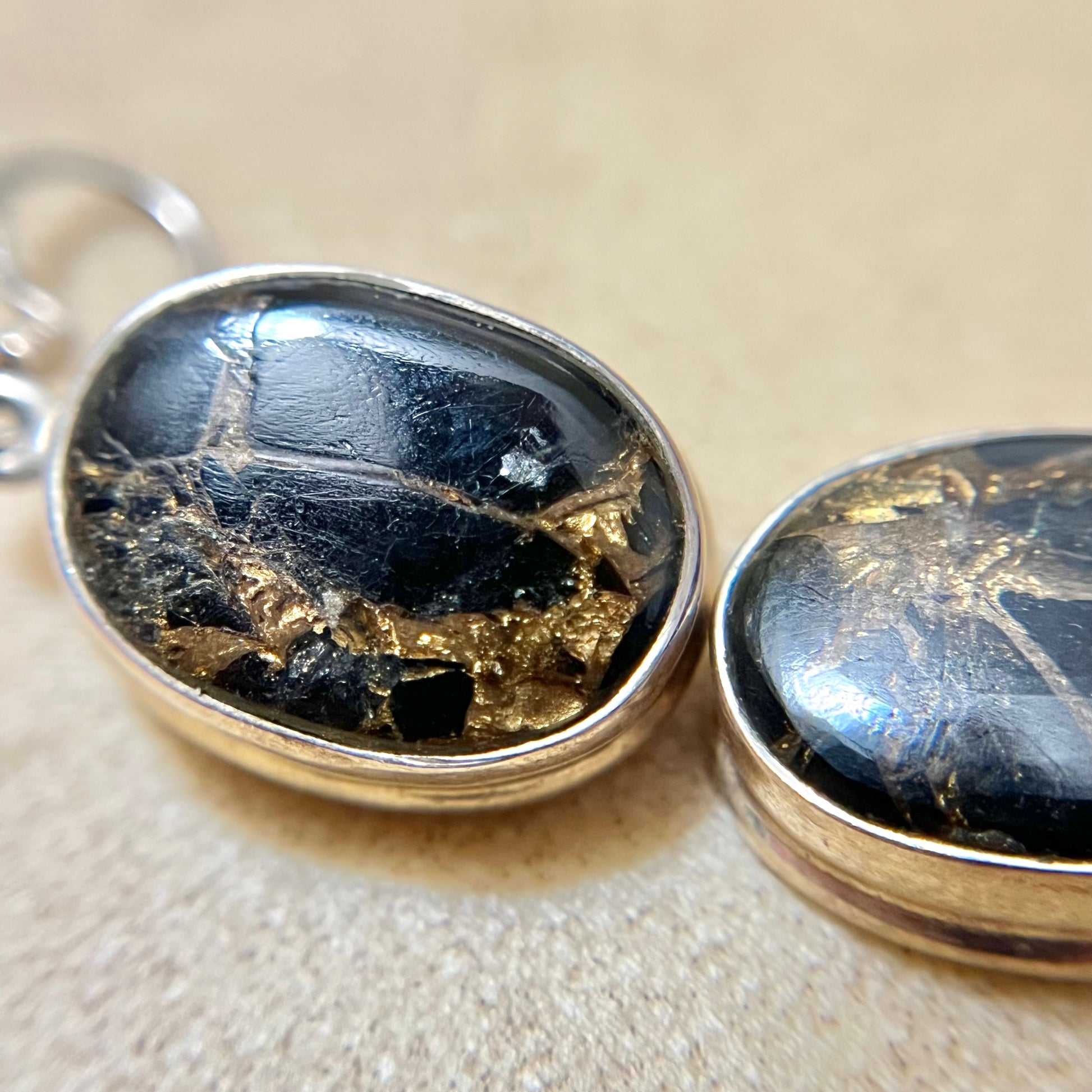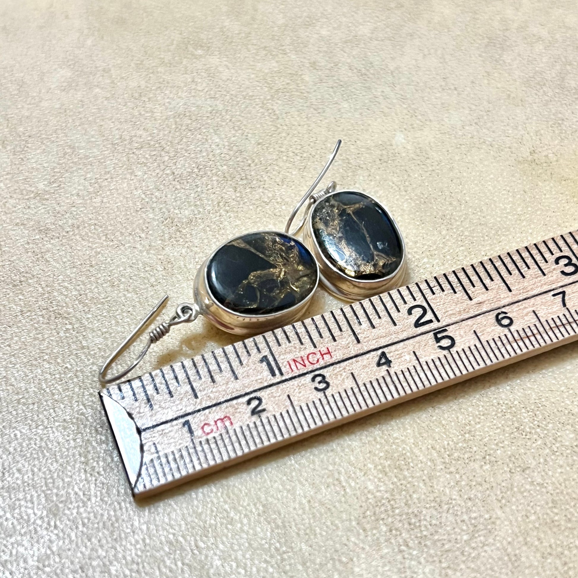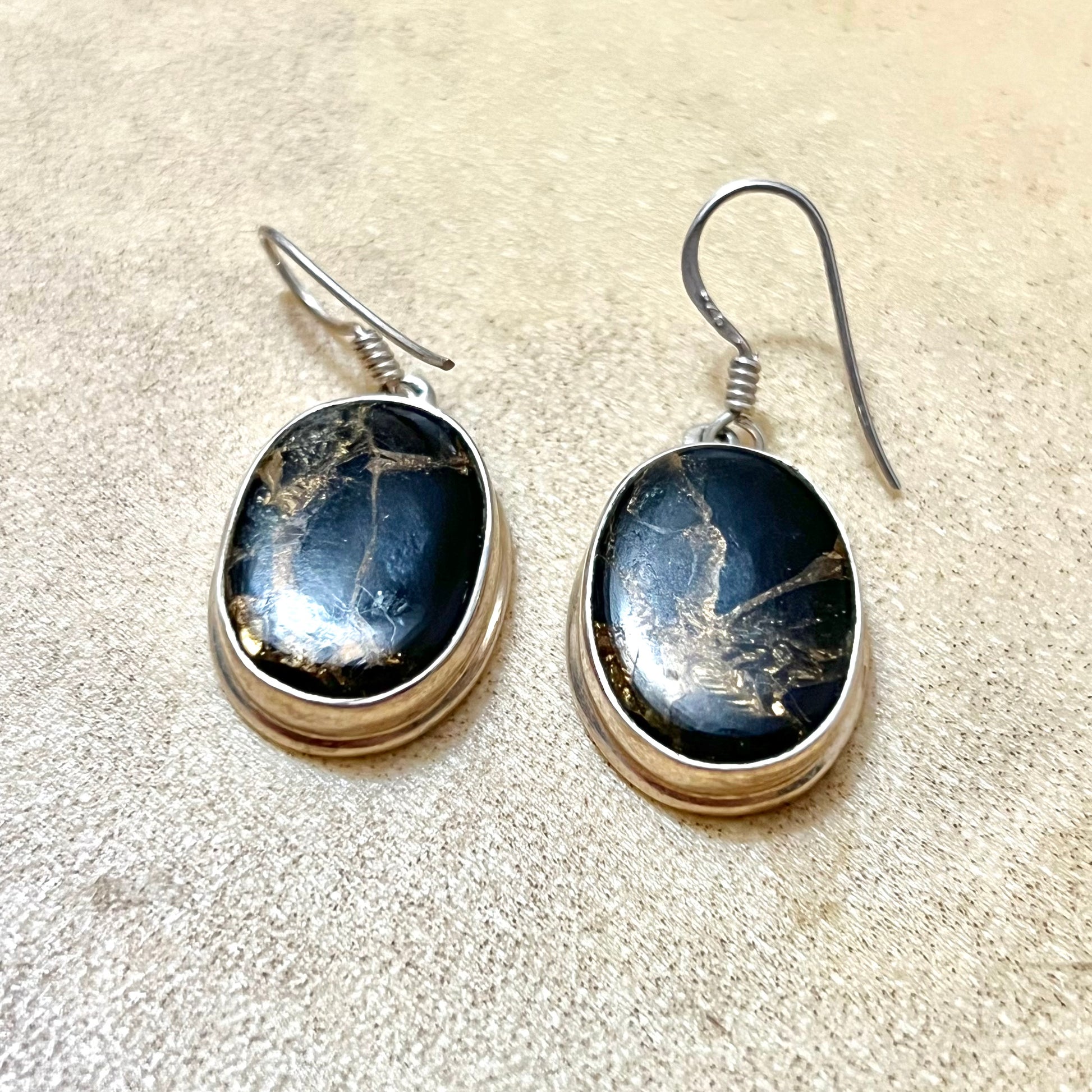 This beautiful pair of vintage Sterling Silver features a black and copper stone. We're not sure what the stone is, but our best guess is Black Tourmaline. Very good used condition with some surface tarnish. Missing their original stoppers, but will include a new clear silicone pair (not shown).