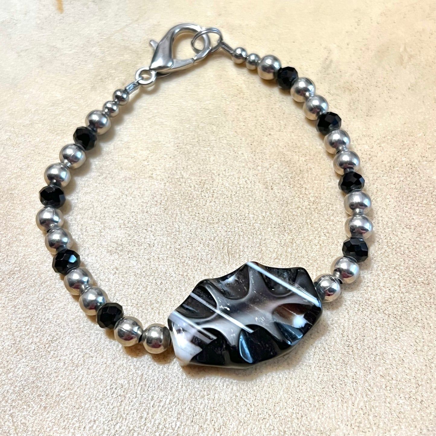 Express yourself with unique vintage jewelry! This beautiful beaded bracelet features a large, carved Agate focal bead in black & white. The accent beads are a silver tone, completed with a large lobster clasp.