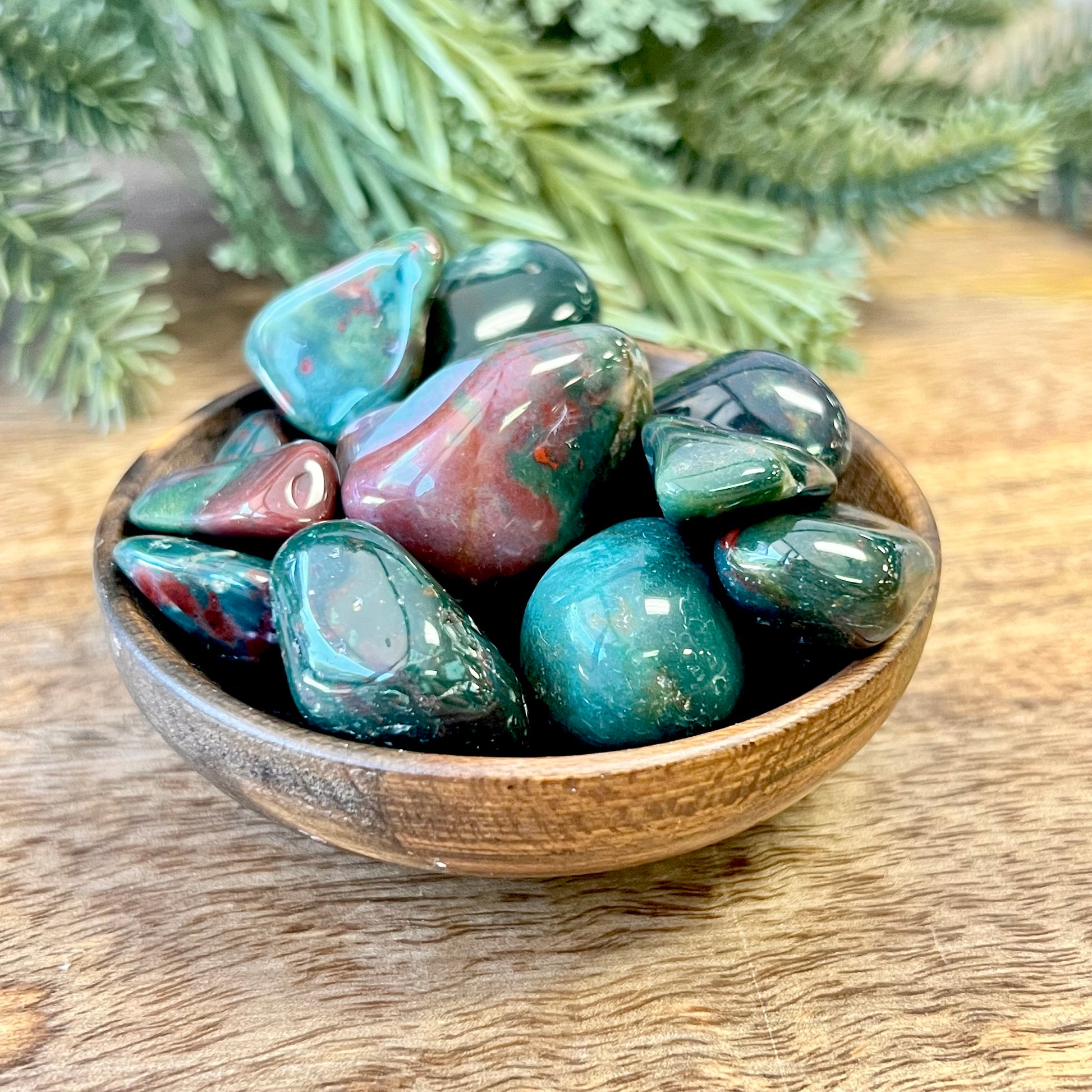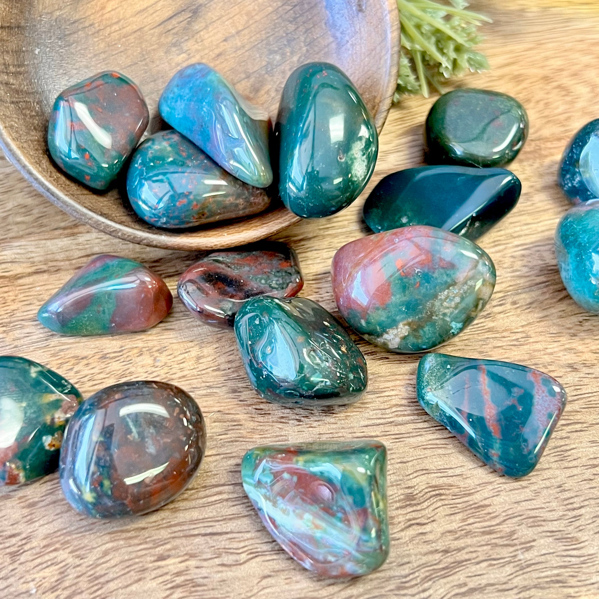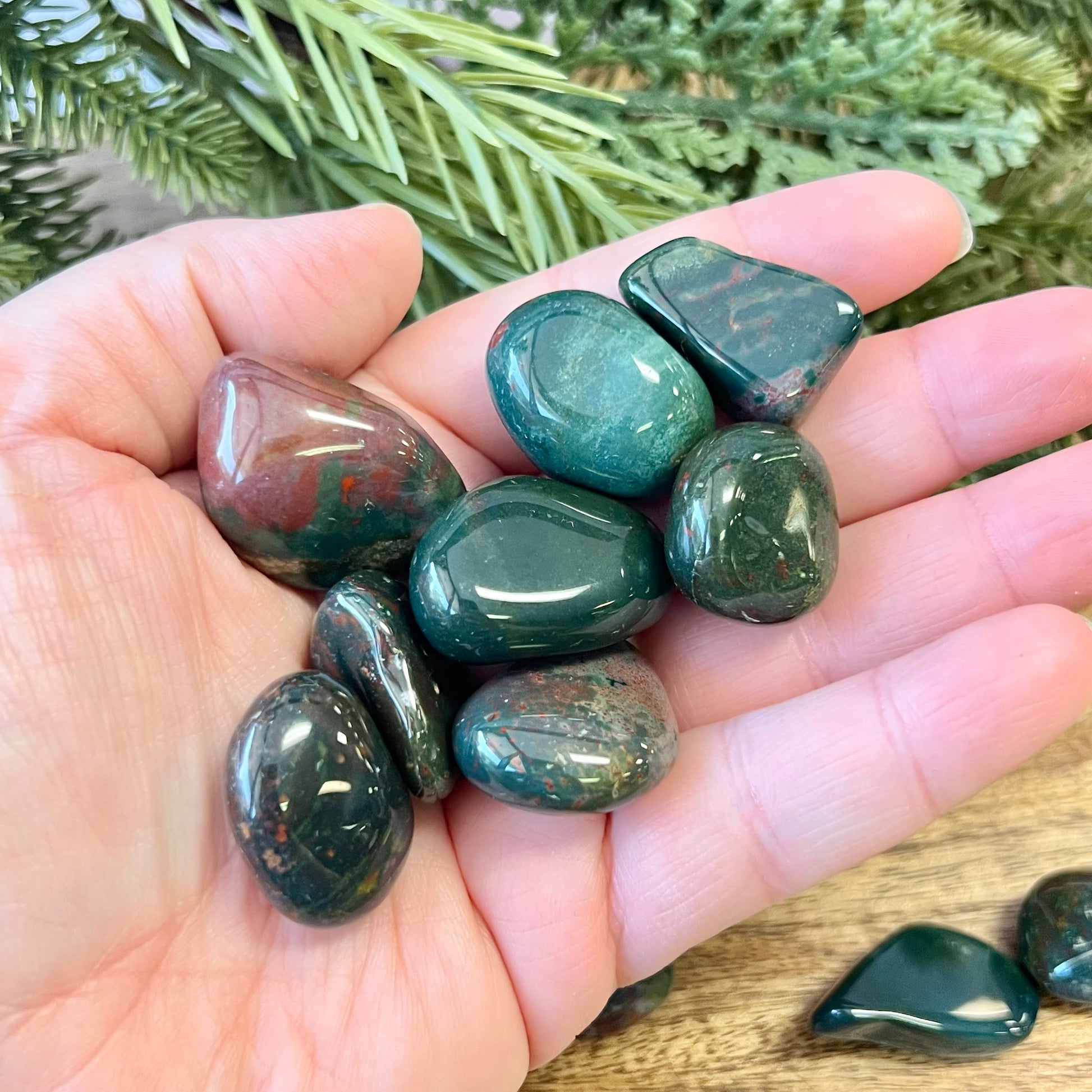 Enhance your spiritual practices with a beautiful Bloodstone tumbled stone. This crystal is a dark green Chalcedony with red spots. Our current inventory is old stock from a private collection.