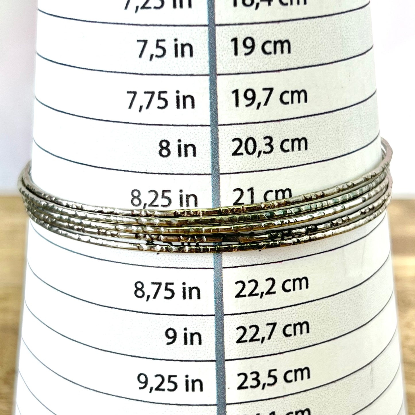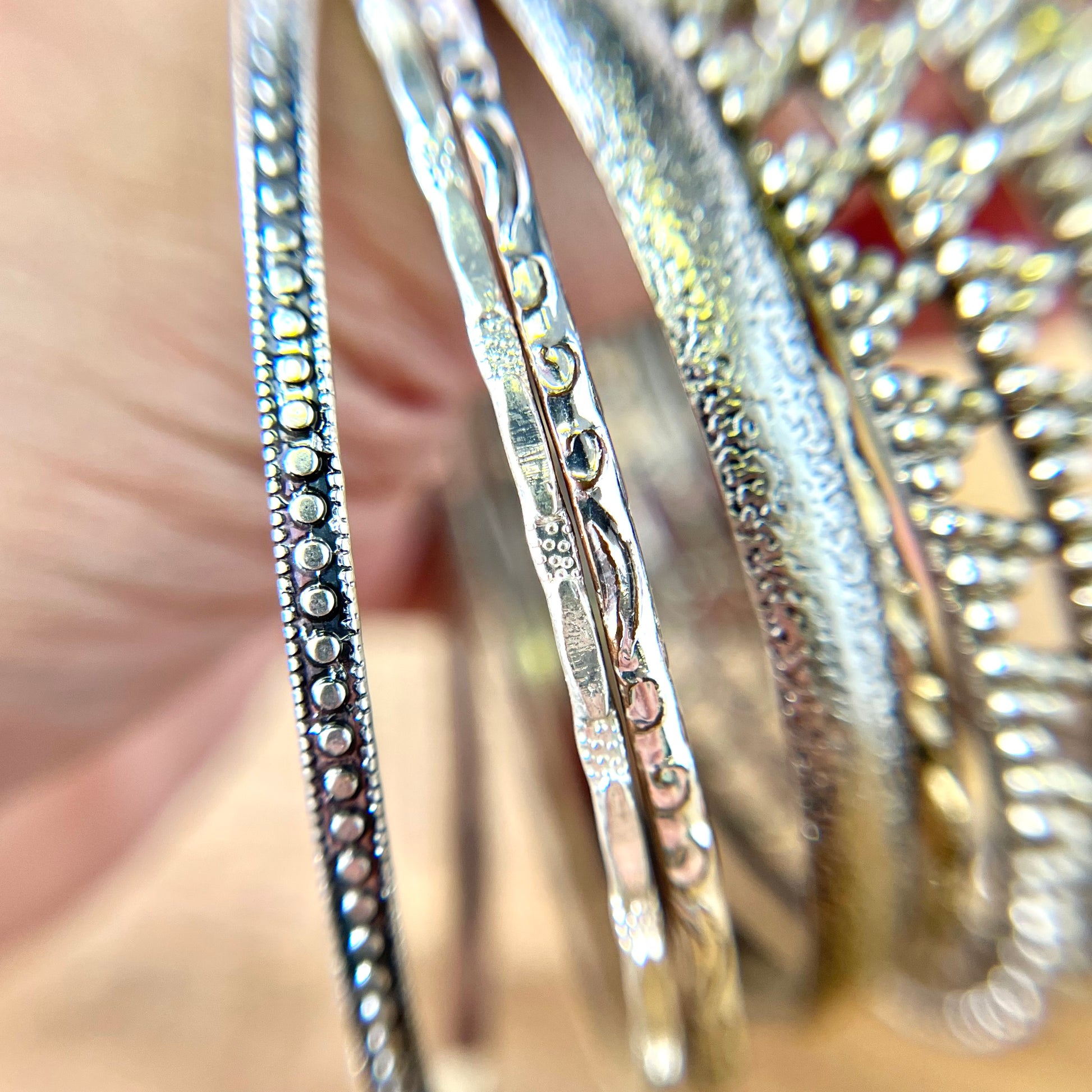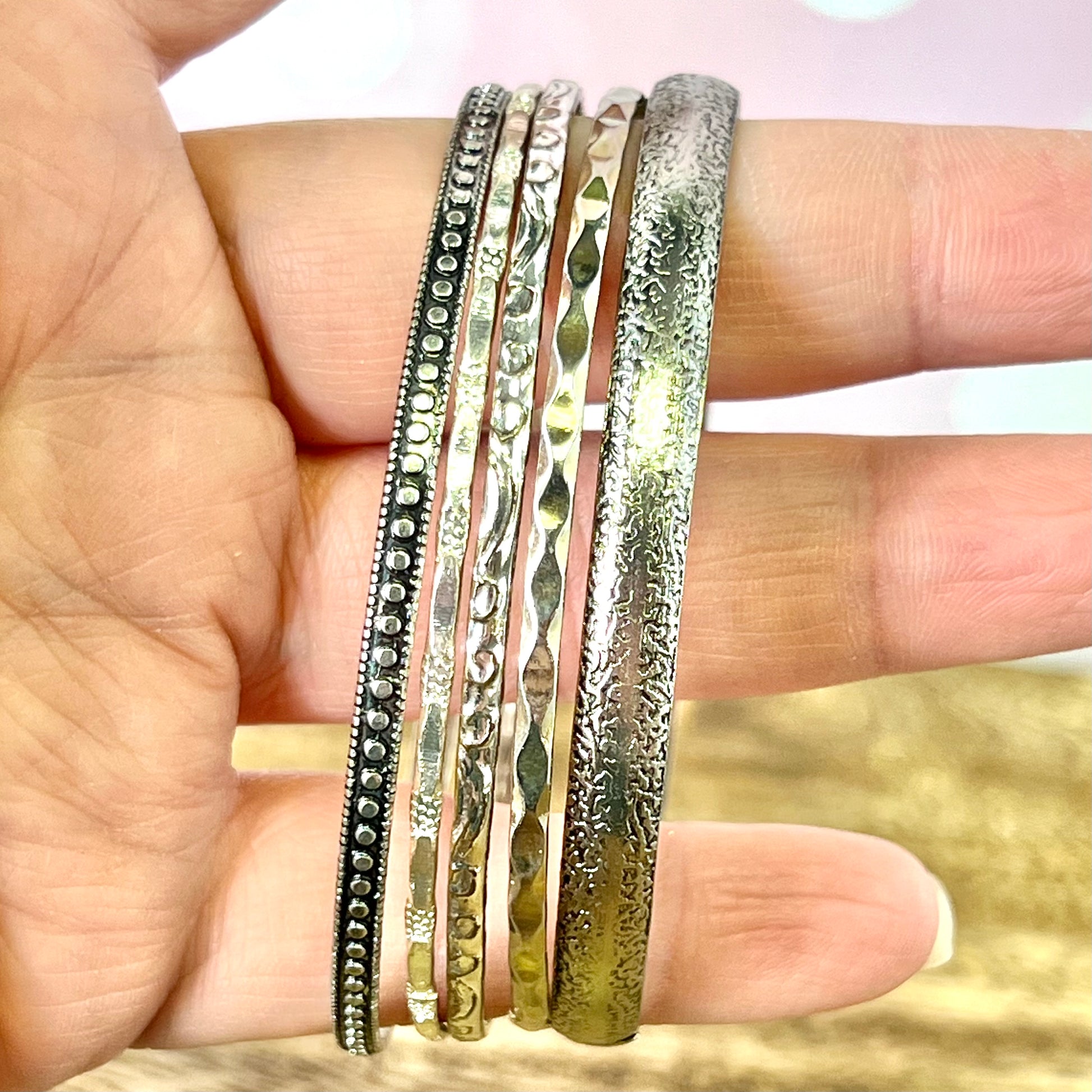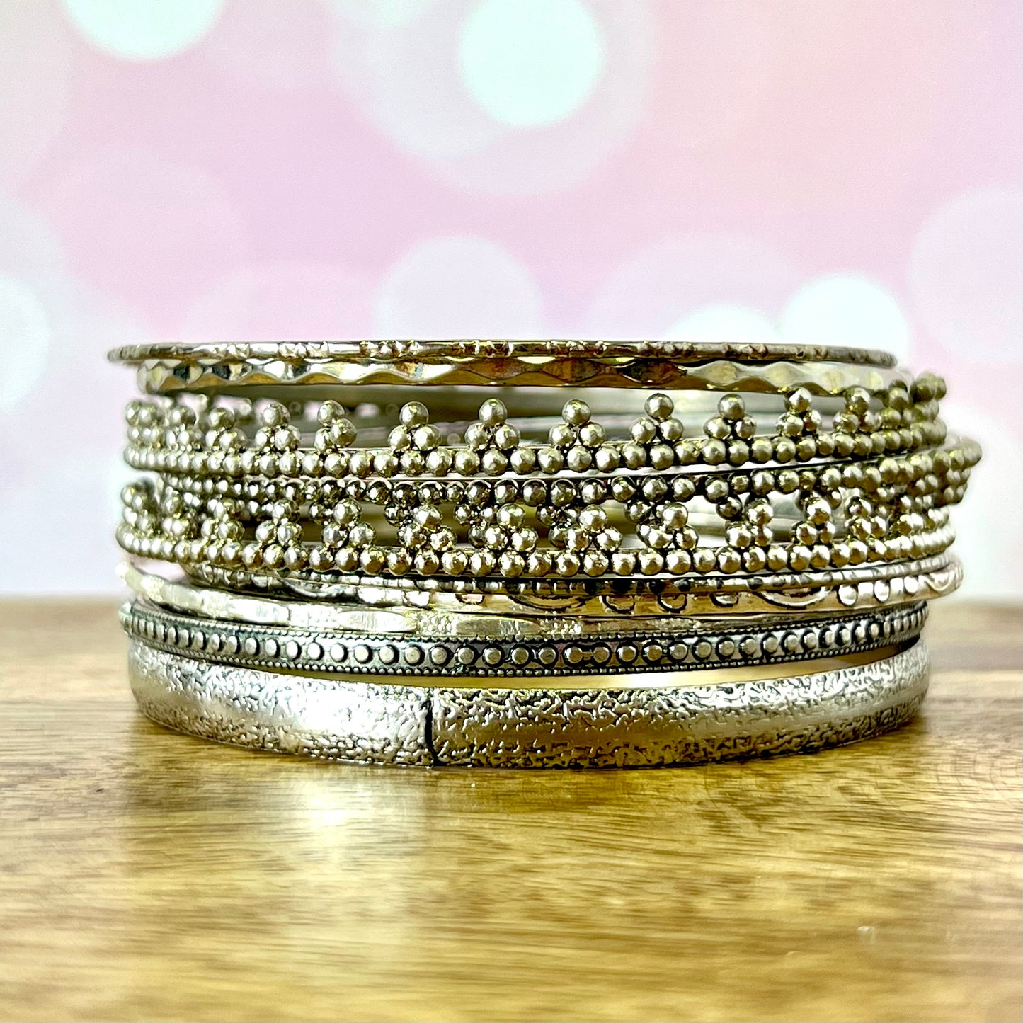 Beautiful custom bracelet stack of 13 bangles. We hand select each bracelet to make sure they blend together perfectly. Each stack we offer is unique and won't be replicated. This set is highly textured and silver tone.
