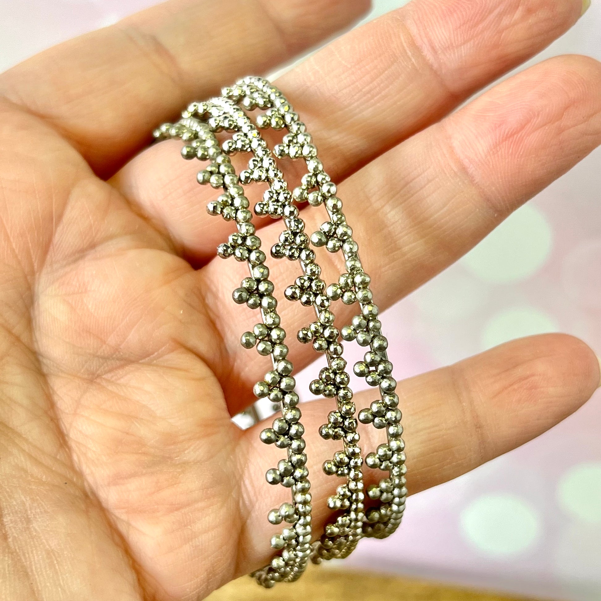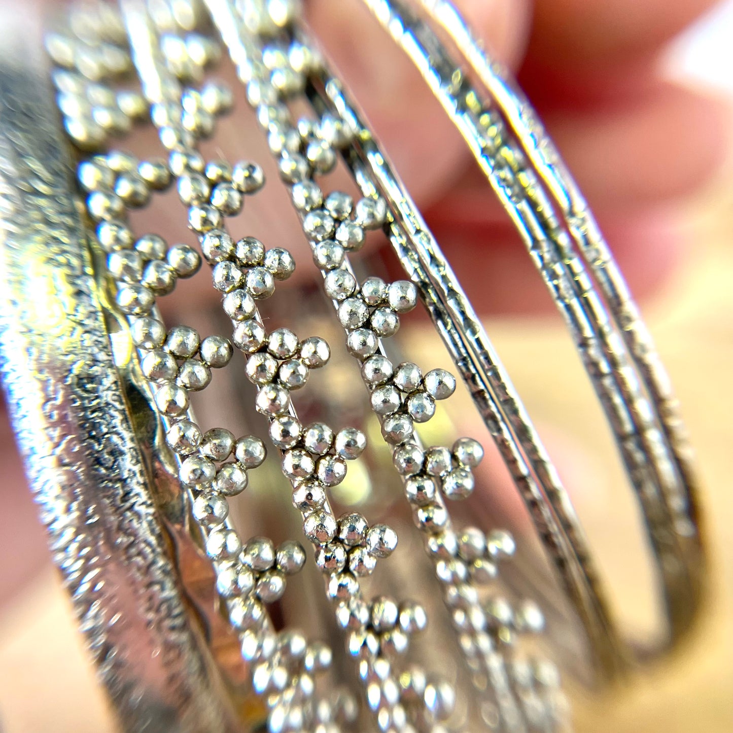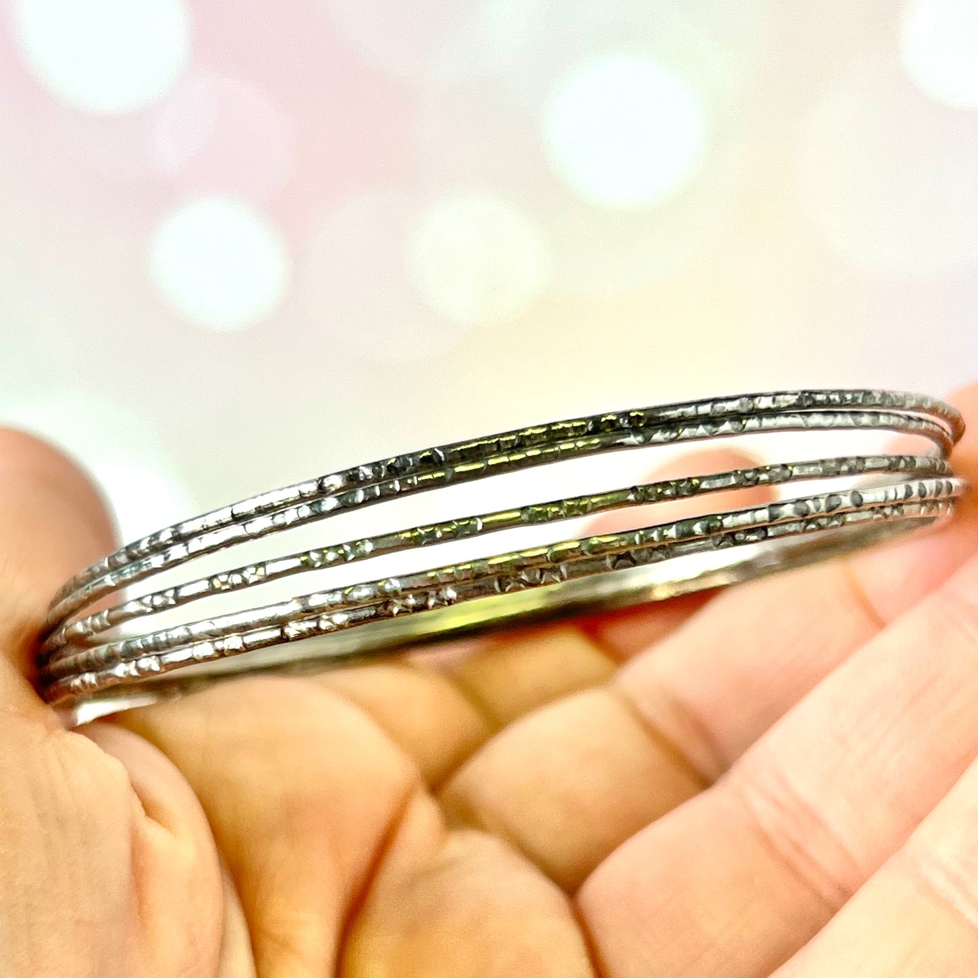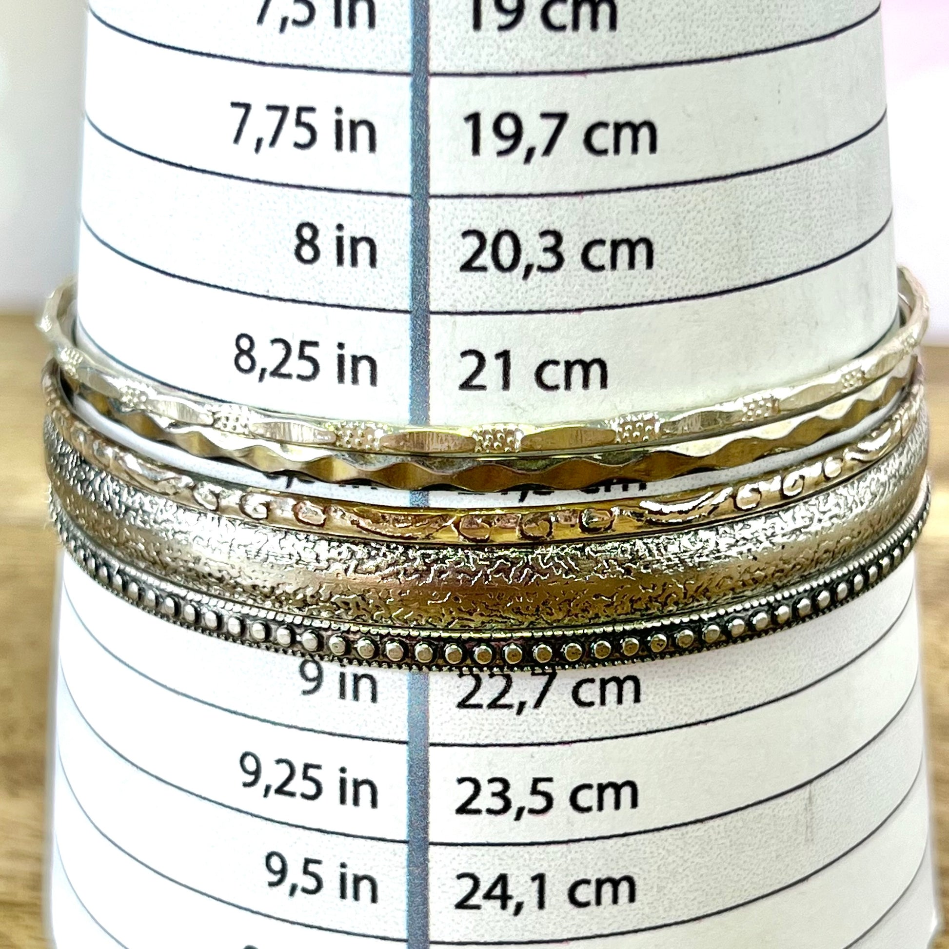 Beautiful custom bracelet stack of 13 bangles. We hand select each bracelet to make sure they blend together perfectly. Each stack we offer is unique and won't be replicated. This set is highly textured and silver tone.