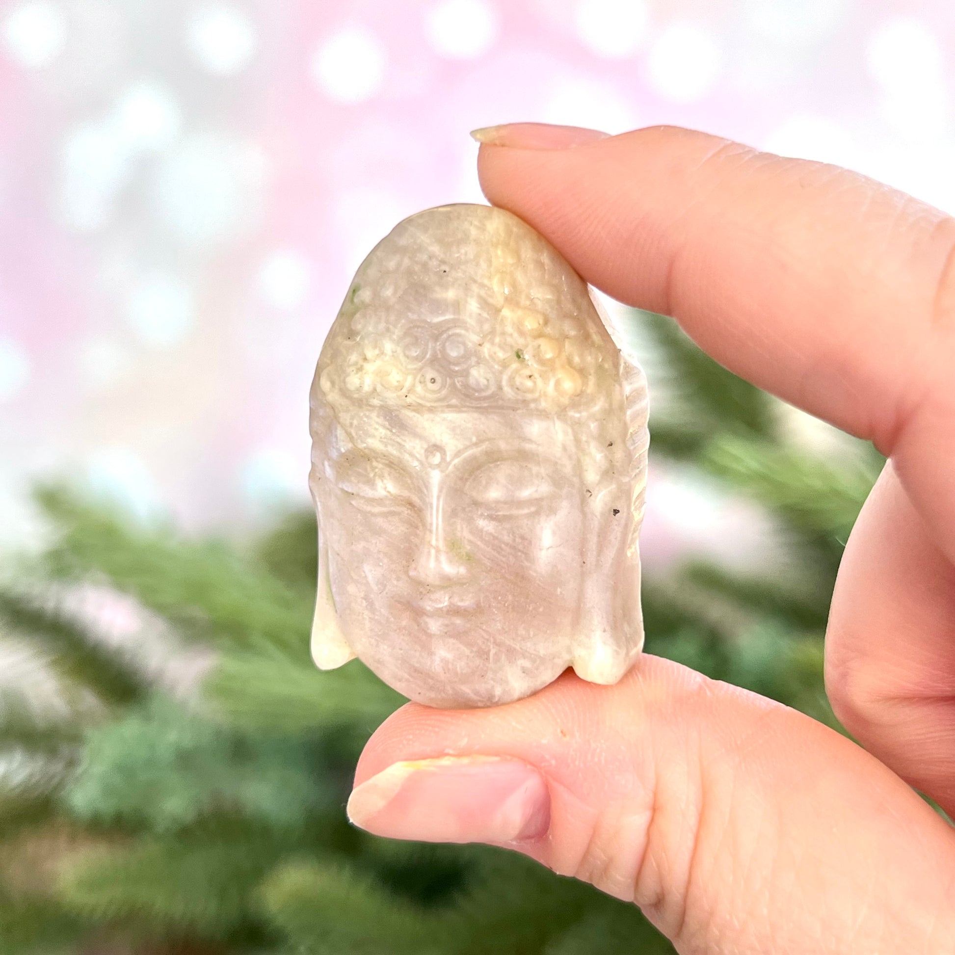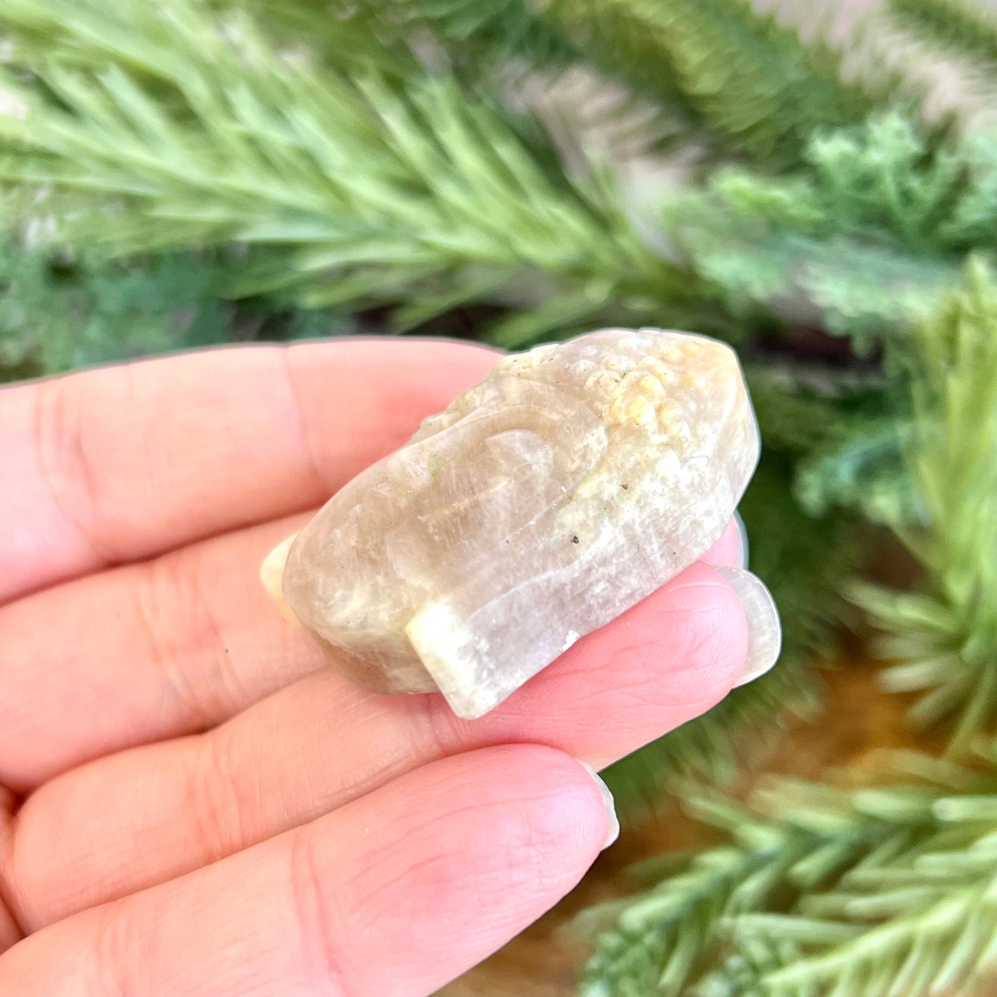 Enhance your spiritual practices with this beautiful Sunstone in Moonstone Buddha carved stone cabochon. This crystal combination is primarily white, and sometimes will have orange and/or blue flashes. You may see it called Belomorite, based on its geographical origin.