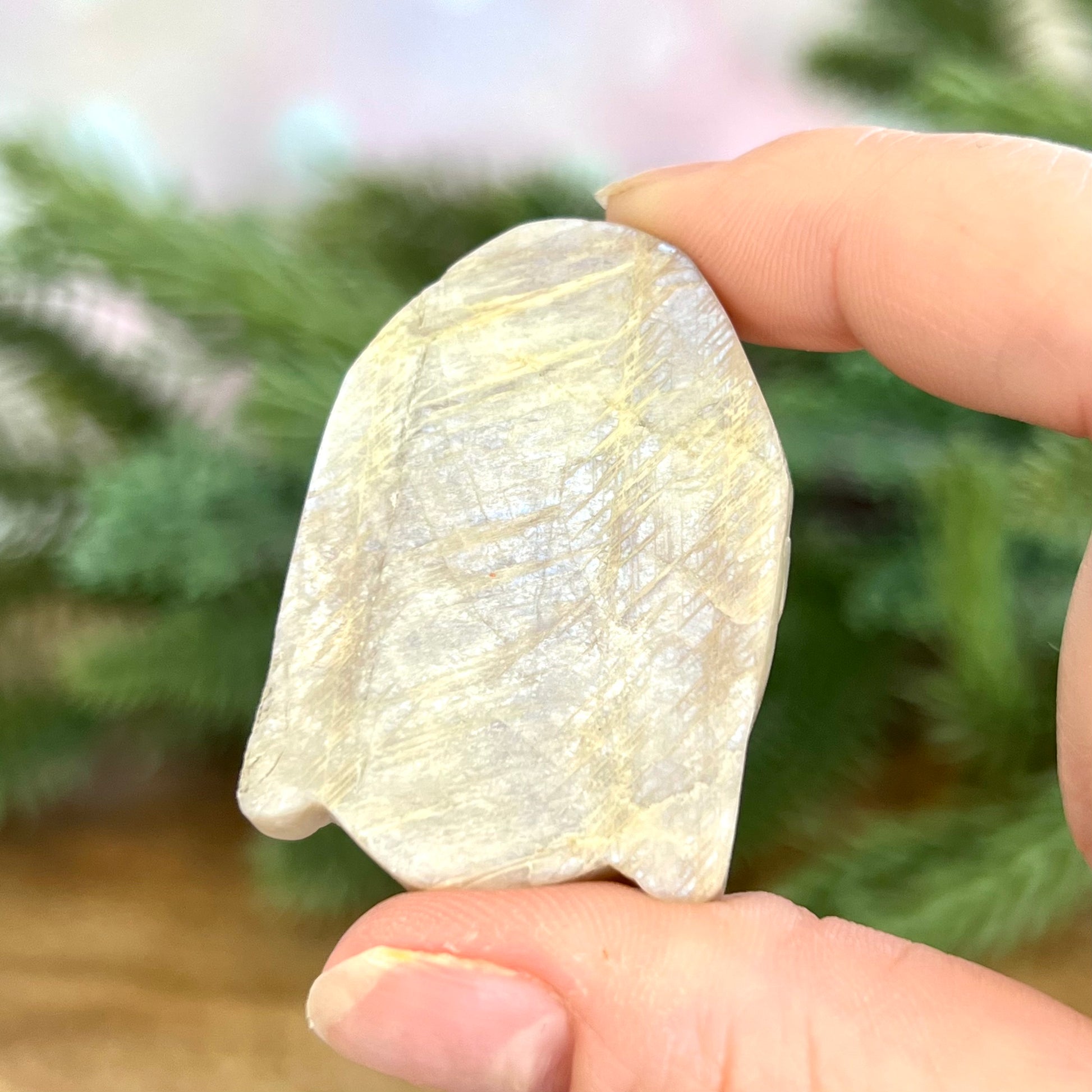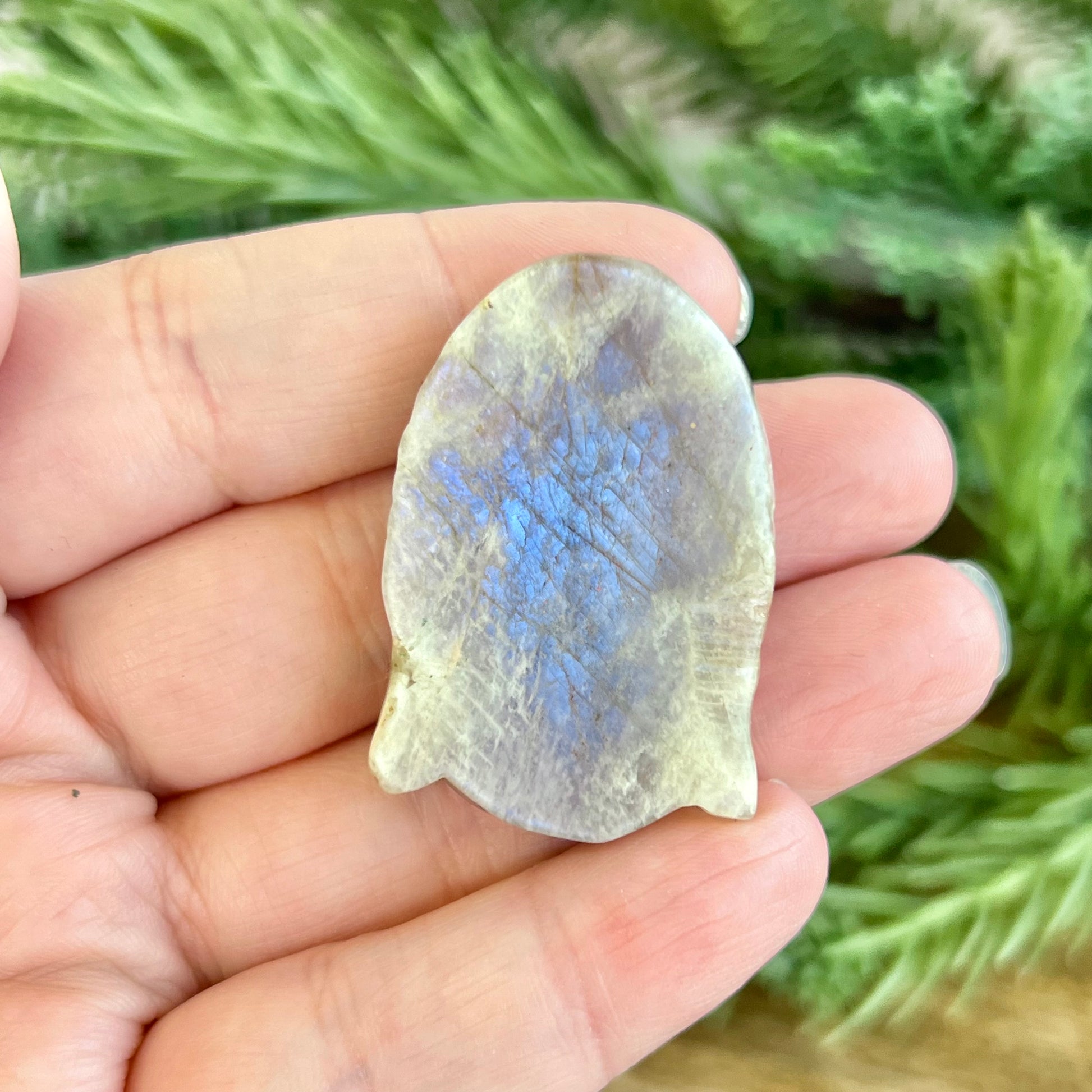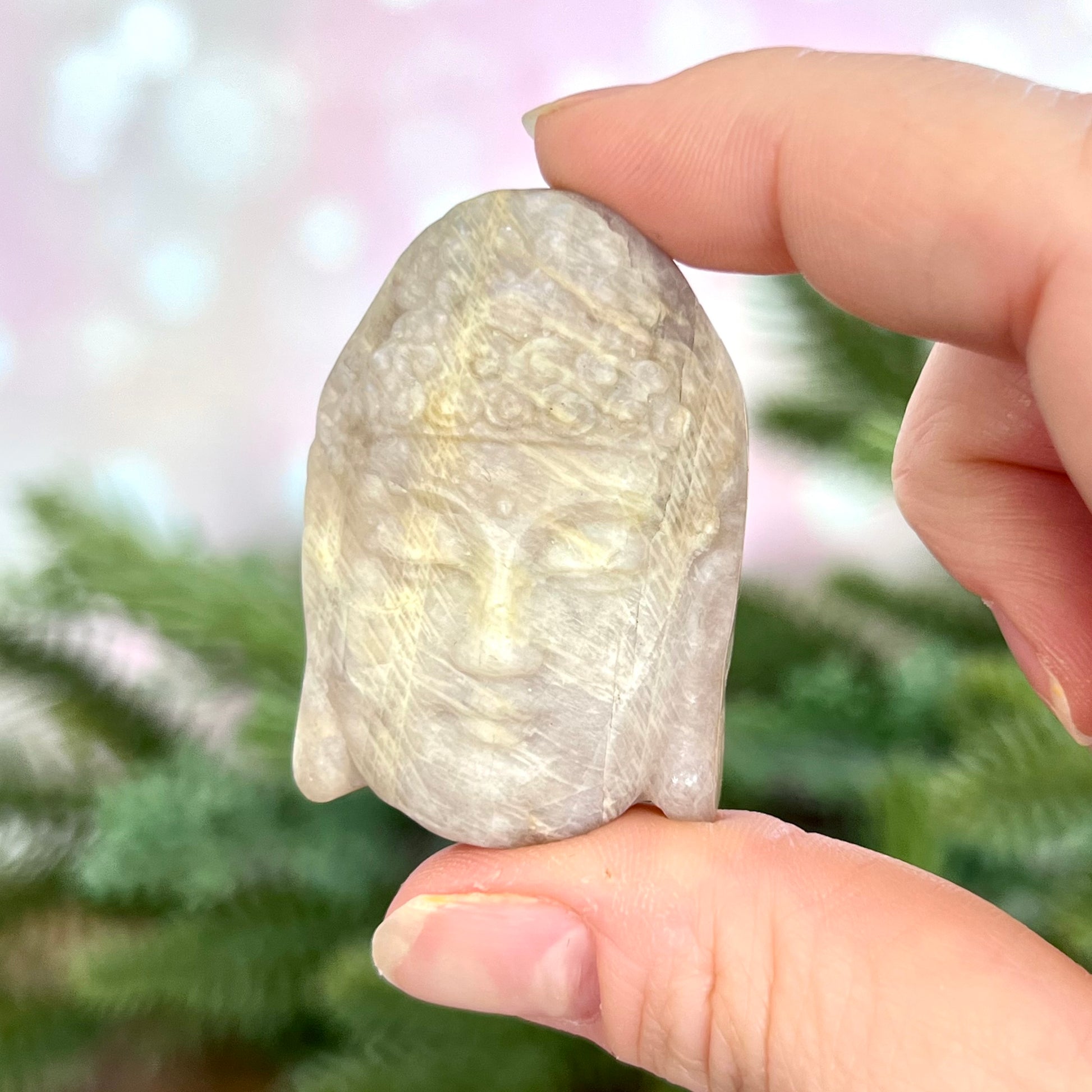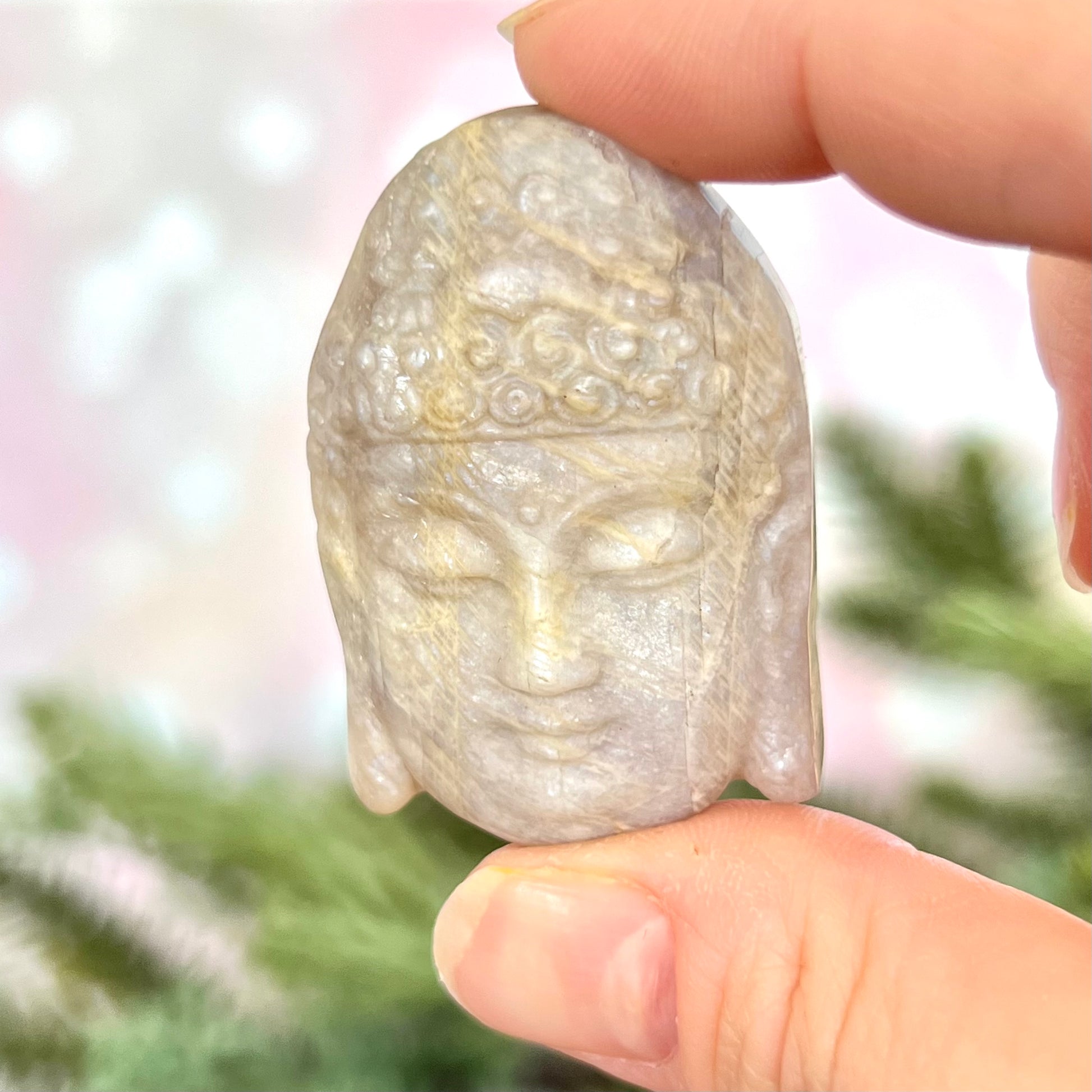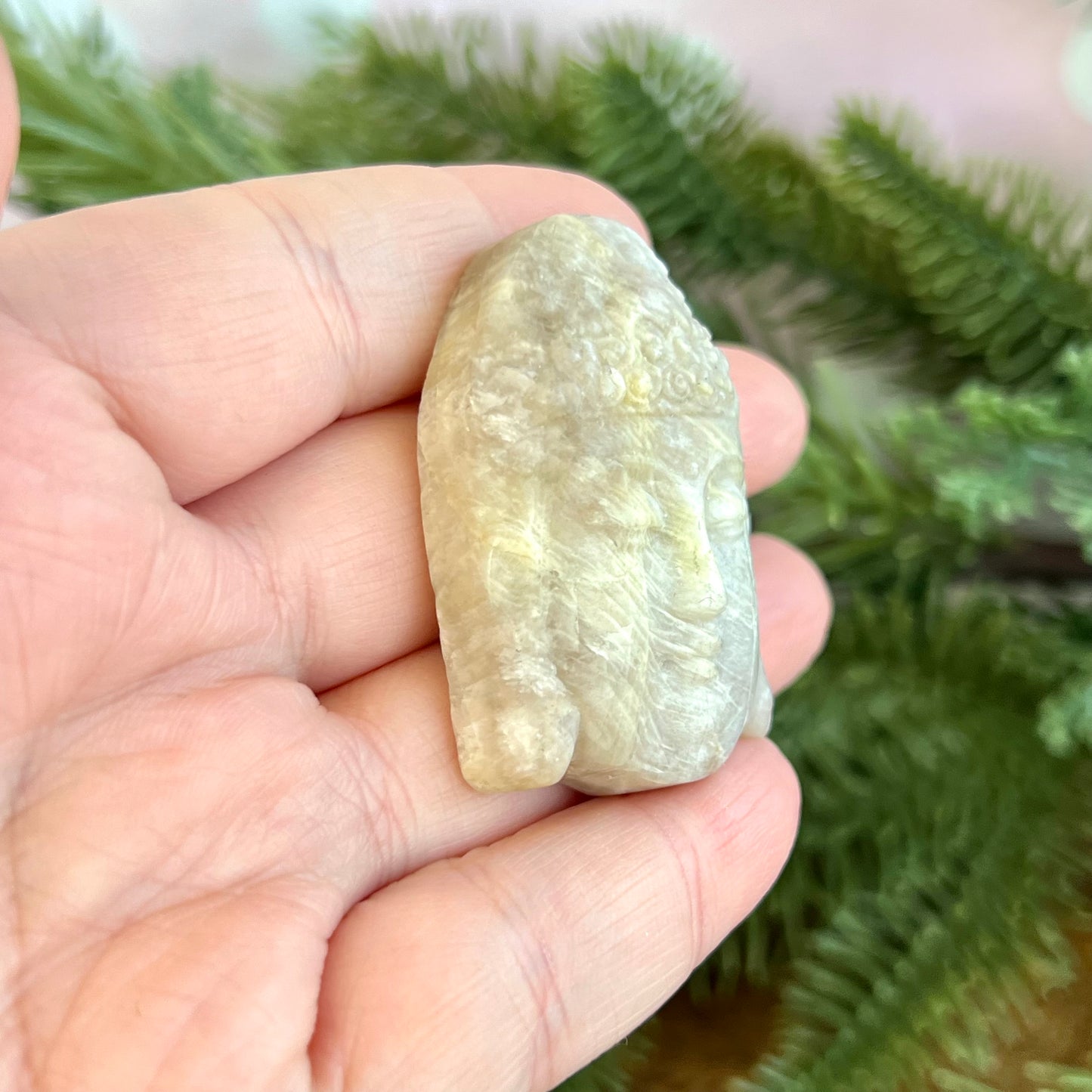Enhance your spiritual practices with this beautiful Sunstone in Moonstone Buddha carved stone cabochon. This crystal combination is primarily white, and sometimes will have orange and/or blue flashes. You may see it called Belomorite, based on its geographical origin.