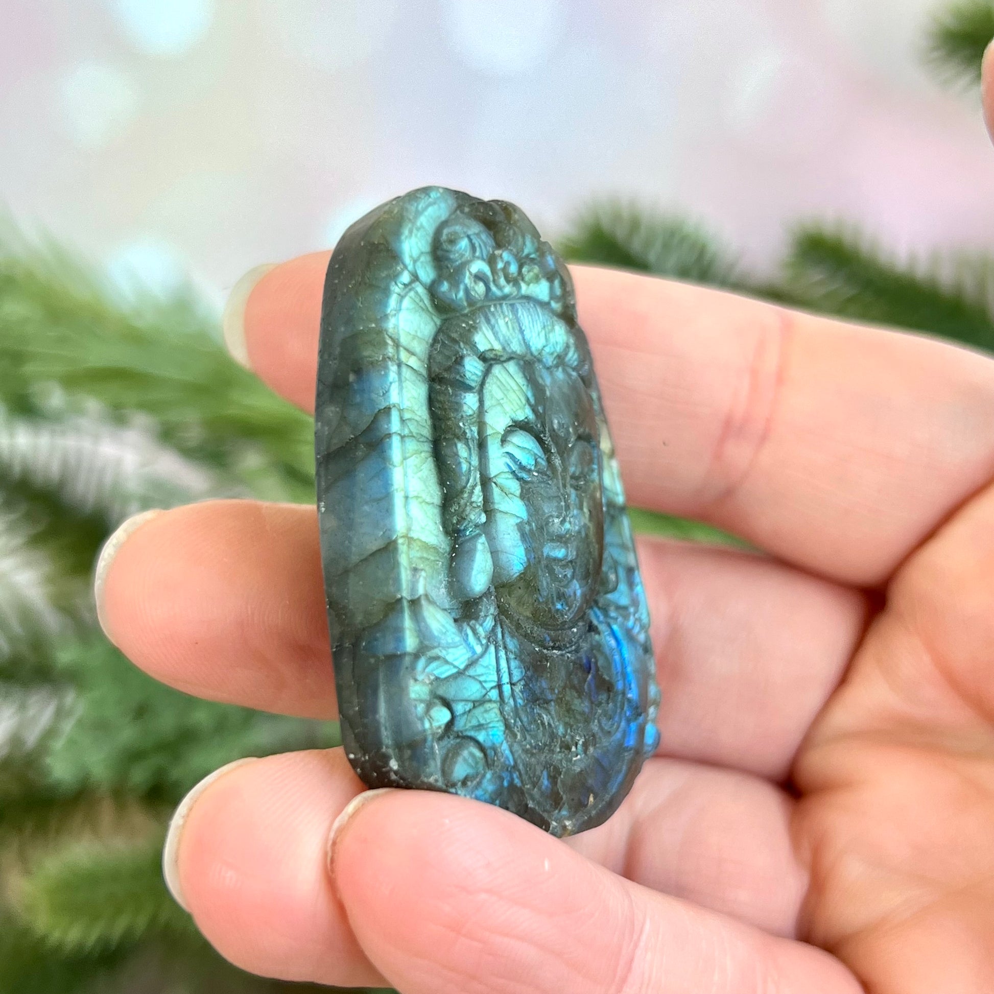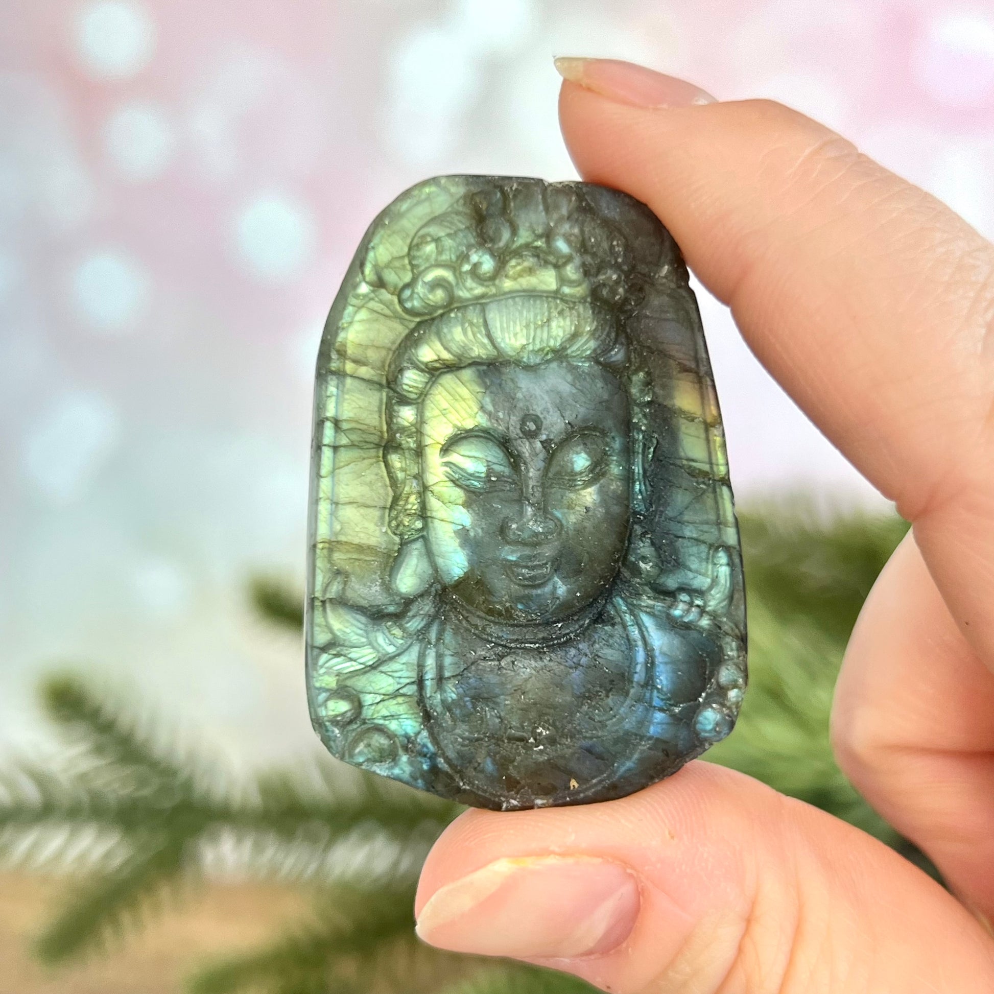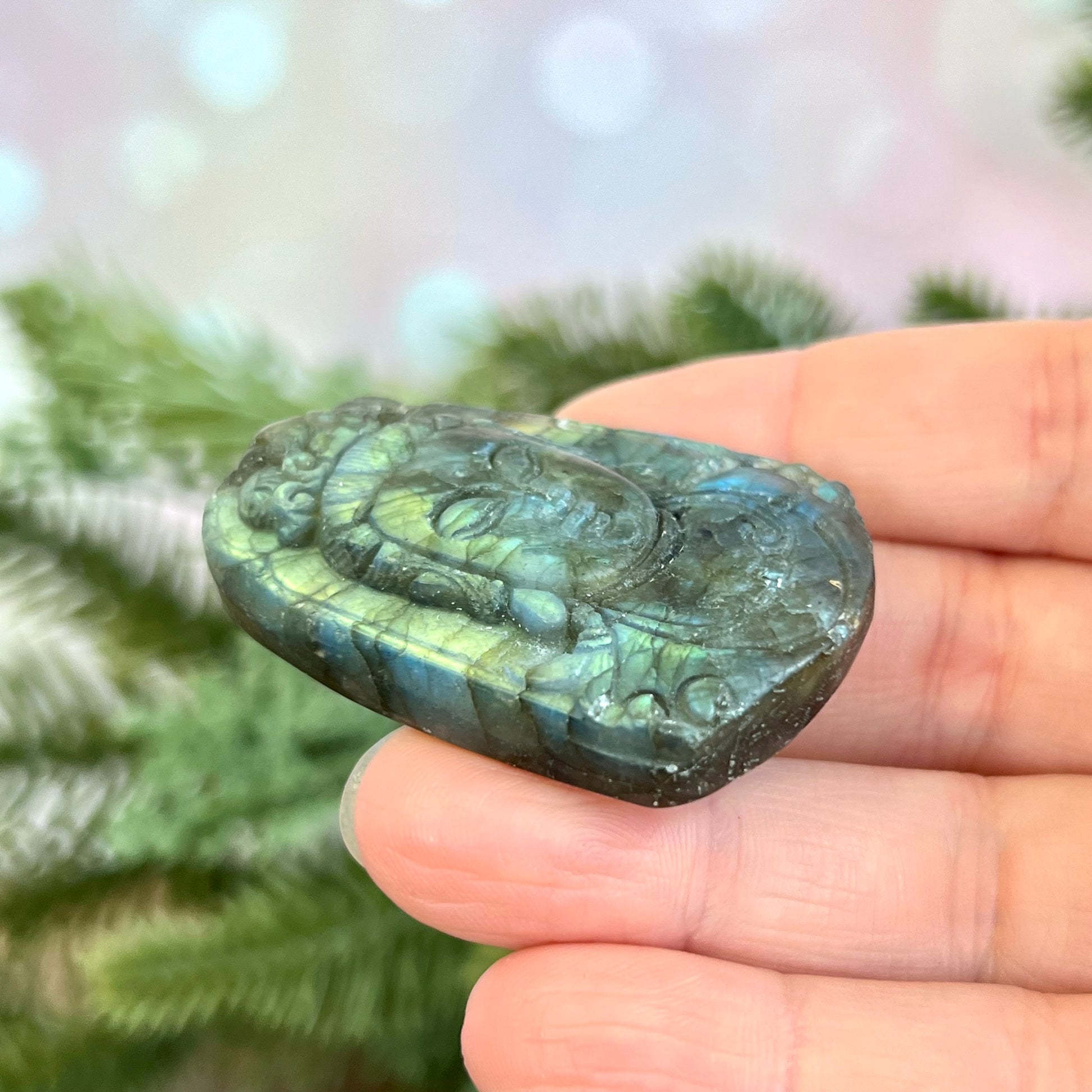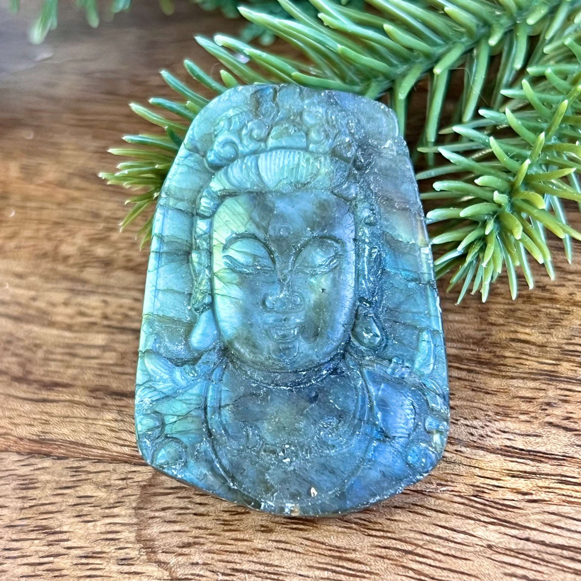 Enhance your spiritual practices with this beautiful Labradorite carved stone cabochon. This crystal has been intricately carved into Buddha's face, a perfect reminder to stay mindful.