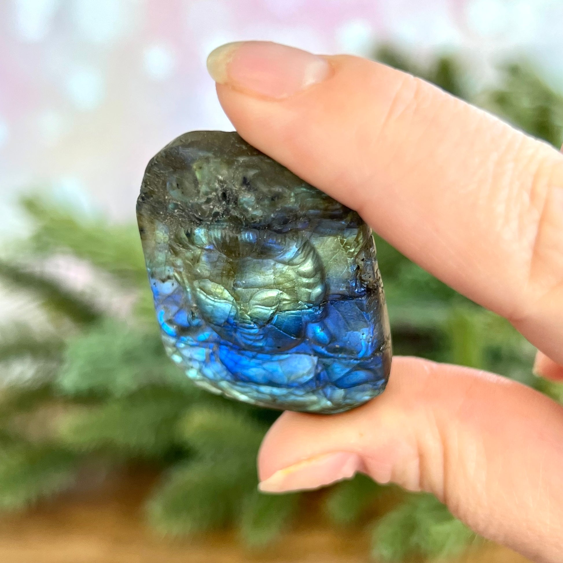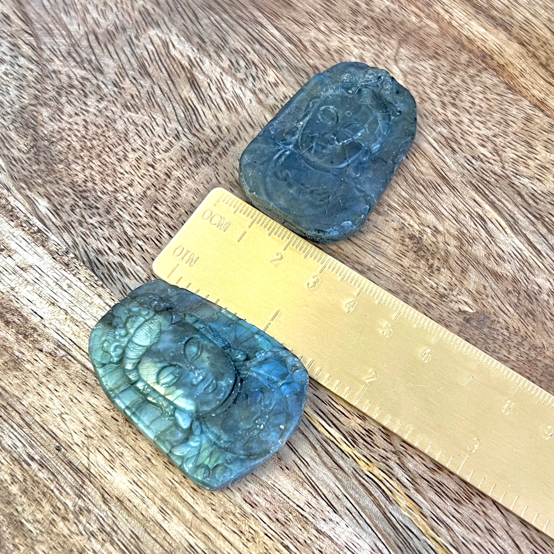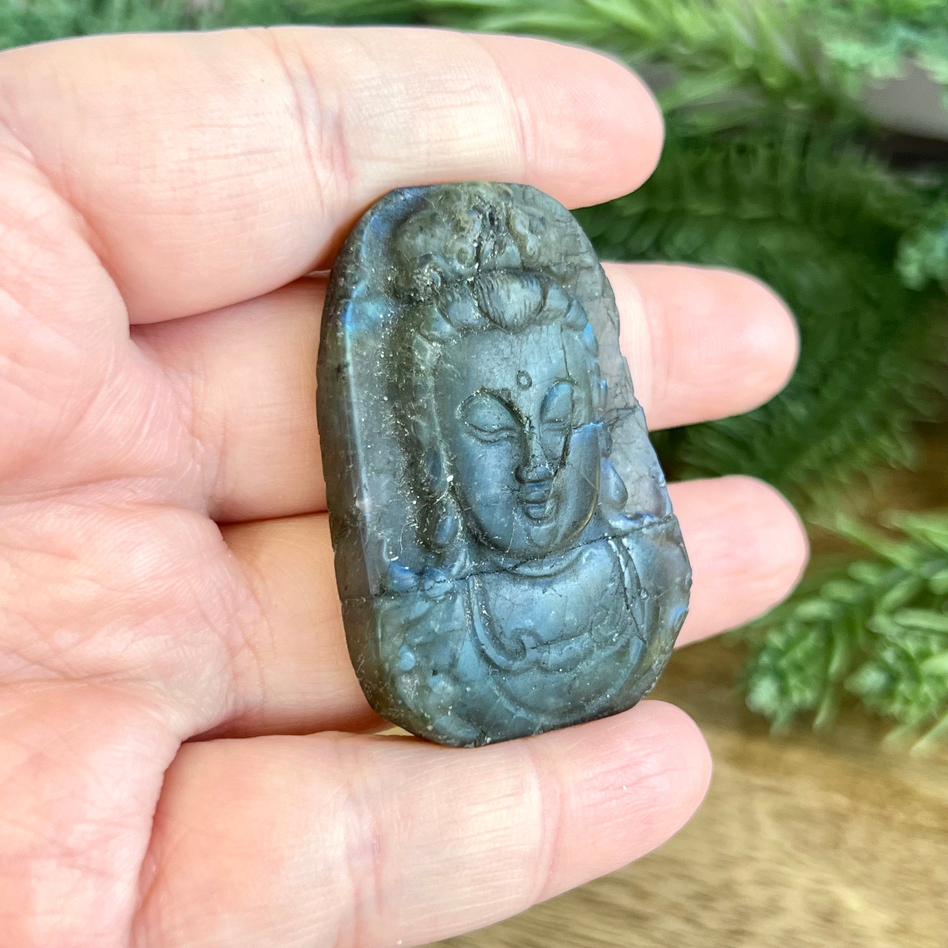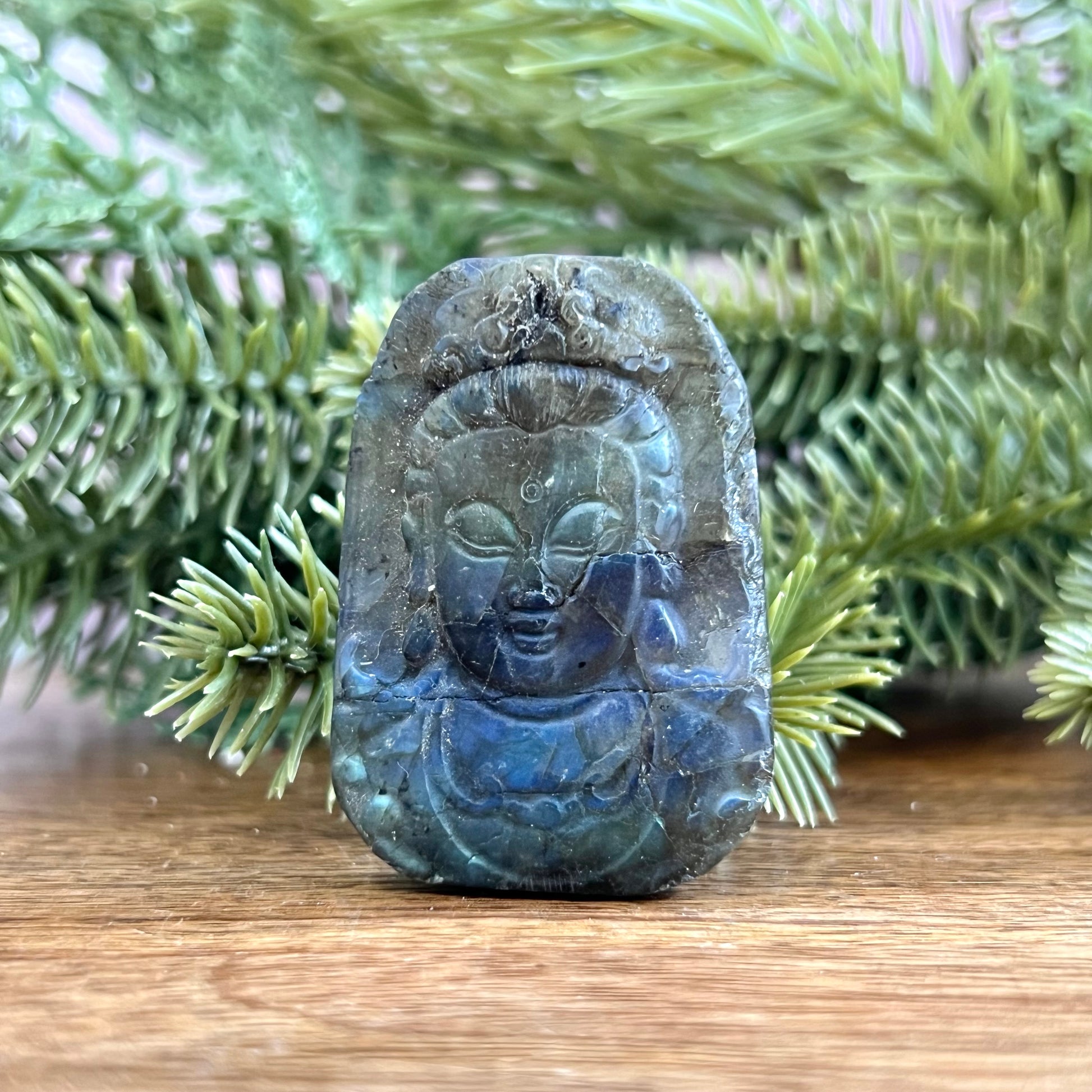Enhance your spiritual practices with this beautiful Labradorite carved stone cabochon. This crystal has been intricately carved into Buddha's face, a perfect reminder to stay mindful.