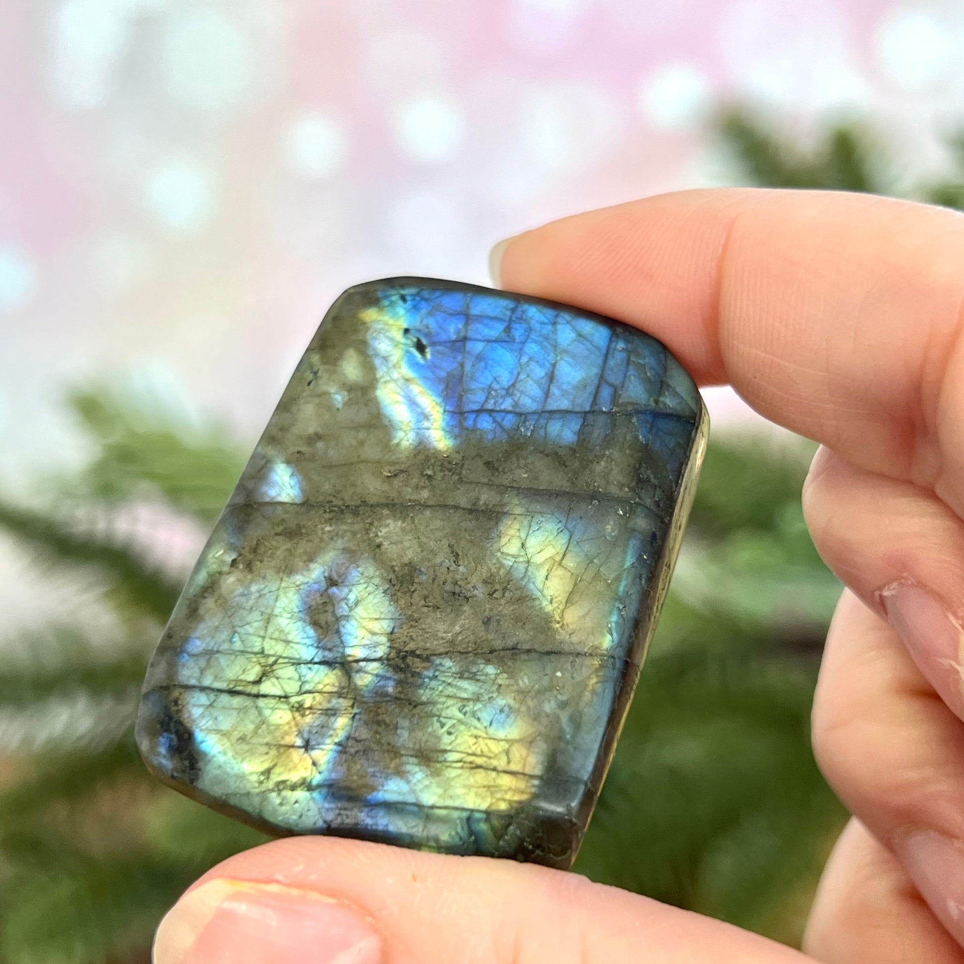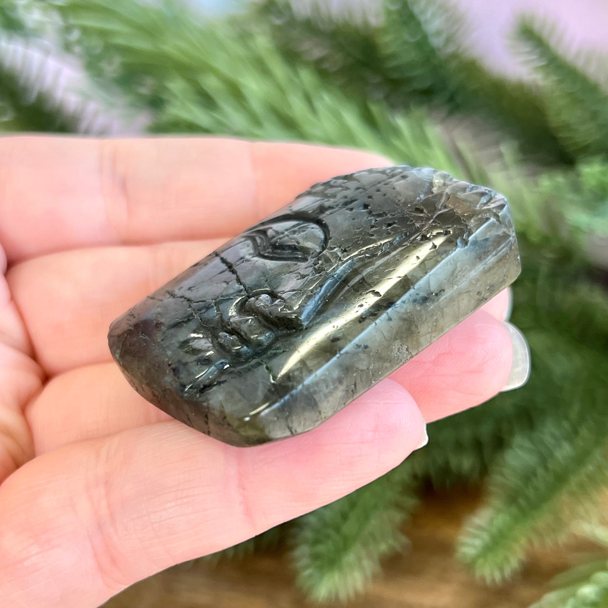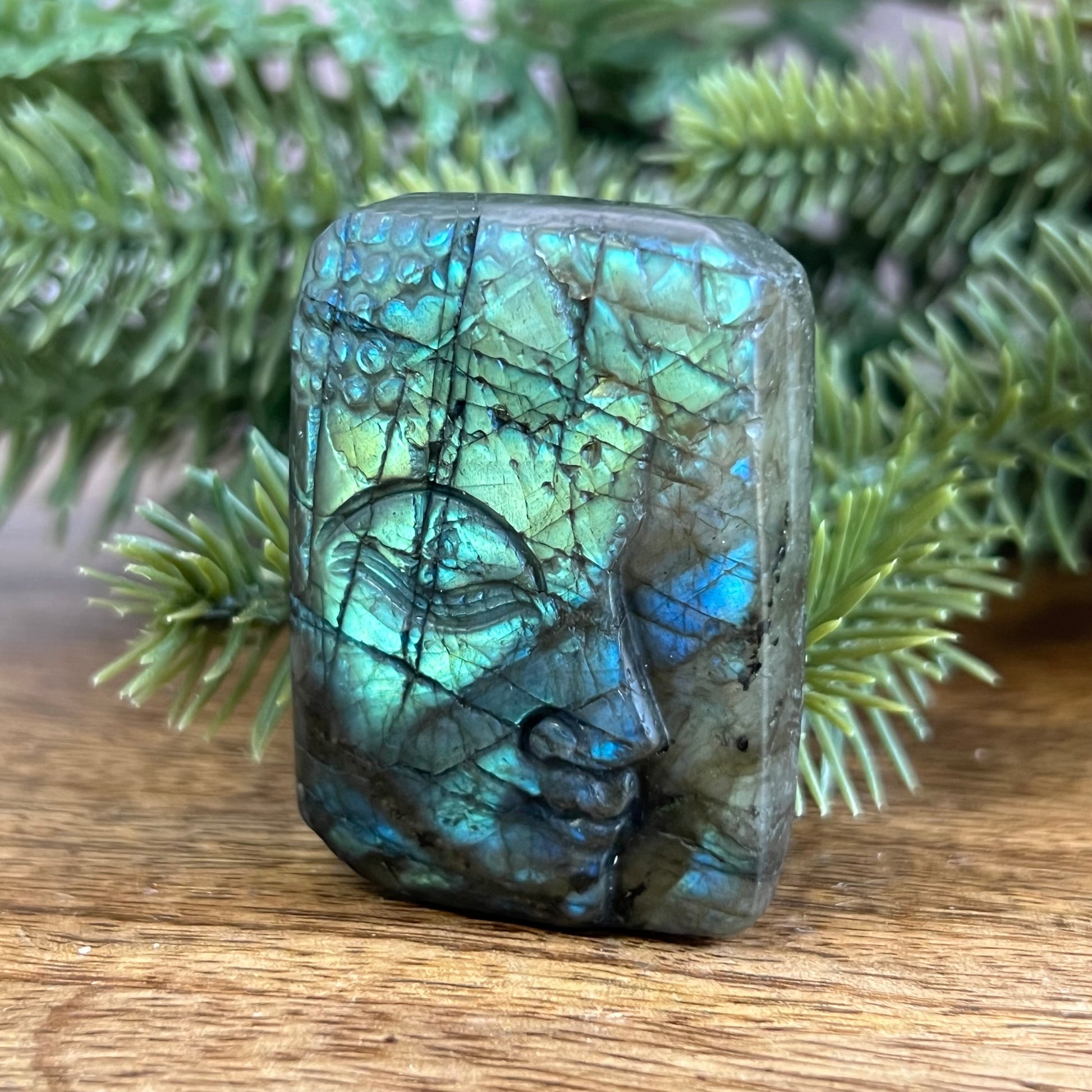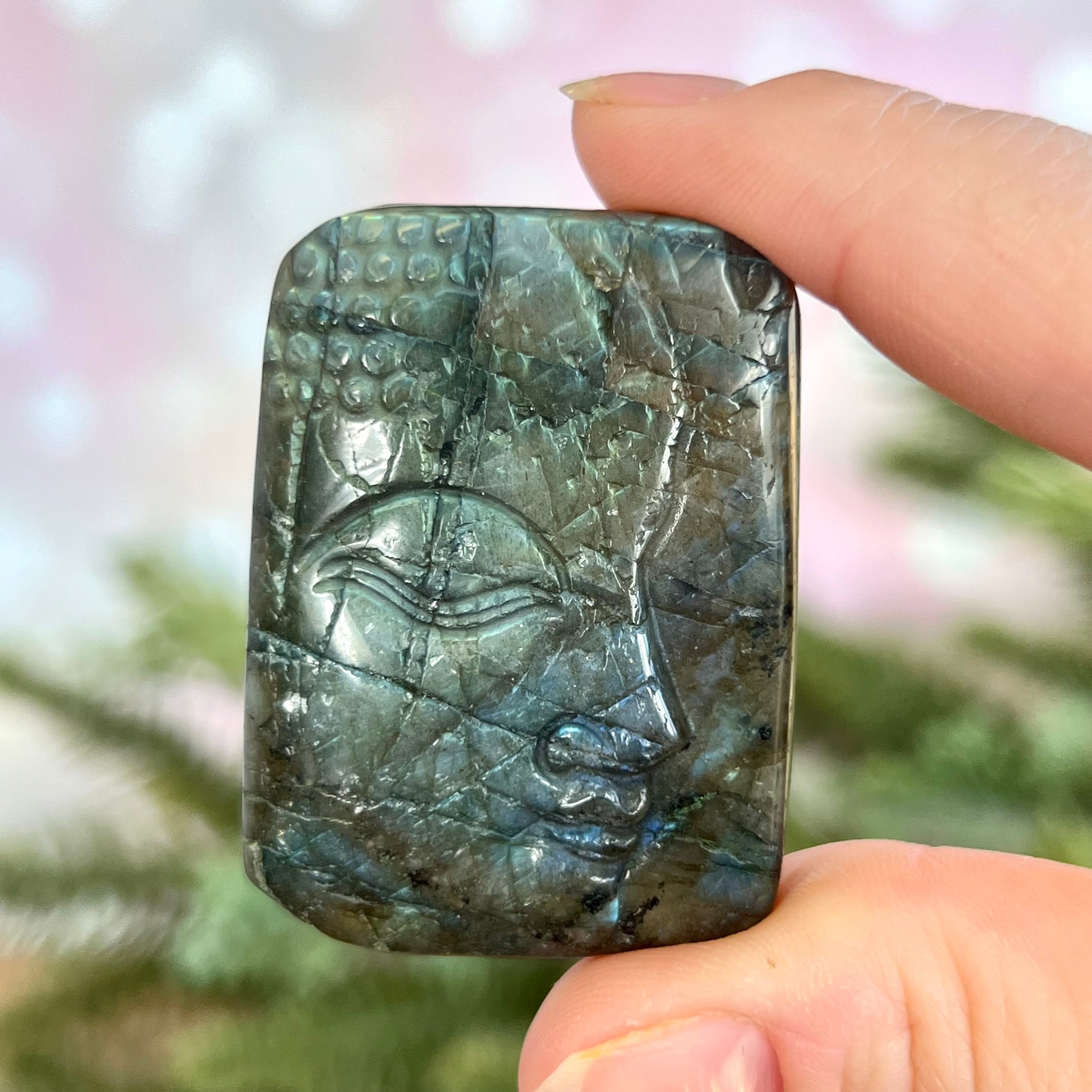 Enhance your spiritual practices with this beautiful flashy Labradorite carved stone cabochon. This crystal has been intricately carved into an image of the Buddha. Perfect as a Mindfulness or meditation aide.