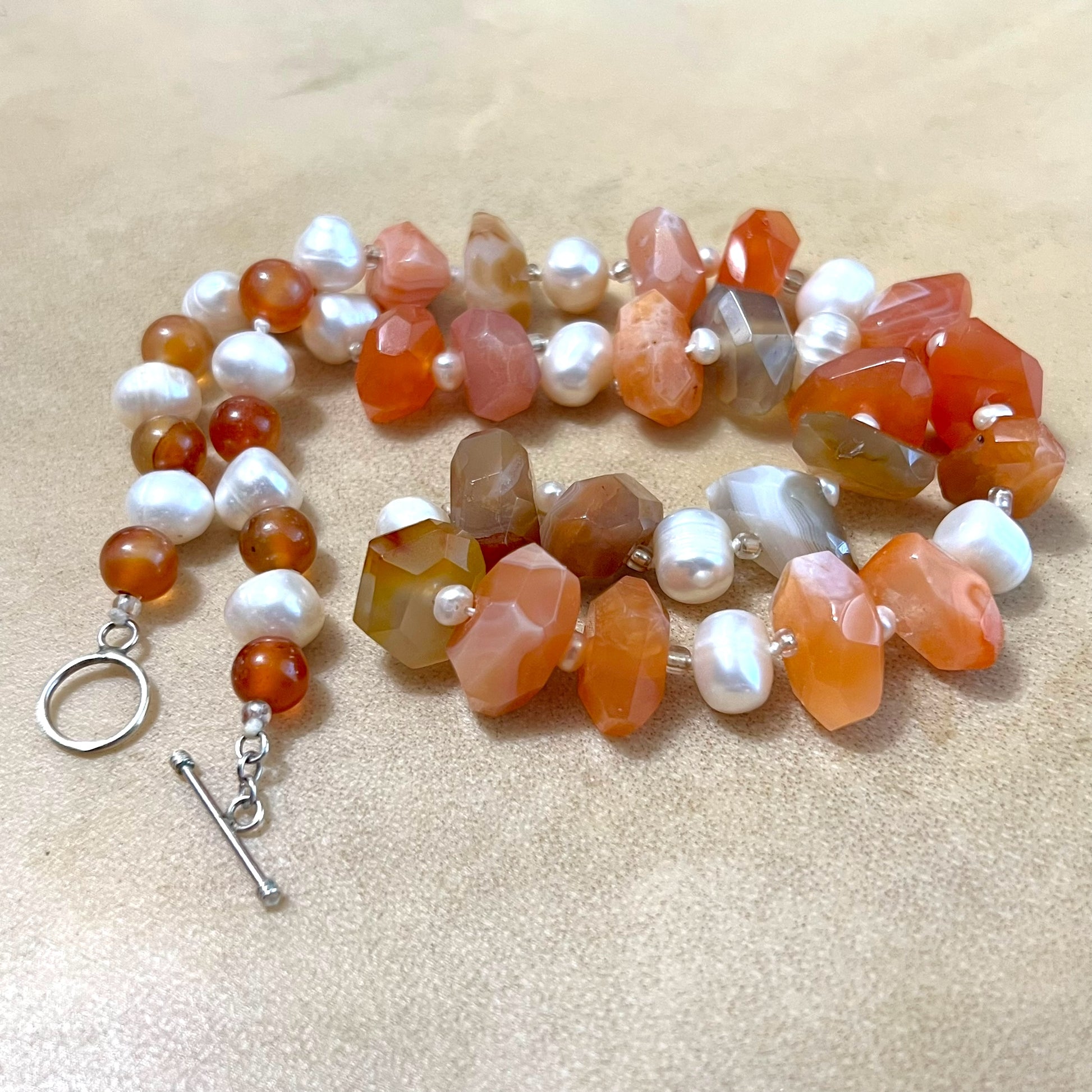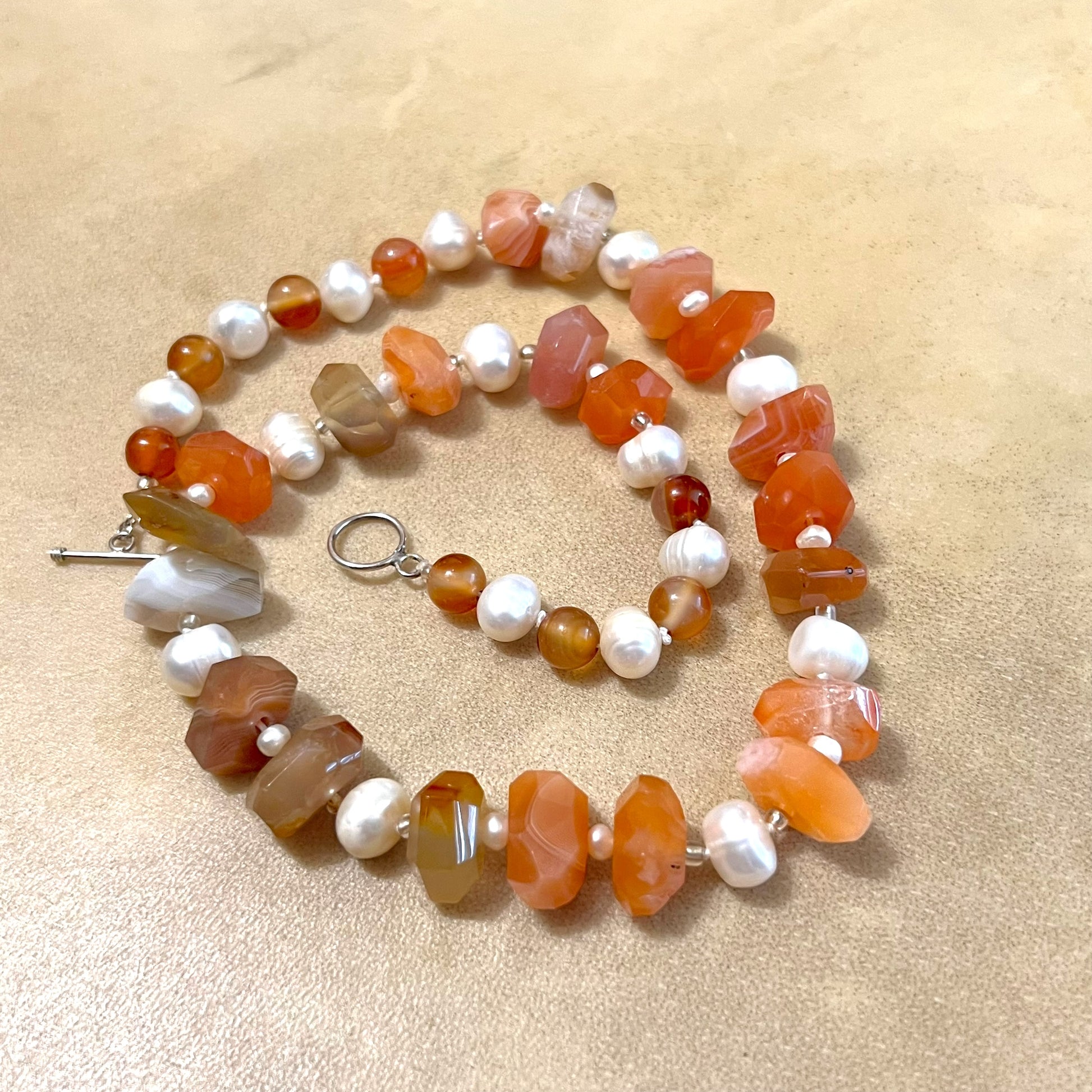 Express yourself with this unique vintage necklace! Made from beautiful alternating faceted carnelian gemstones with genuine pearls and agate accents. Both classic and striking.