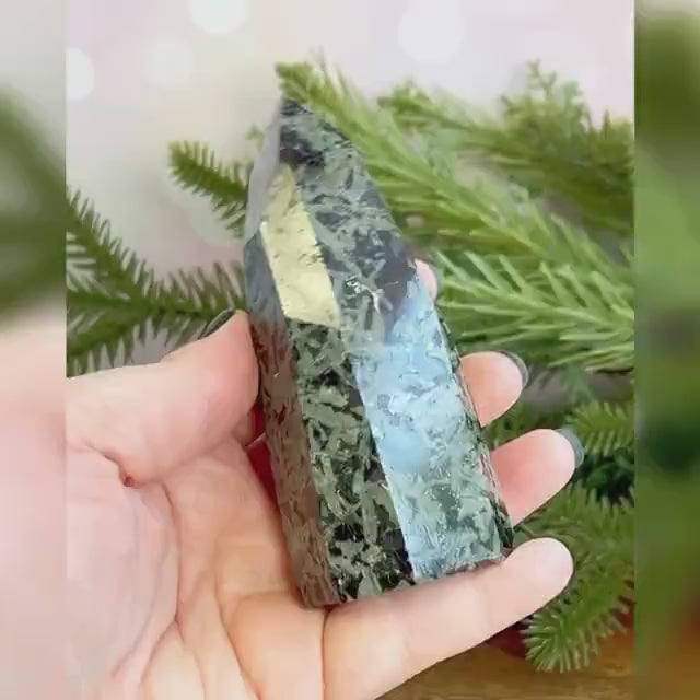 Enhance your spiritual practices with this beautiful Chinese Writing Stone crystal Tower. This Stone is actually a type of igneous rock containing Feldspar in Basalt. The Feldspar family includes stones like Labradorite and Moonstone, and Basalt is a form of cooled lava. The cool blade like texture in this crystal is called "Porphyry". A really unique piece!