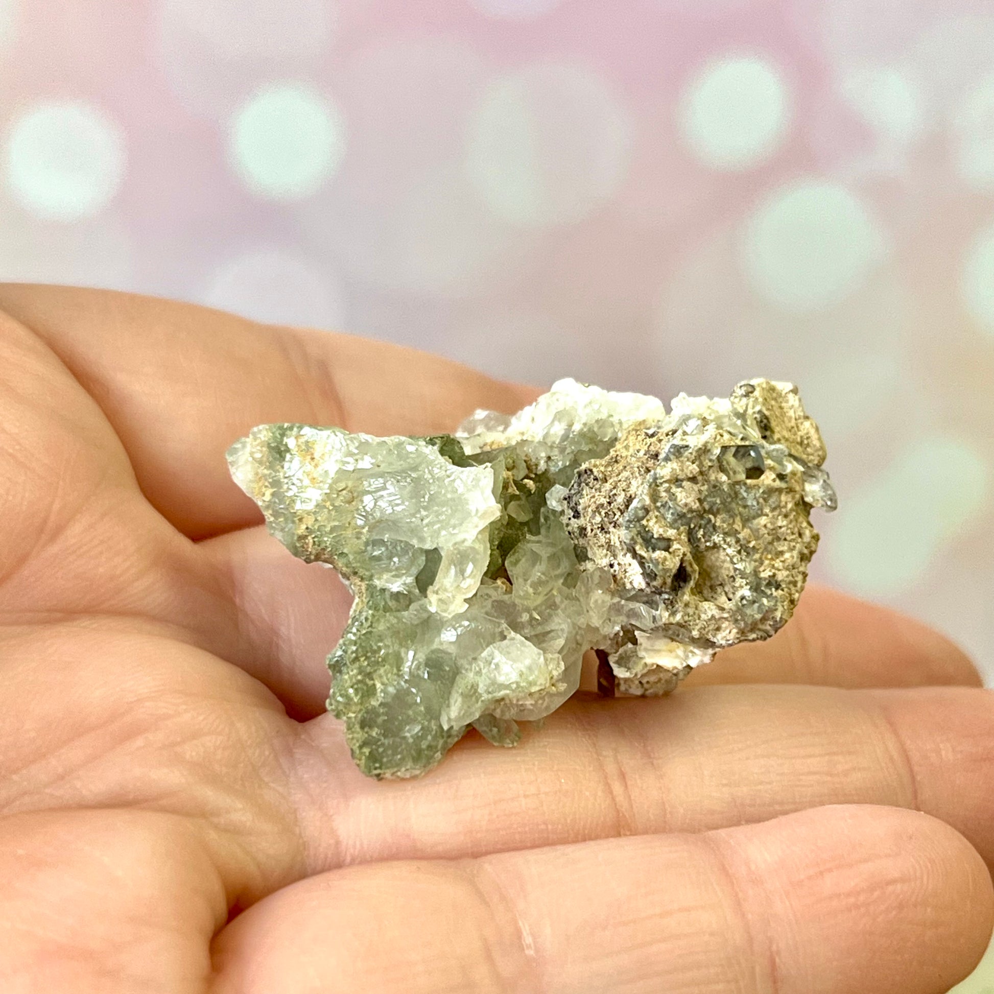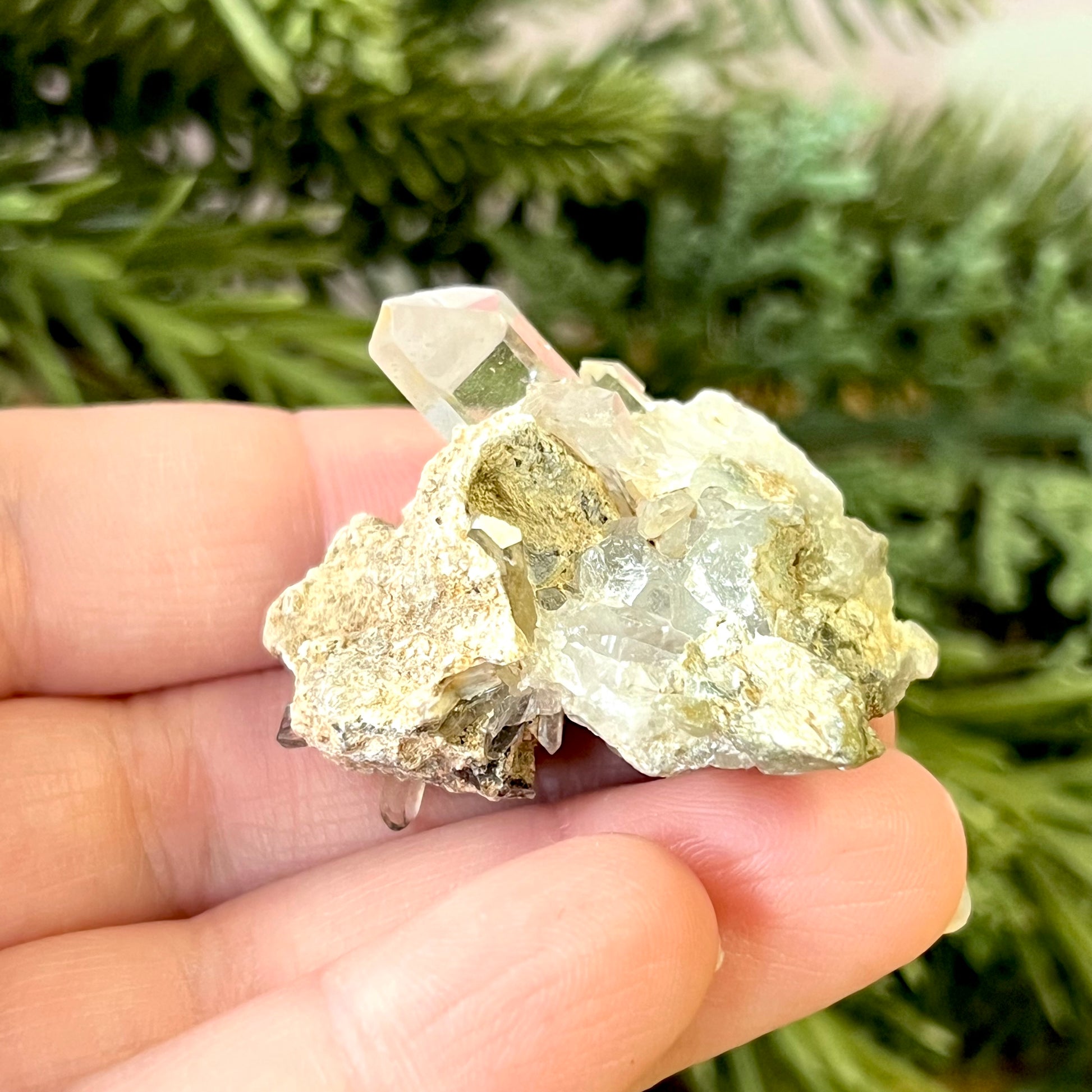 Enhance your spiritual practices with this beautiful Chlorite Quartz natural cluster. This crystal features loamy green inclusions inside the Quartz, giving it a very earthy vibe.