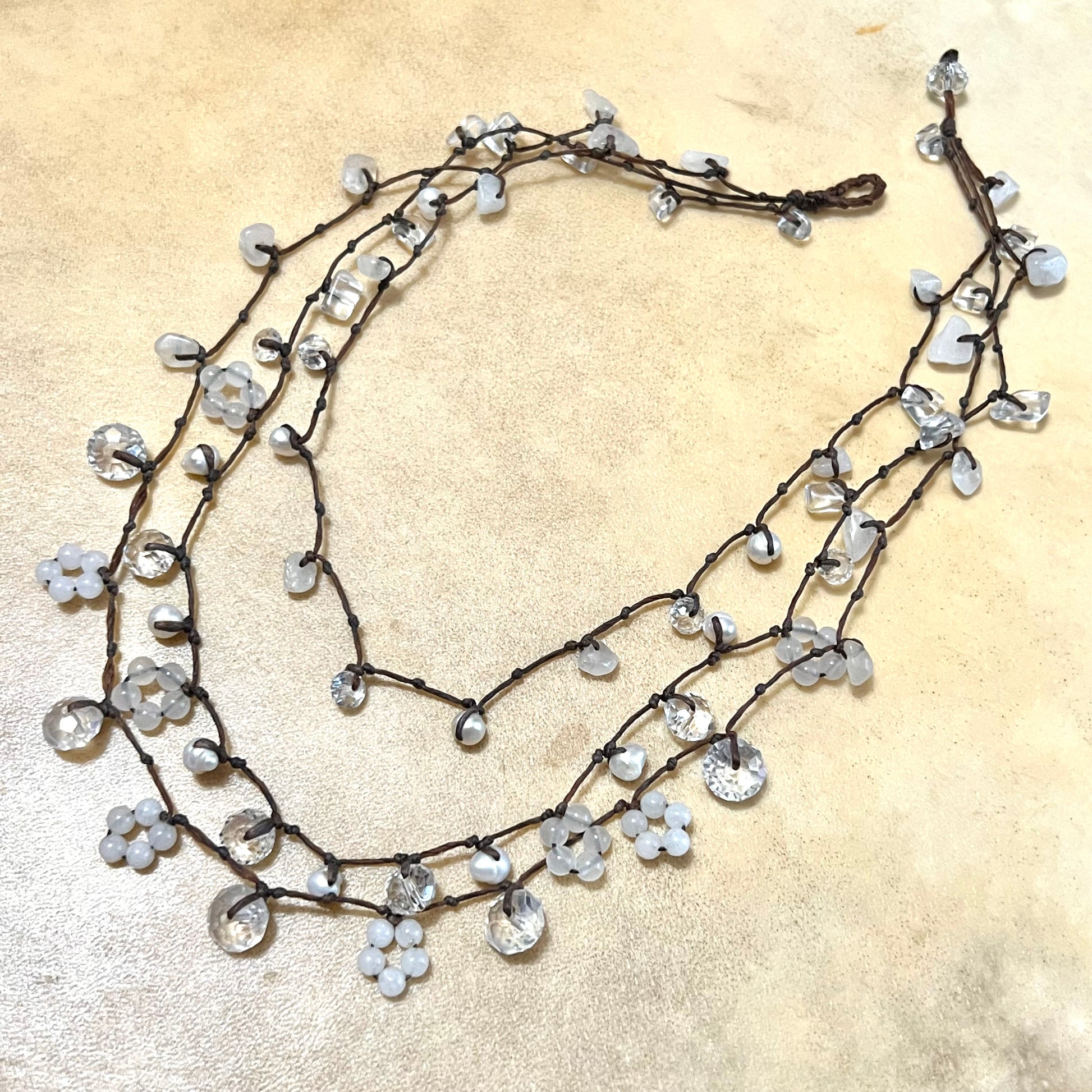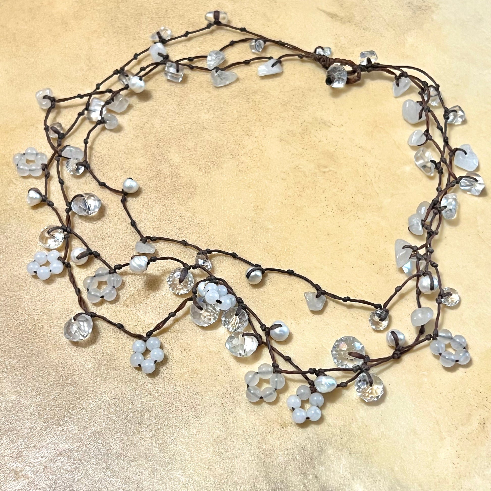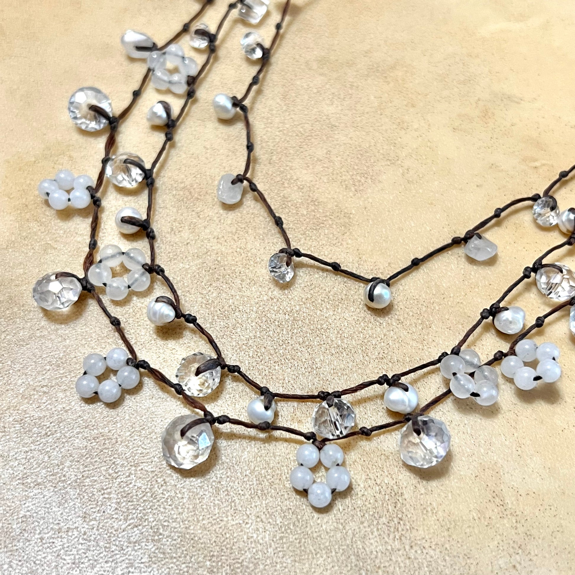 Beautiful layered necklace featuring hand knotted clear quartz and cultured pearl beads with a flower theme. Short, choker style with three strands, perfect for layering!