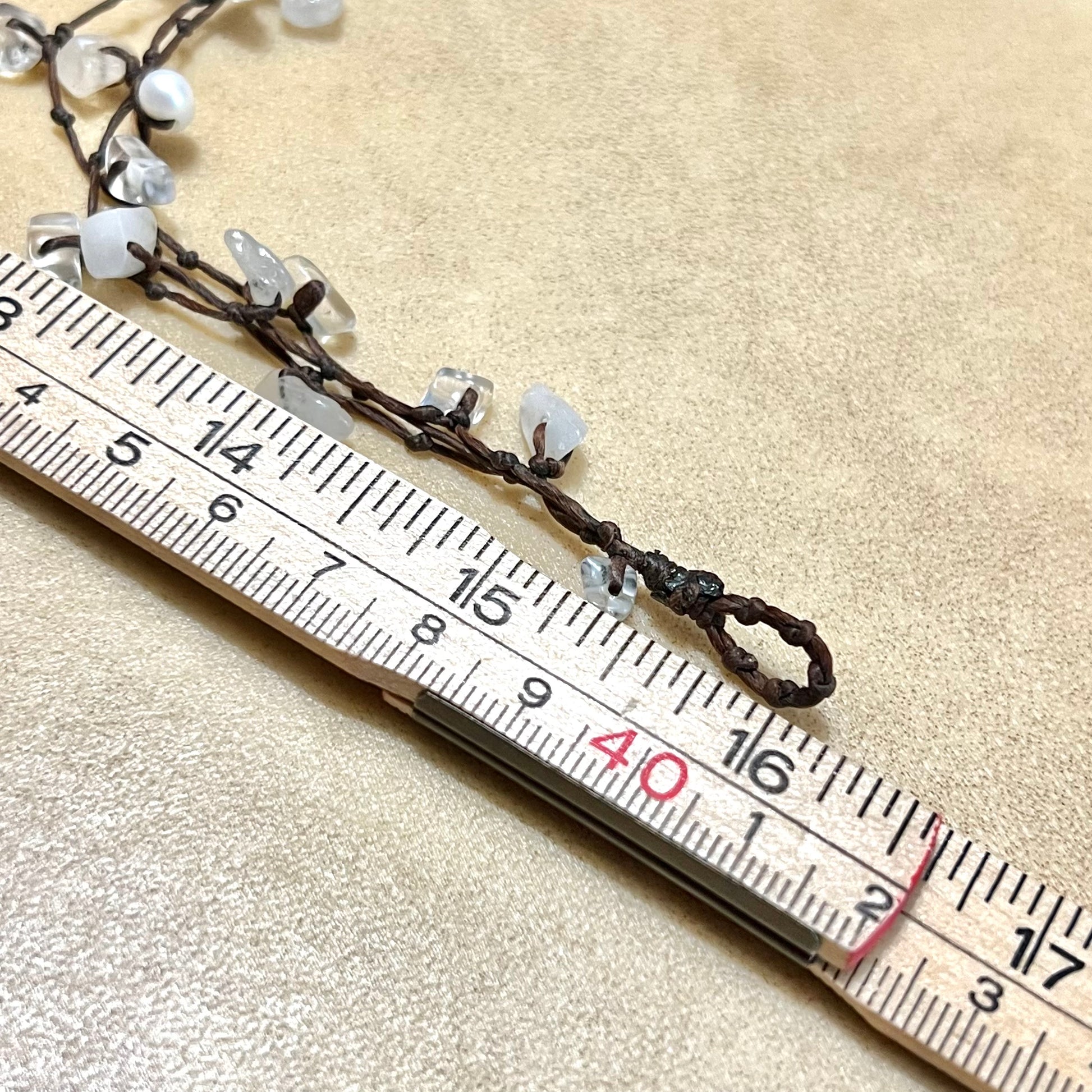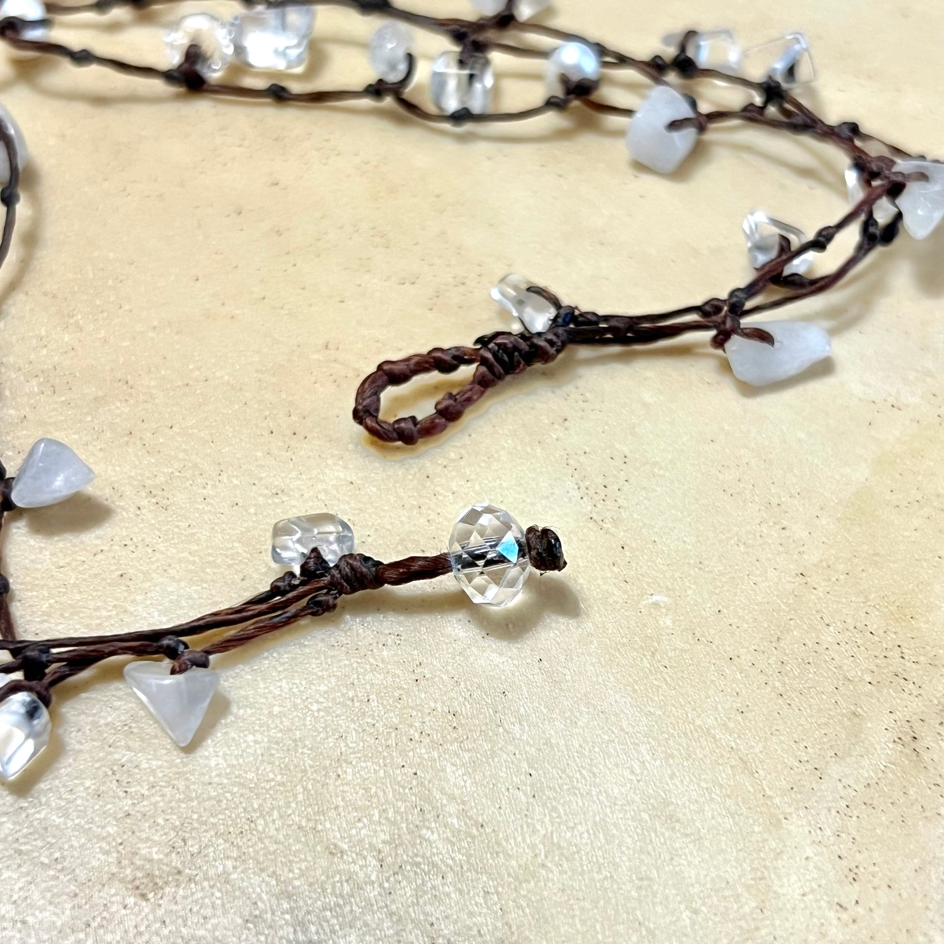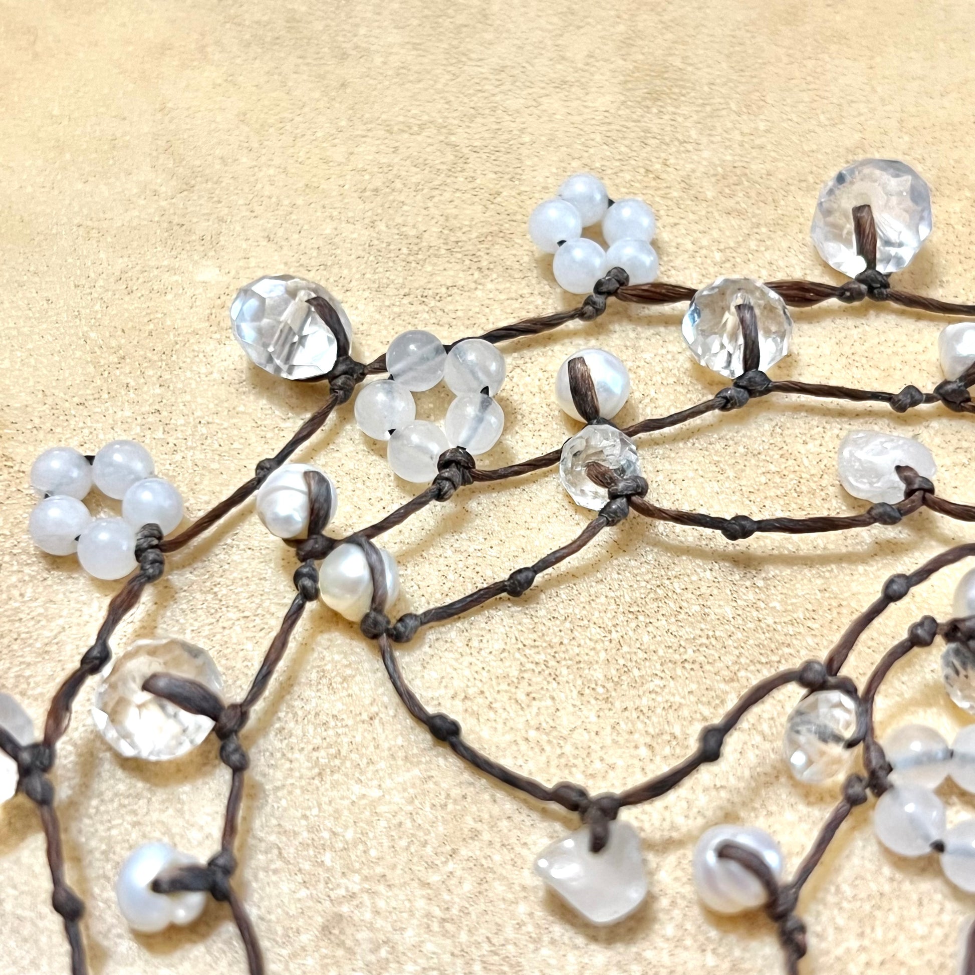 Beautiful layered necklace featuring hand knotted clear quartz and cultured pearl beads with a flower theme. Short, choker style with three strands, perfect for layering!